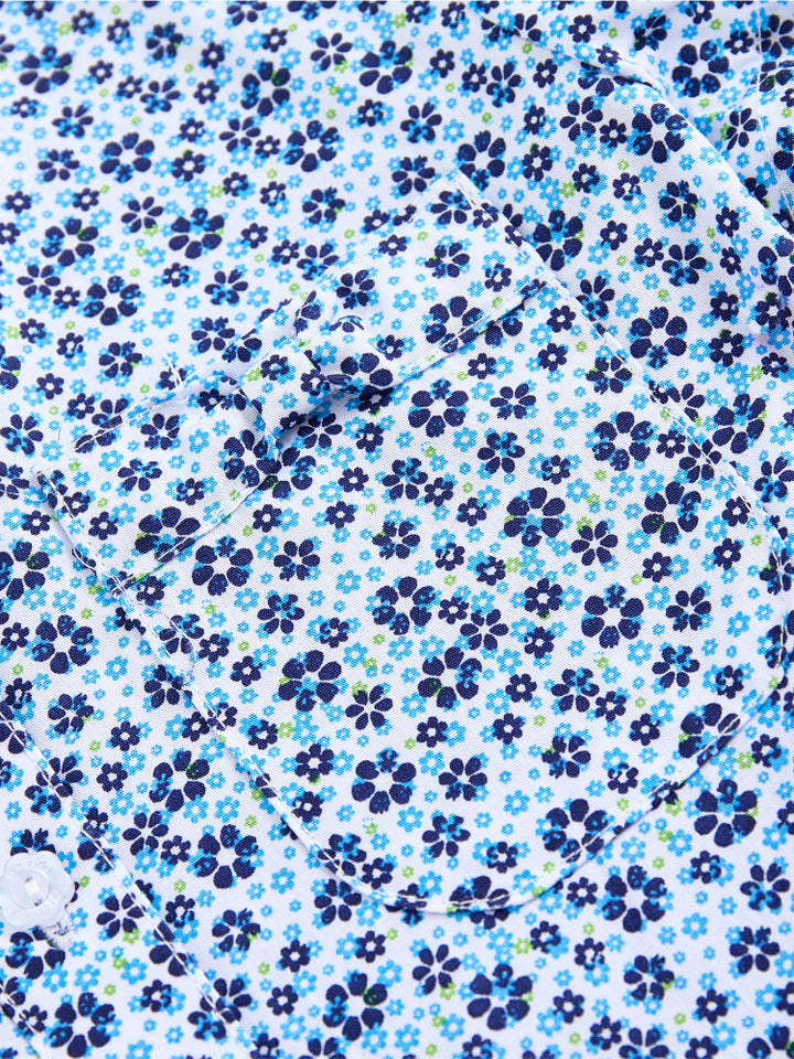This charming short sleeve shirt dress features a vibrant floral print pattern and classic collar. Front buttons provide easy closure, making it a perfect blend of casual elegance and comfort.