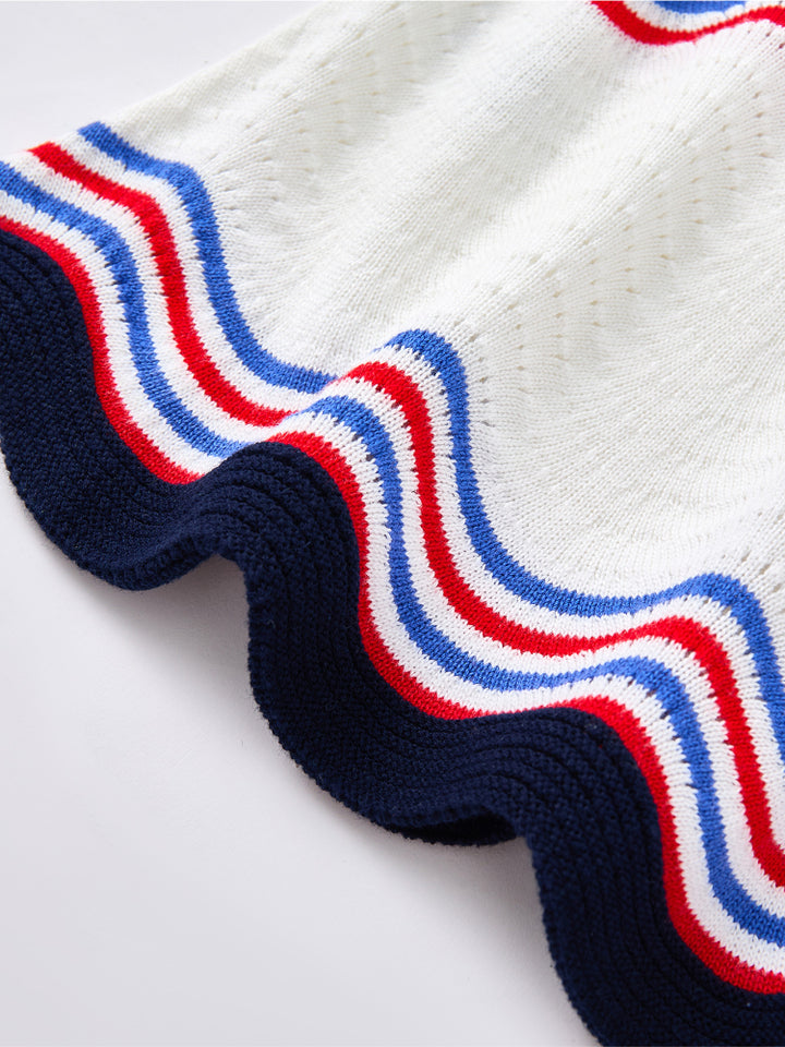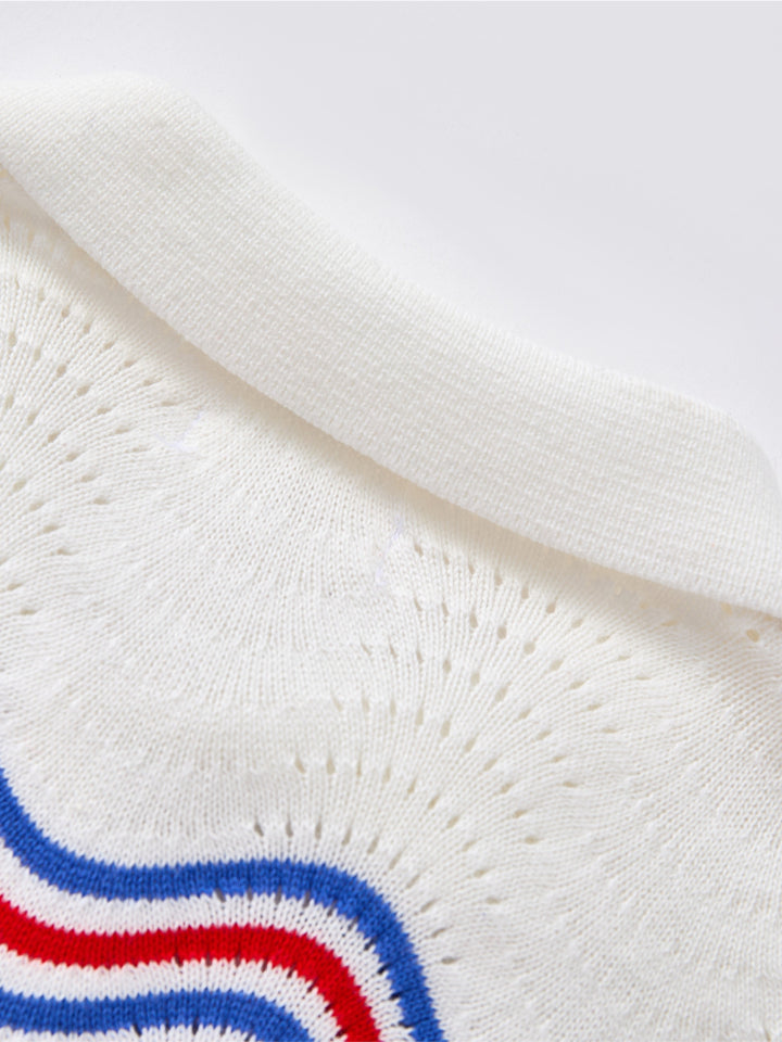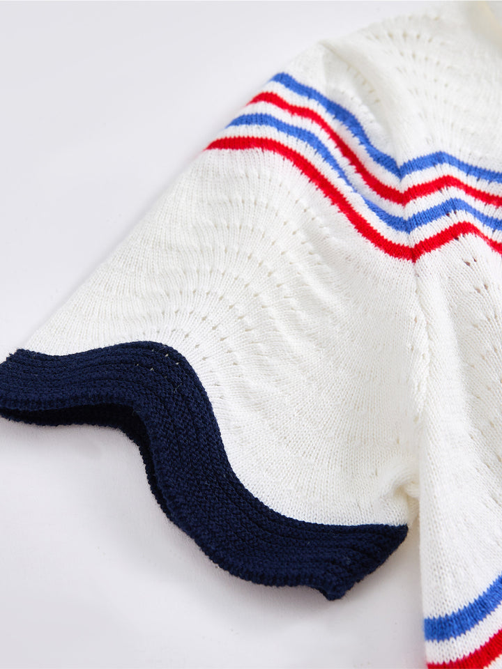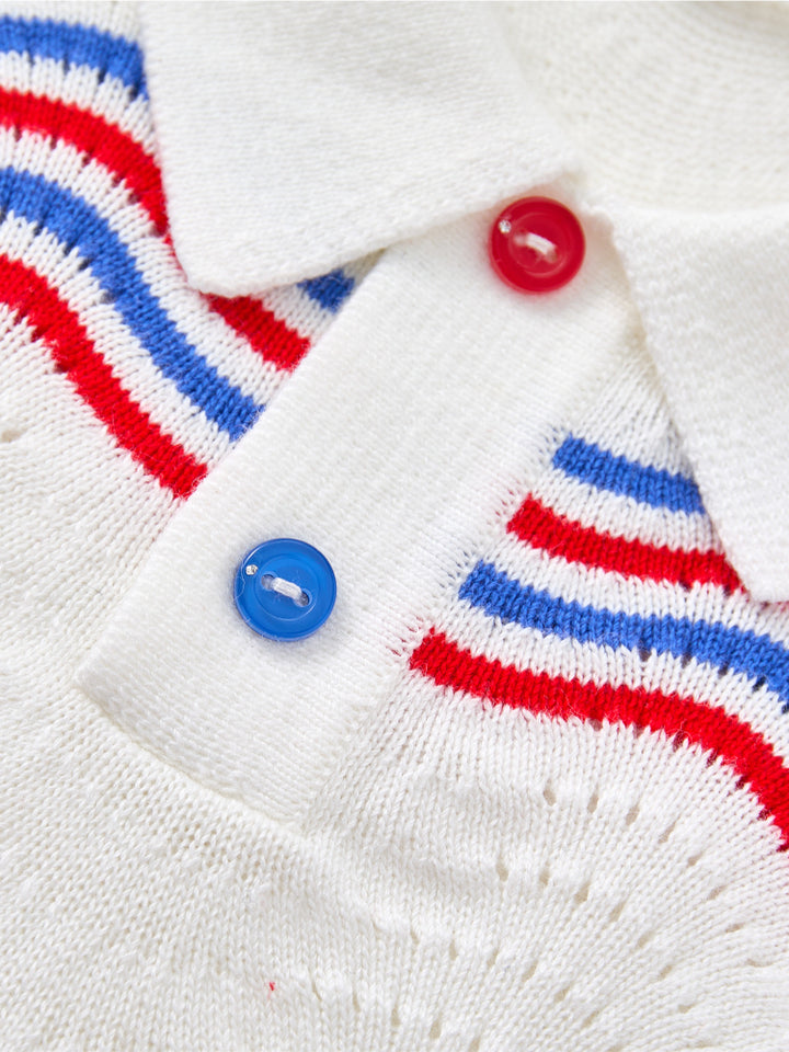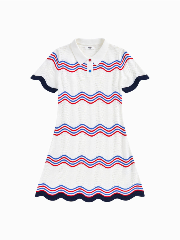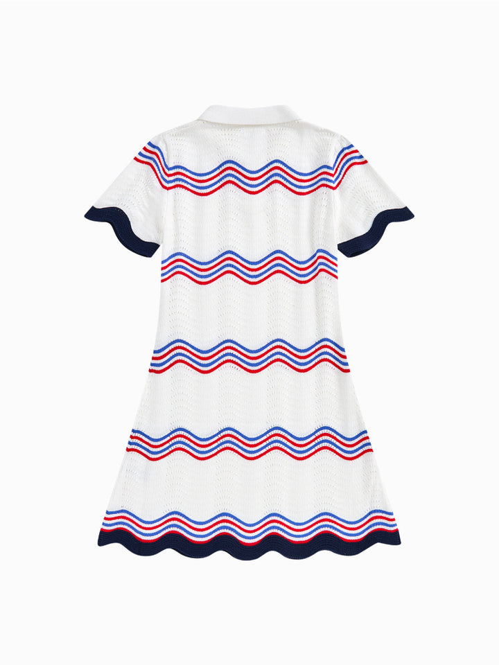 This short sleeve knitted dress features a textured fabric accented with colored line details. It includes front buttons at the neck and a classic collar, combining cozy comfort with timeless style.