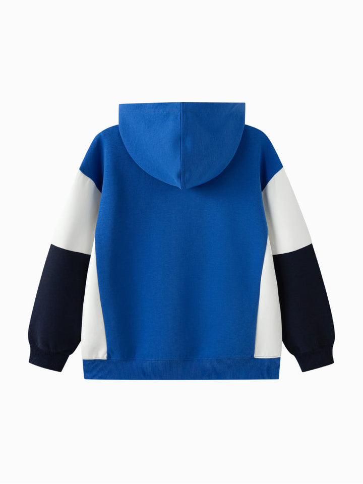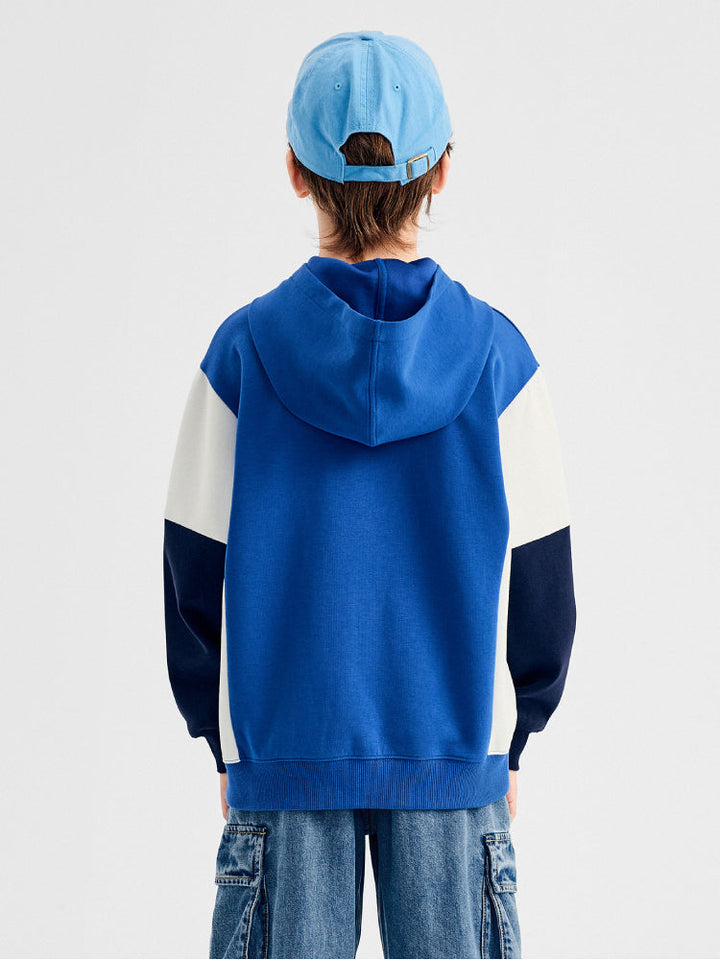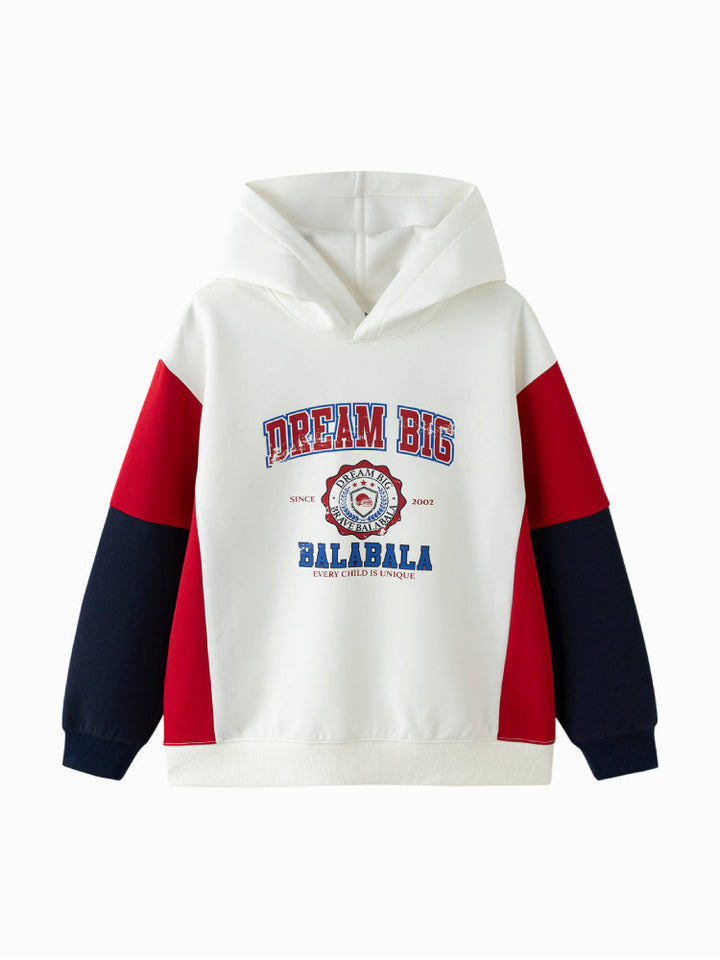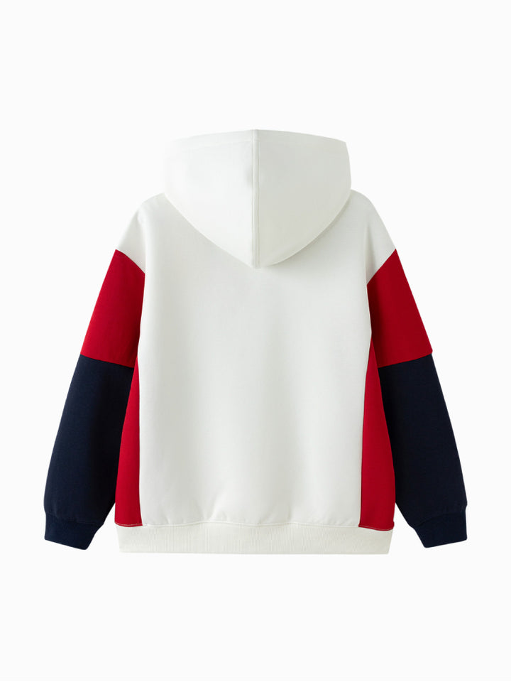 Hoodie with a modern colorblock design, front graphic, and ribbed cuffs and hem, offering a stylish blend of comfort and streetwear appeal.