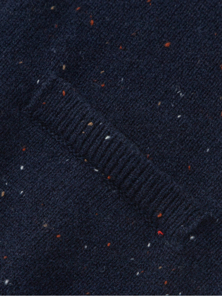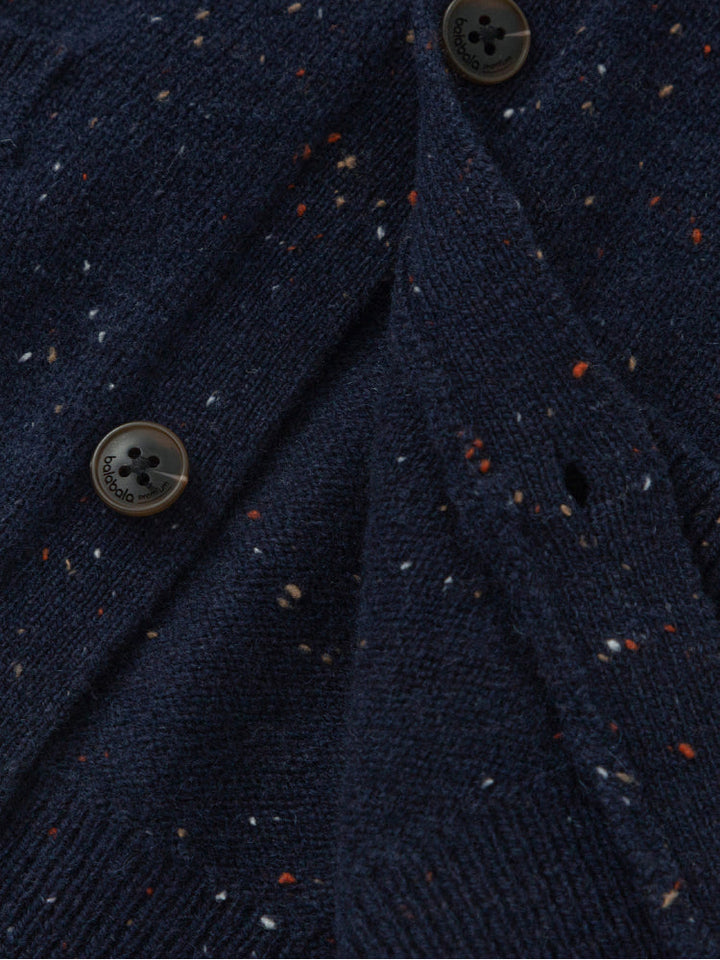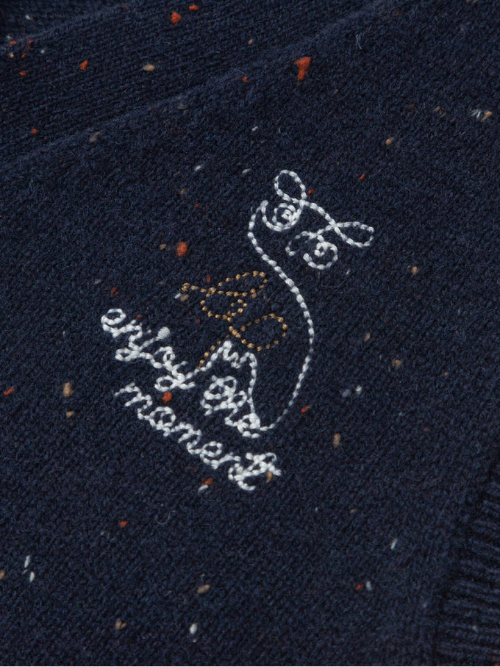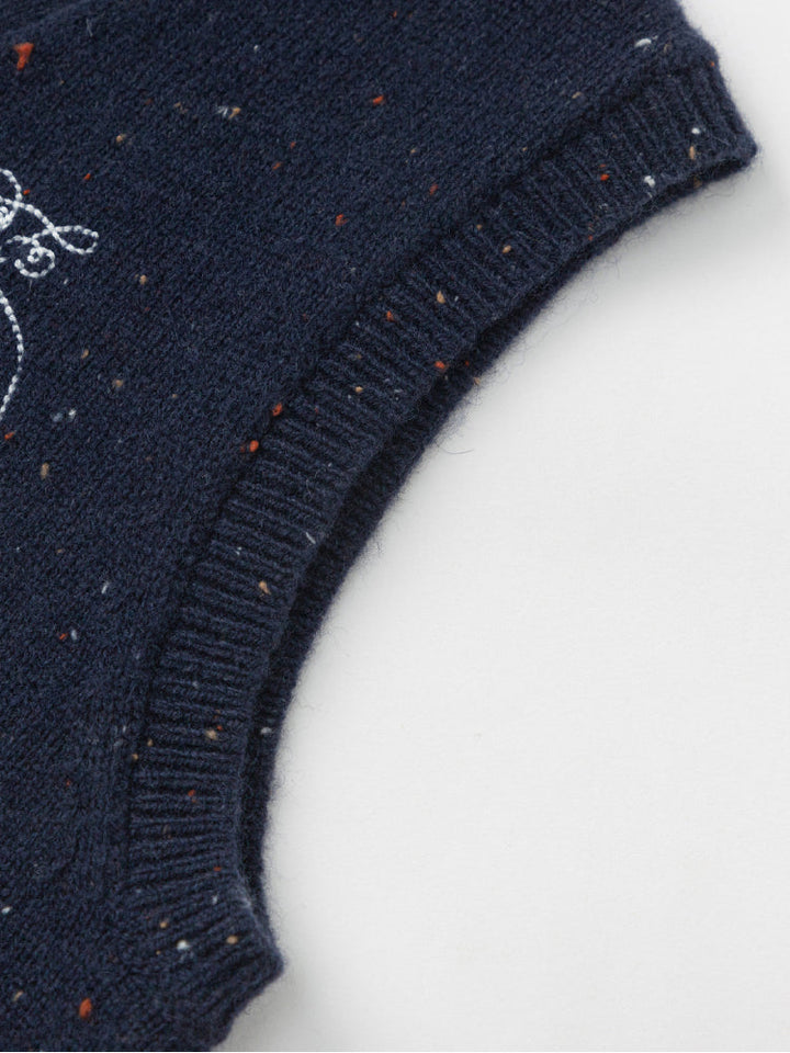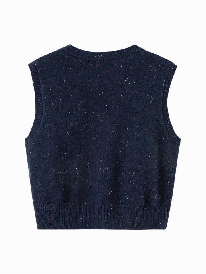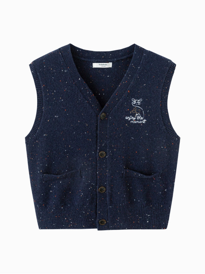 Button-up knitted vest with a speckled finish, embroidered chest detail, and front pockets, perfect for layering in casual outfits.
