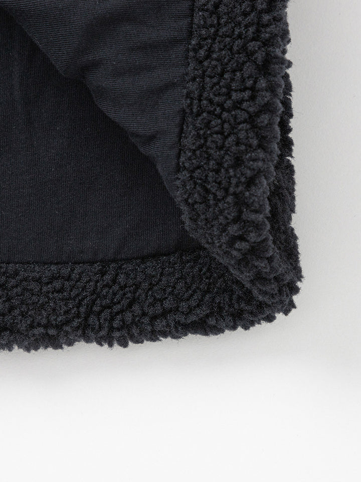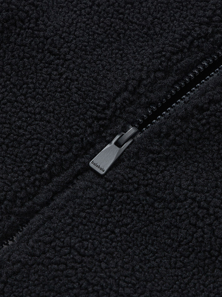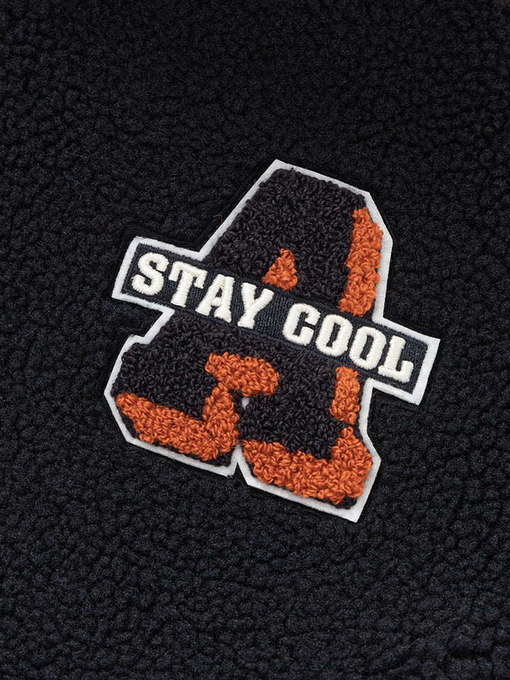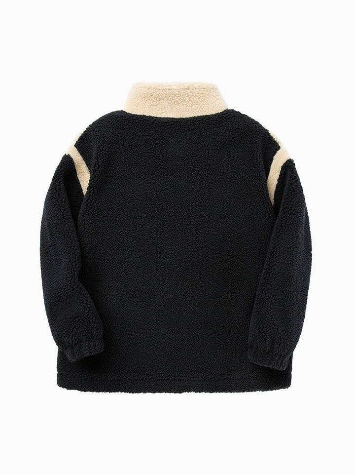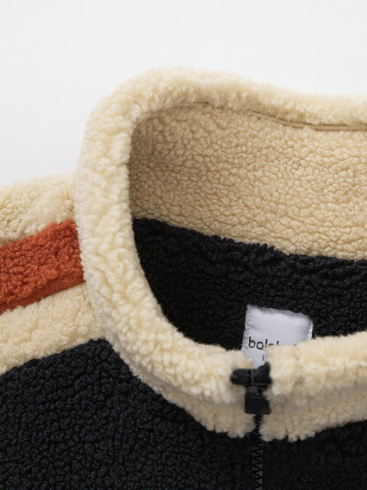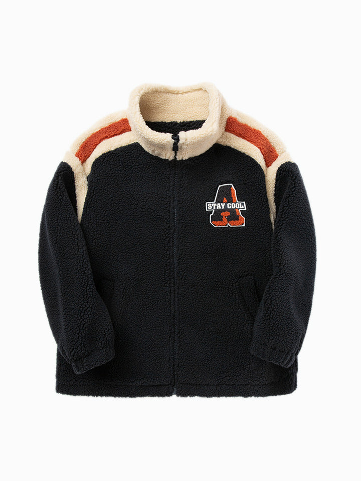 long sleeves boy jacket in a soft sherpa fleece fabric, decorated with a small woven patch on the front side and colored details, comes with pockets on the front side, zipper for closure on the front side and with a high collar