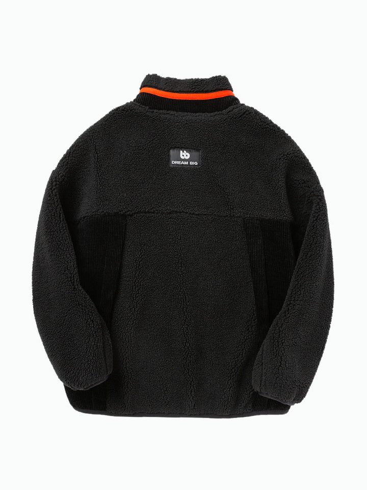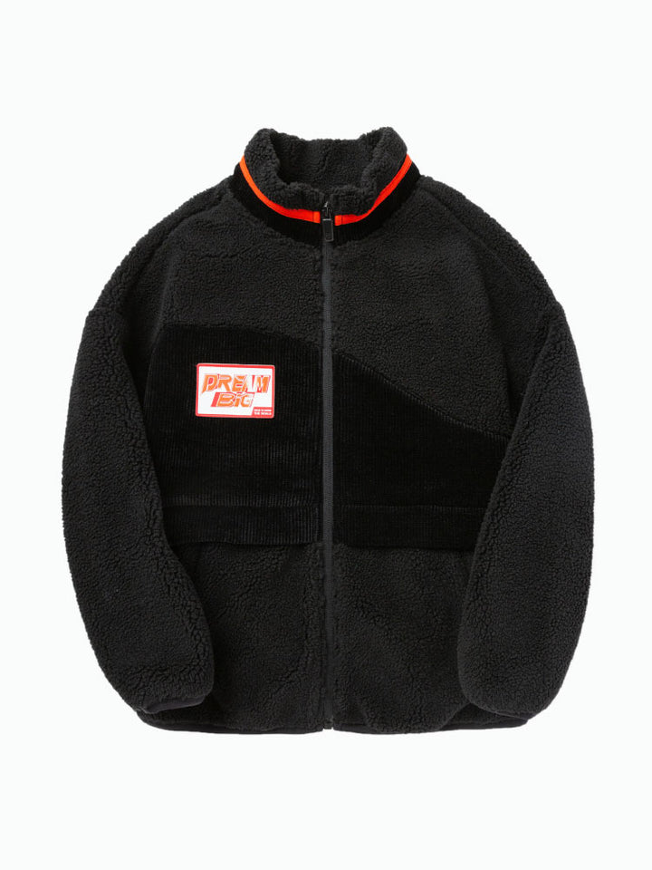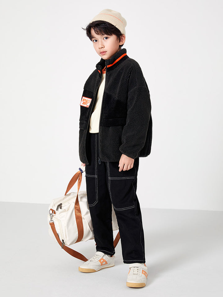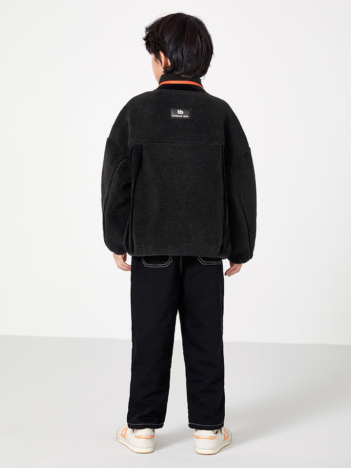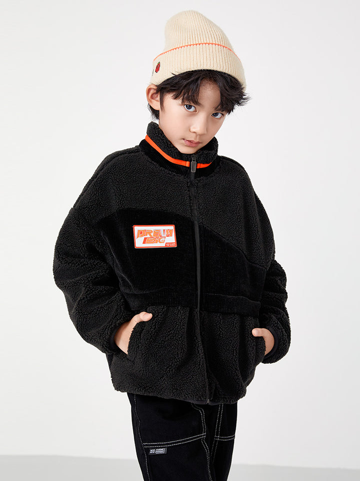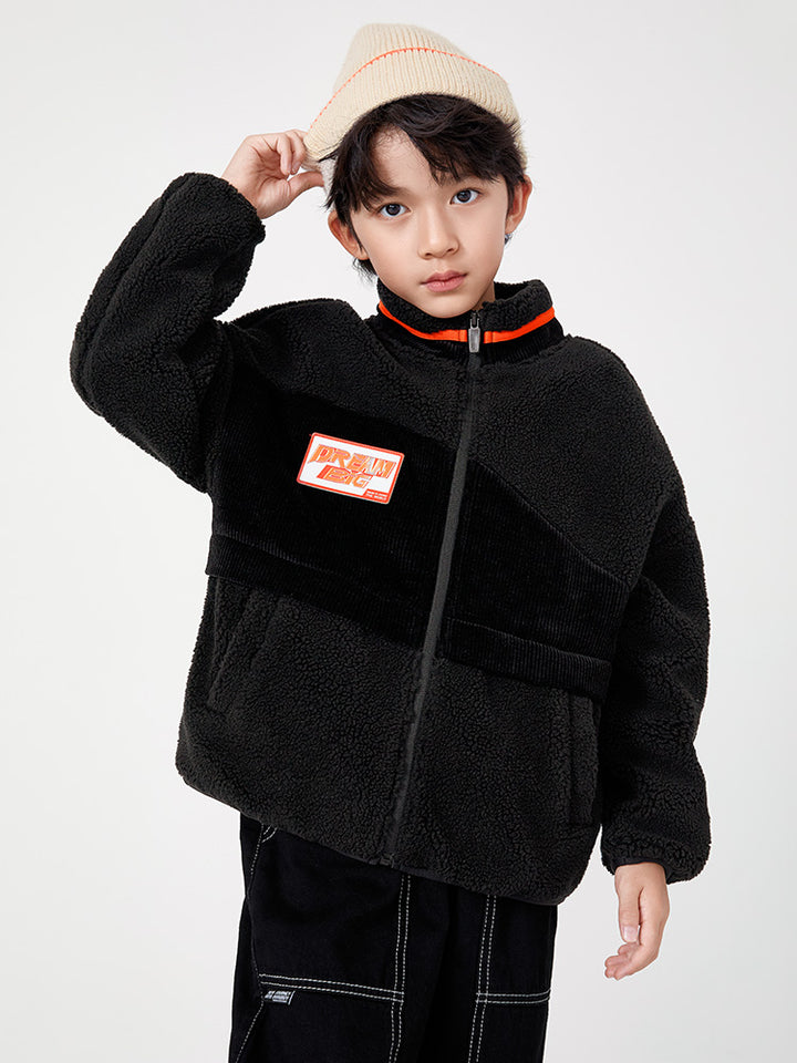 long sleeves boy jacket in a soft sherpa fleece fabric, decorated with a contrast fabric details and a patch on the front side, comes with pockets on the front side, zipper for closure on the front side and with a high collar