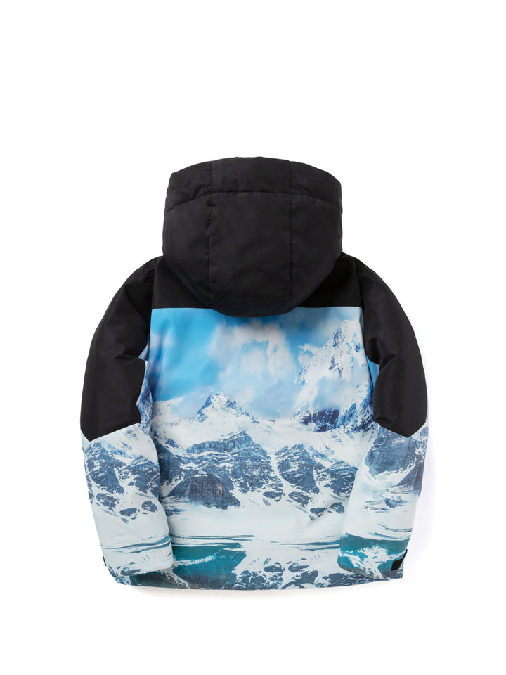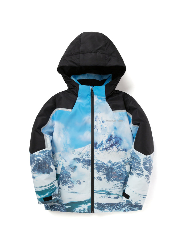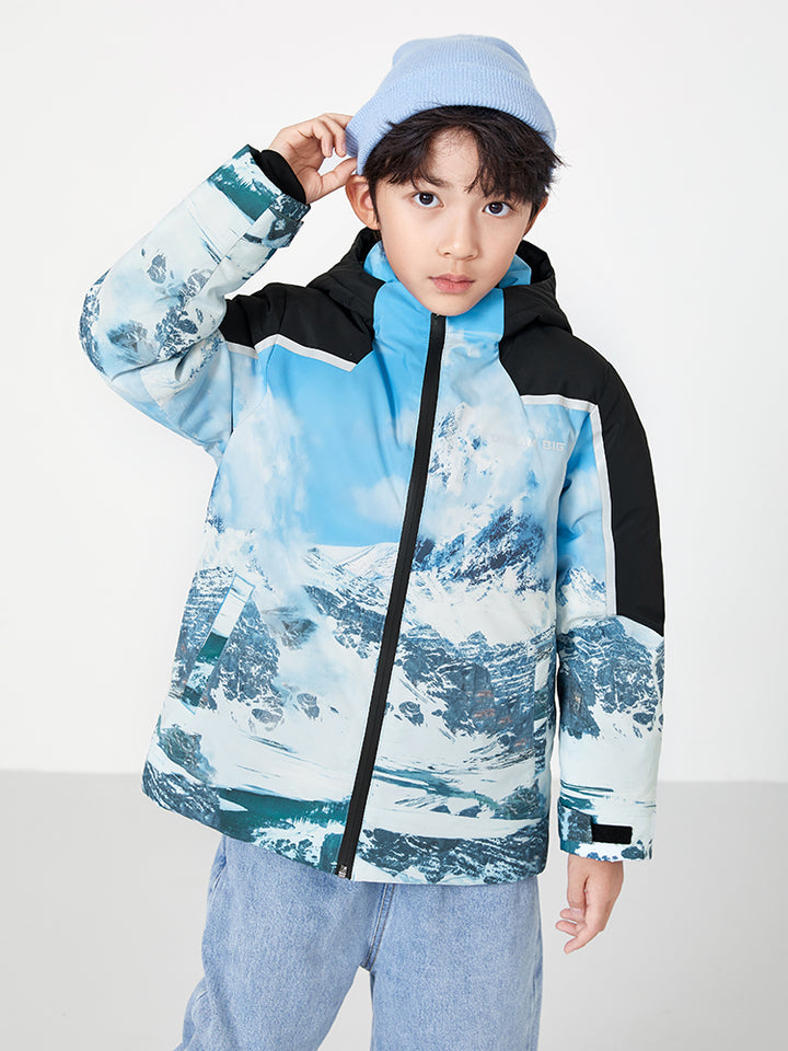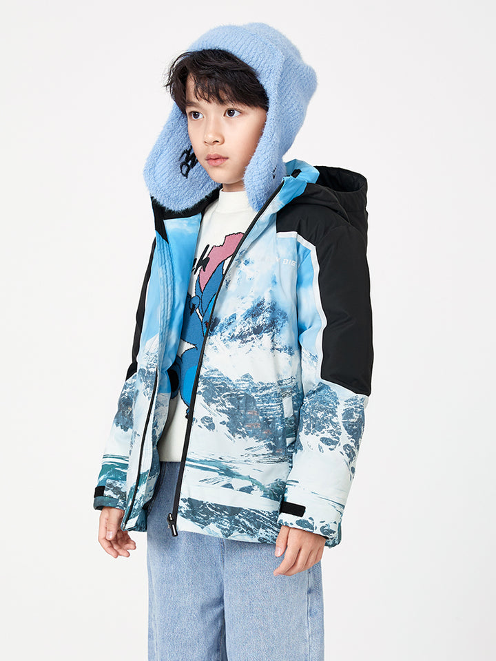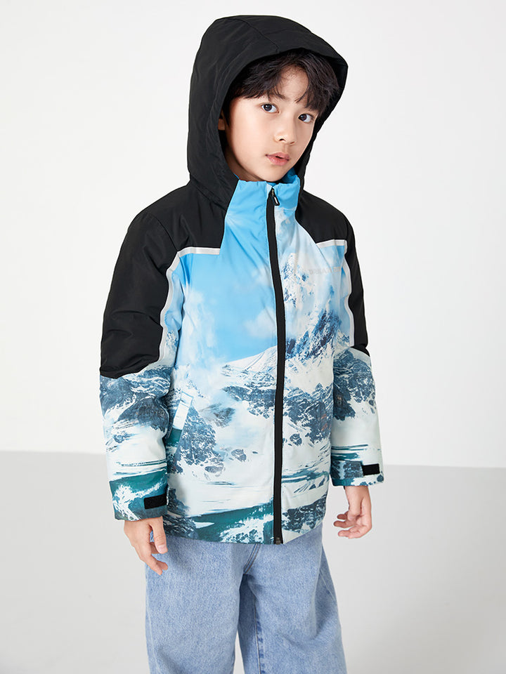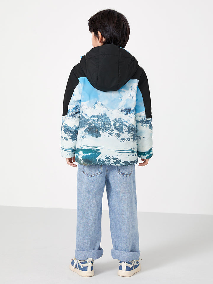 long sleeves boy puffer jacket with a warm fabric for winter outings, decorated with a printed pattern on full design, comes with pockets on the front side, zipper for closure on the front side and with an attached hoodie collar