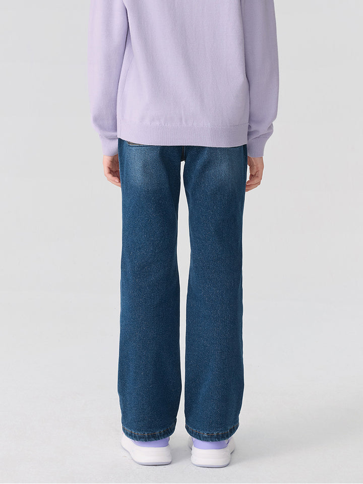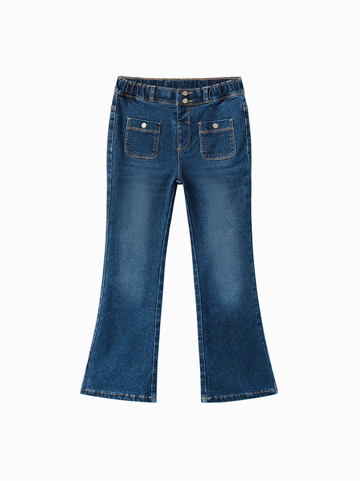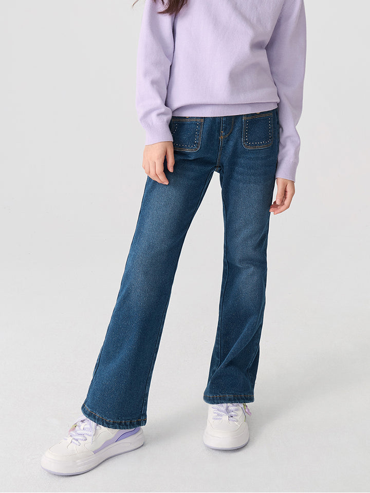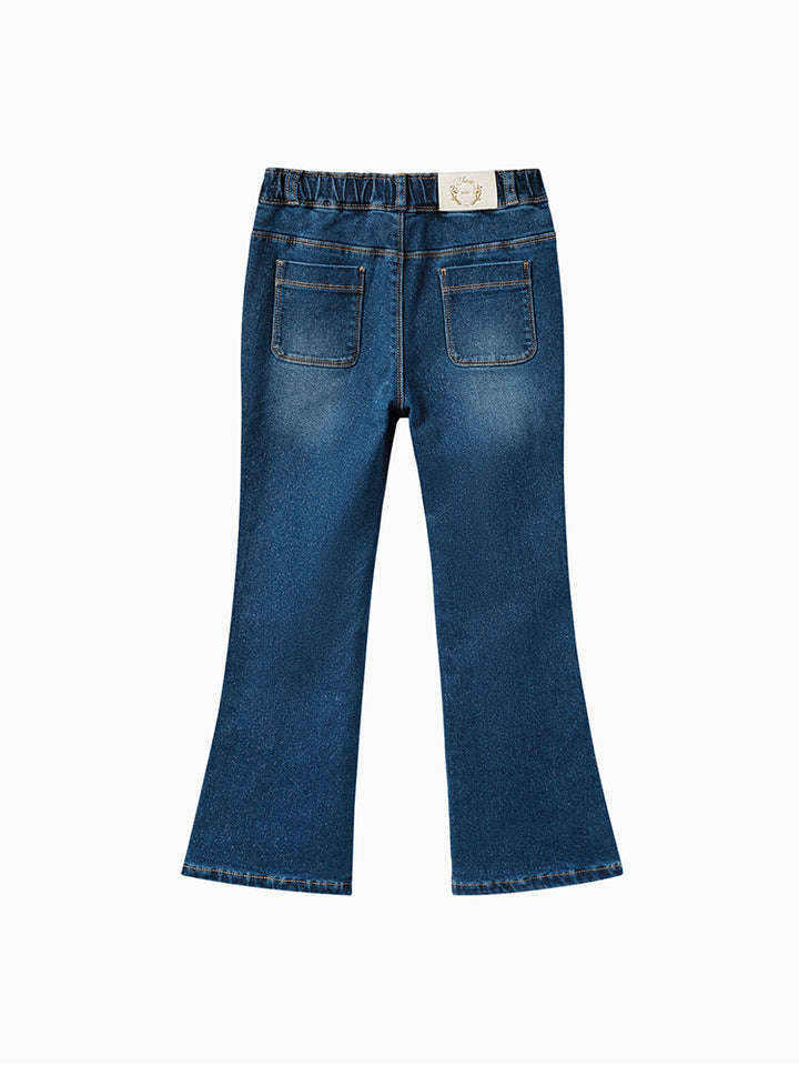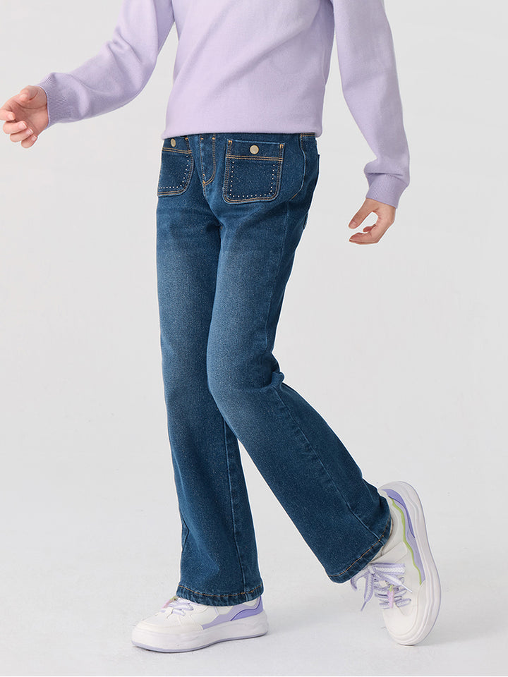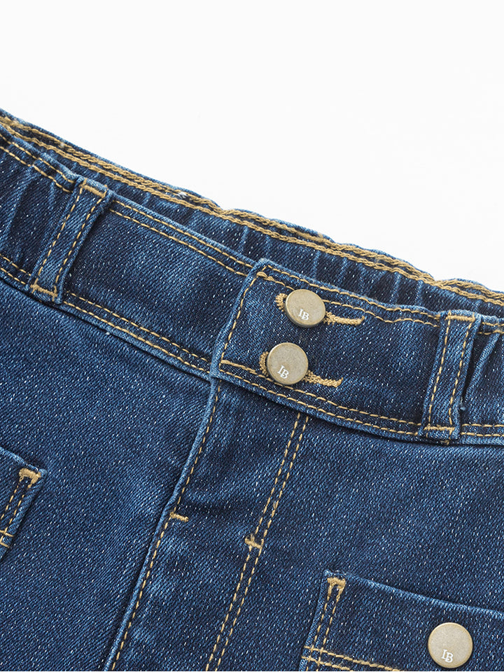 casual denim pants decorated with acid washed pattern and rhinestones detail on the front side, comes with front and back pockets and a comfy elasticated waistband with buttons for closure on waistline
