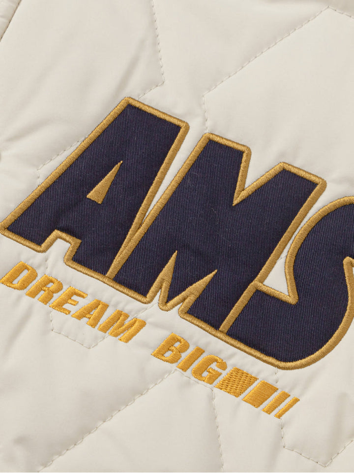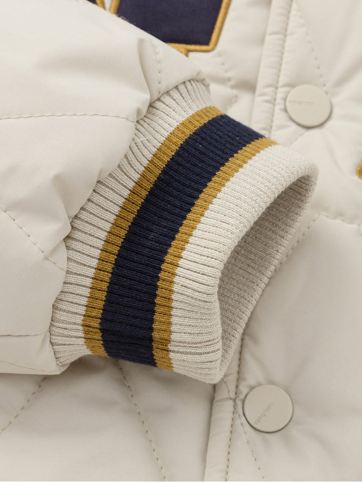 A stylish quilted jacket for kids, designed in a varsity-inspired look with bold letter embroidery on the front. Features snap button closure, side pockets, and striped ribbed cuffs and hem for a sporty and comfortable fit.