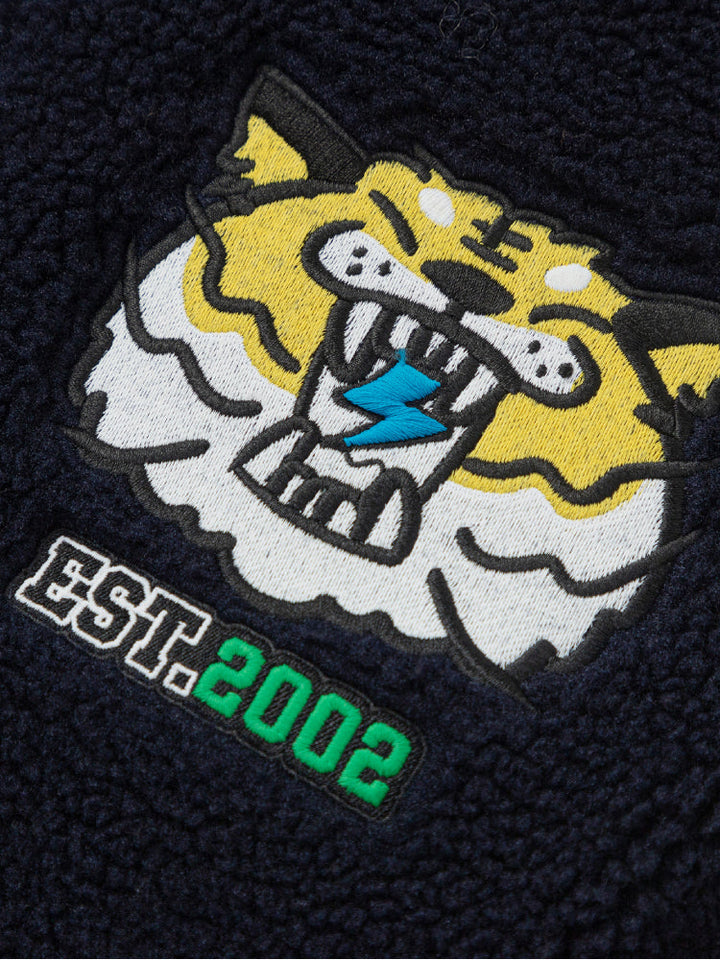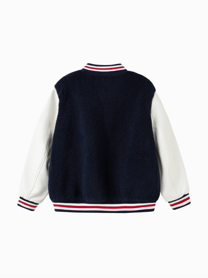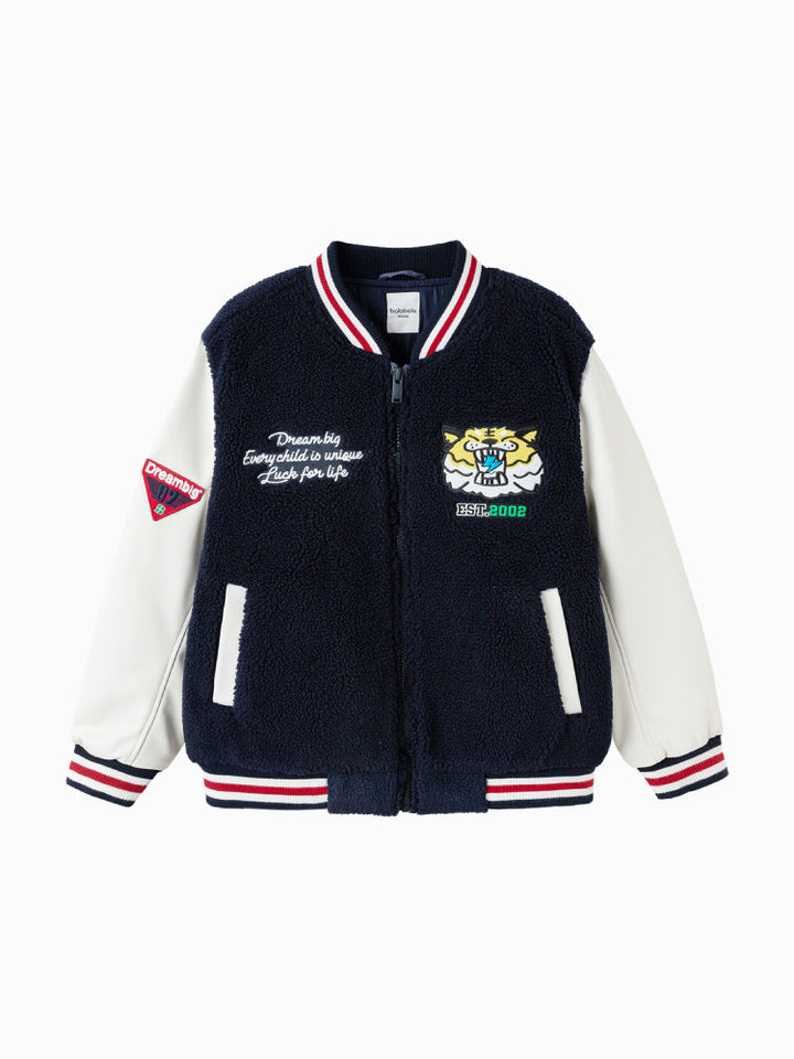 A stylish varsity bomber jacket designed for kids, featuring a soft fleece body with contrast sleeves. Decorated with a bold tiger patch and embroidered slogans for a sporty, trendy look. Ribbed cuffs and hem ensure comfort and a secure fit, making it perfect for casual everyday wear.