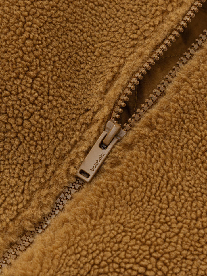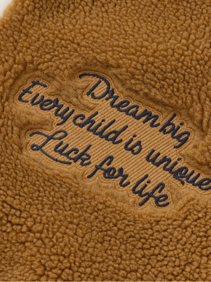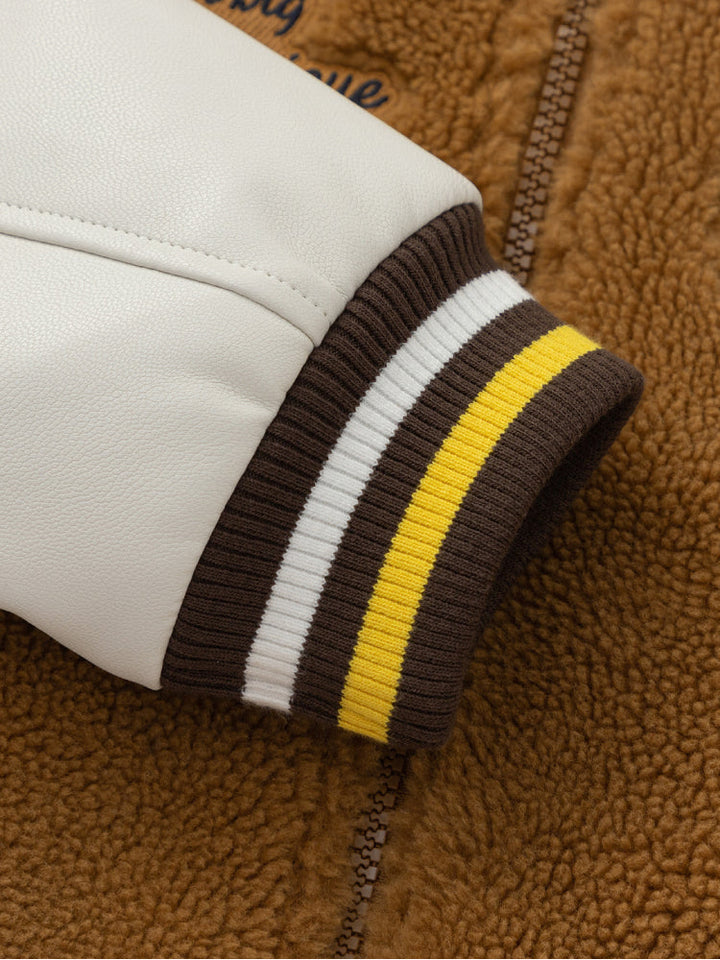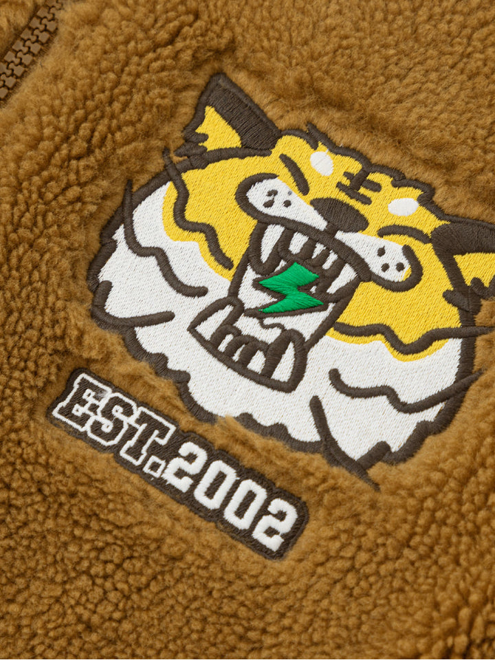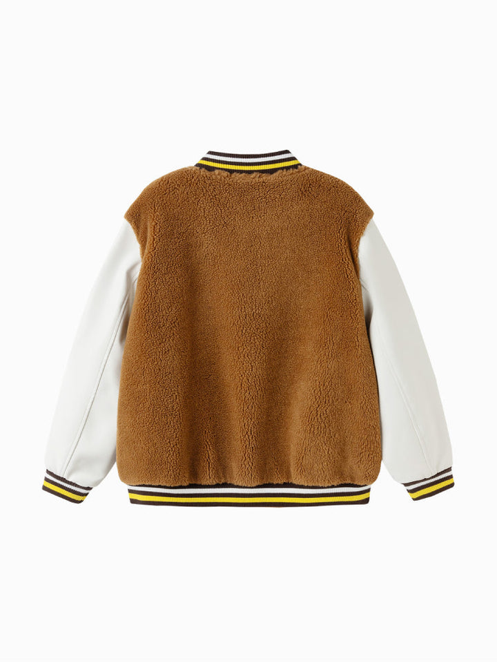 A stylish varsity bomber jacket designed for kids, featuring a soft fleece body with contrast sleeves. Decorated with a bold tiger patch and embroidered slogans for a sporty, trendy look. Ribbed cuffs and hem ensure comfort and a secure fit, making it perfect for casual everyday wear.