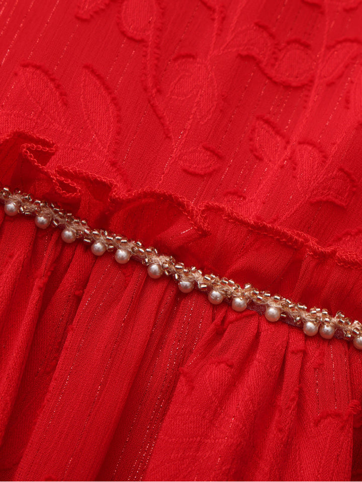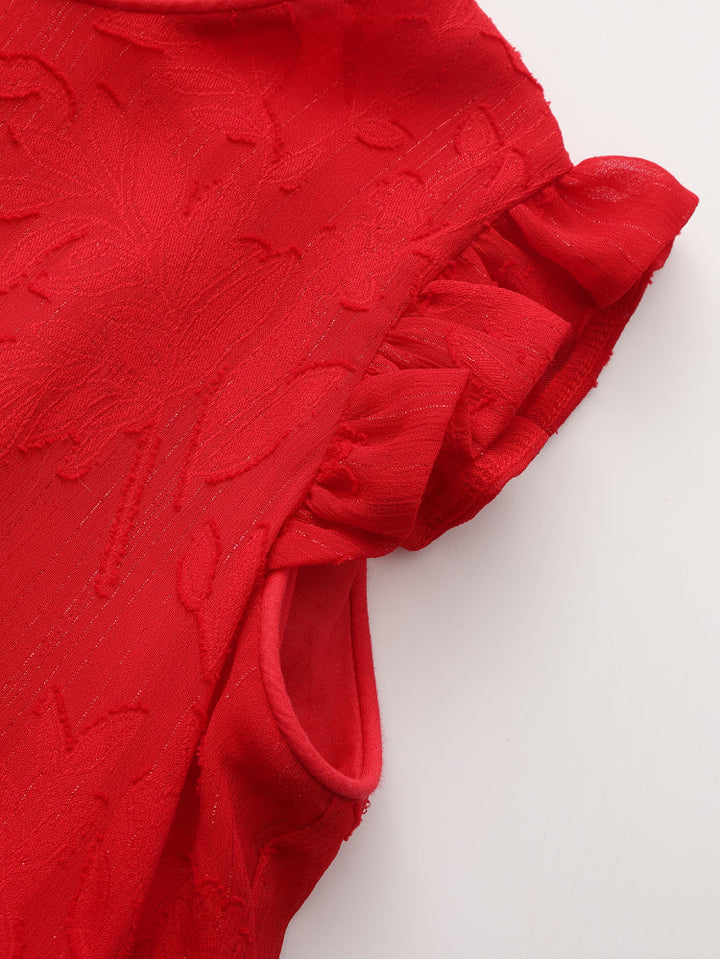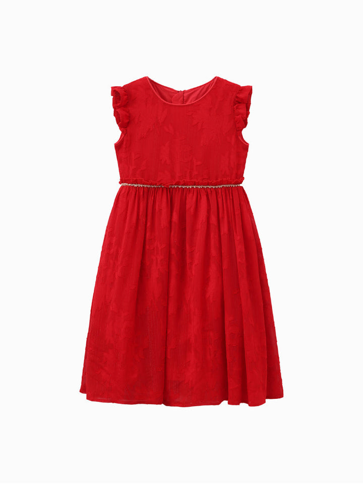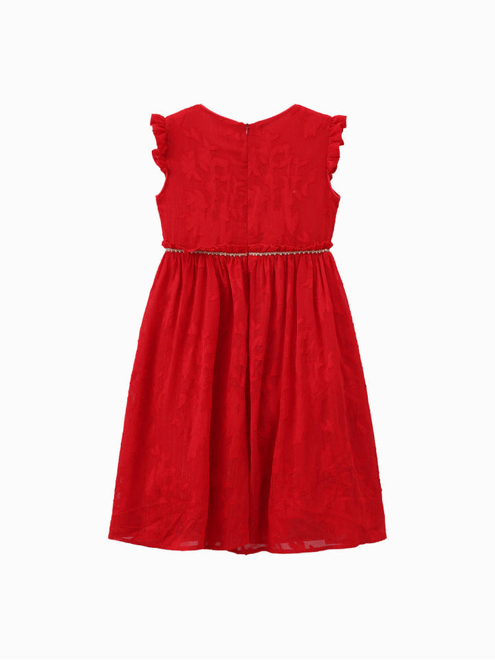 Elegant sleeveless kids’ dress featuring ruffled shoulders and a delicate waist detail. Designed with a flared skirt for a graceful look, perfect for parties and special occasions.