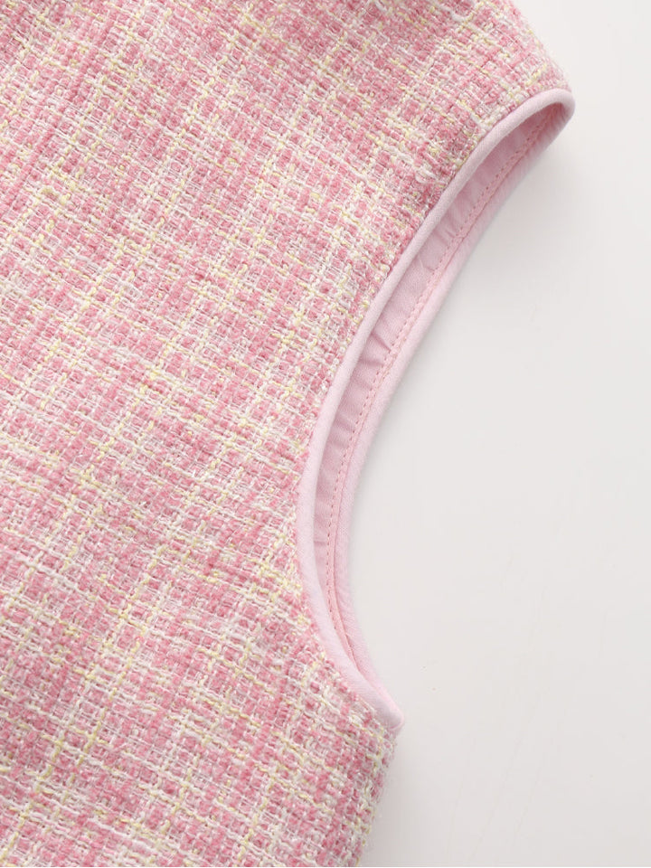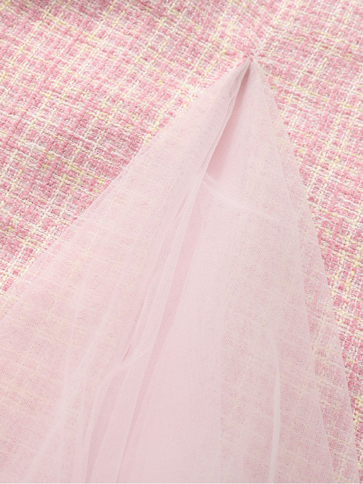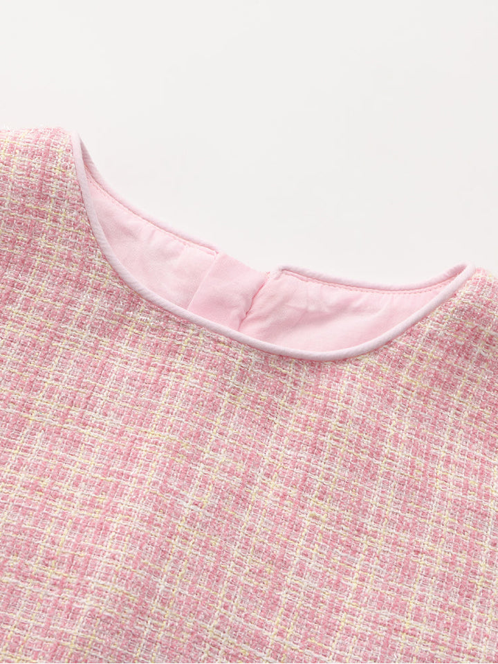 Charming sleeveless dress for kids featuring a textured fabric front and soft tulle side panels. The playful design adds volume and elegance, making it ideal for birthdays, parties, and special celebrations.