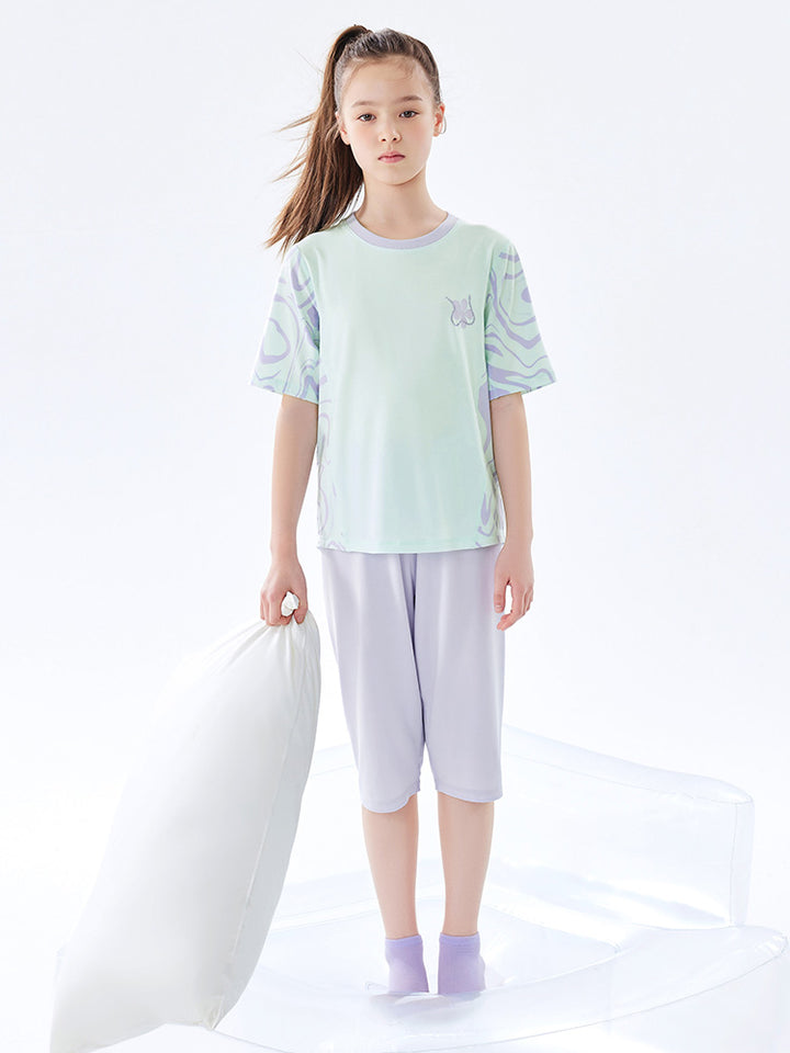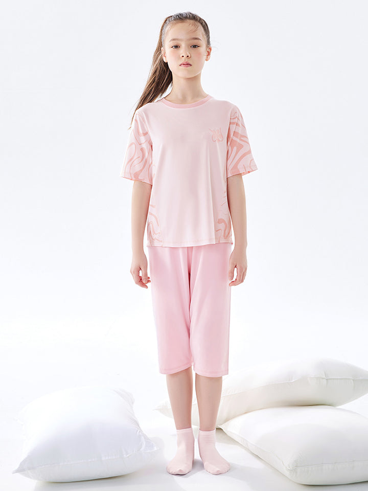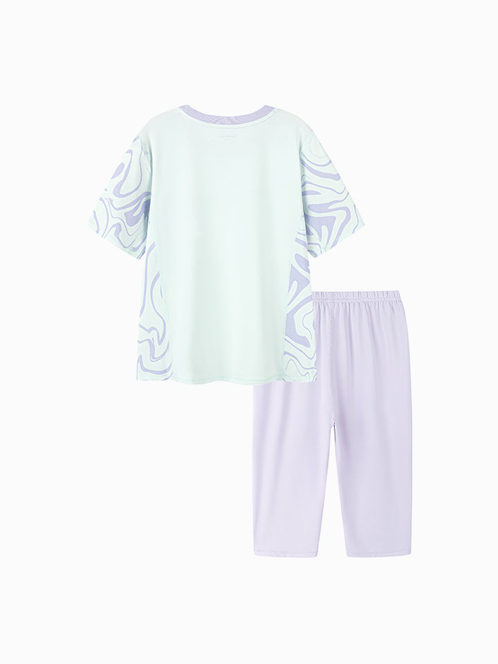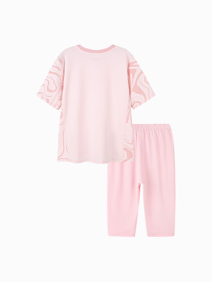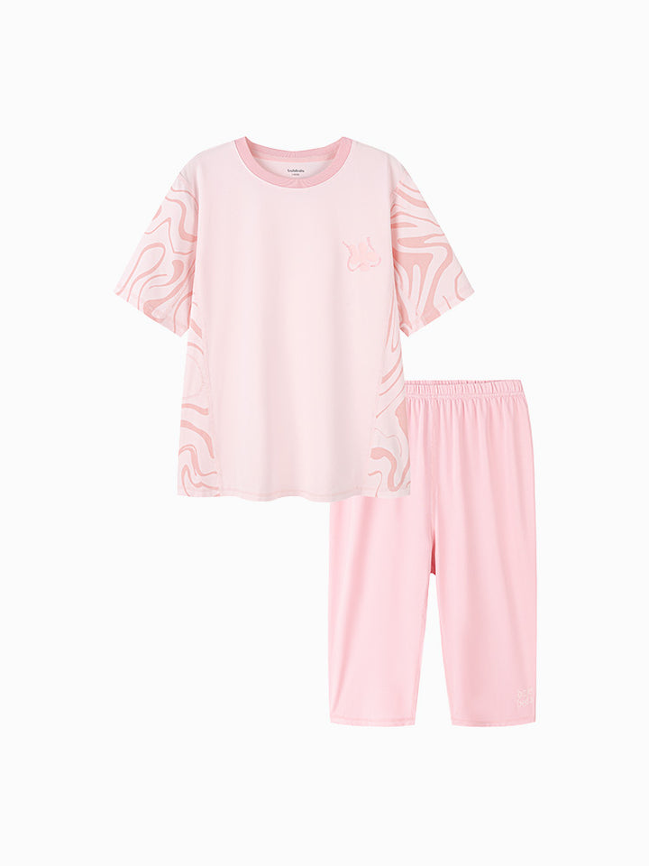 pyjama set of two pieces, a short sleeves t-shirt decorated with printed details and a print on the front side and comes with a rounded shape neckline, and a long short in a plain mono colored pattern and comes with a comfy elasticated waistband