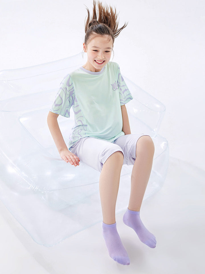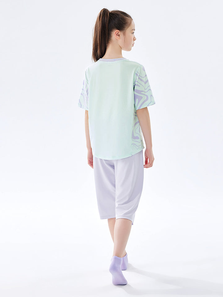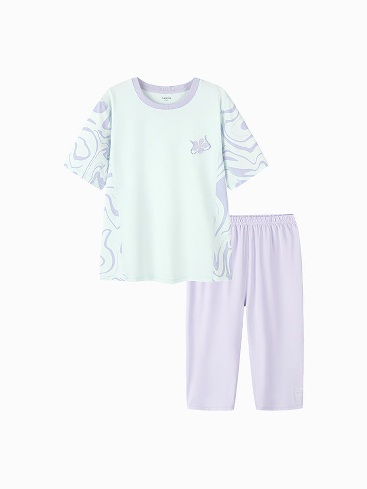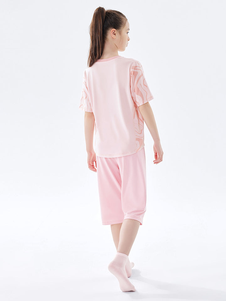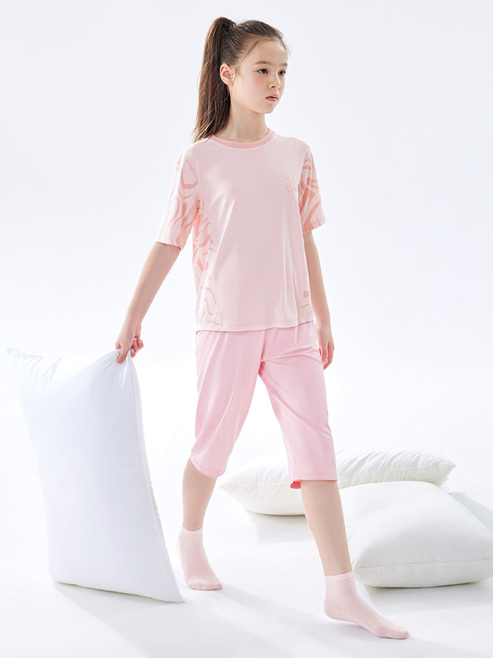 pyjama set of two pieces, a short sleeves t-shirt decorated with printed details and a print on the front side and comes with a rounded shape neckline, and a long short in a plain mono colored pattern and comes with a comfy elasticated waistband