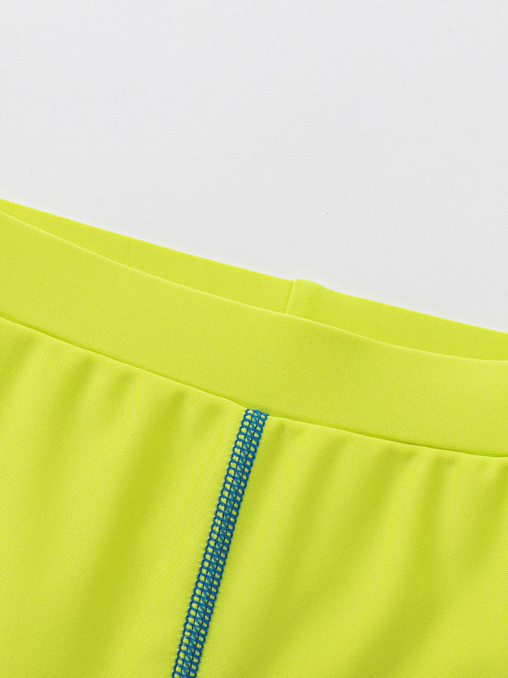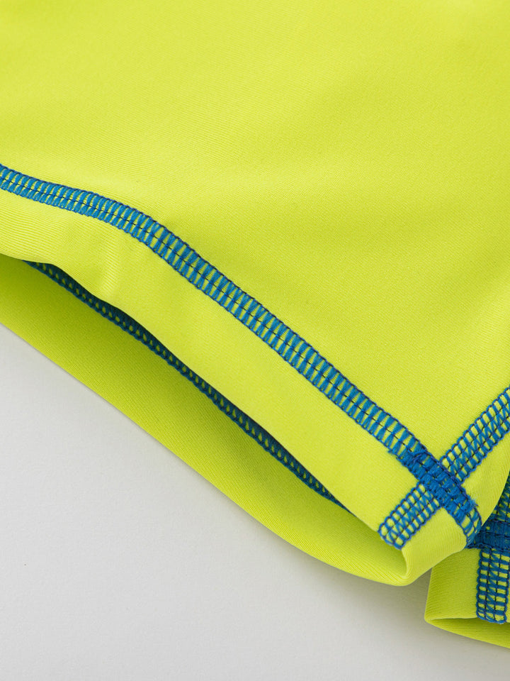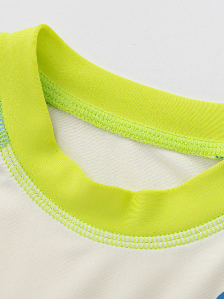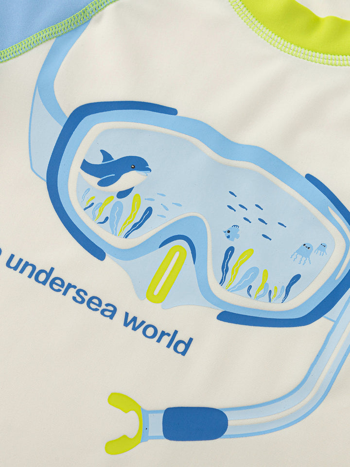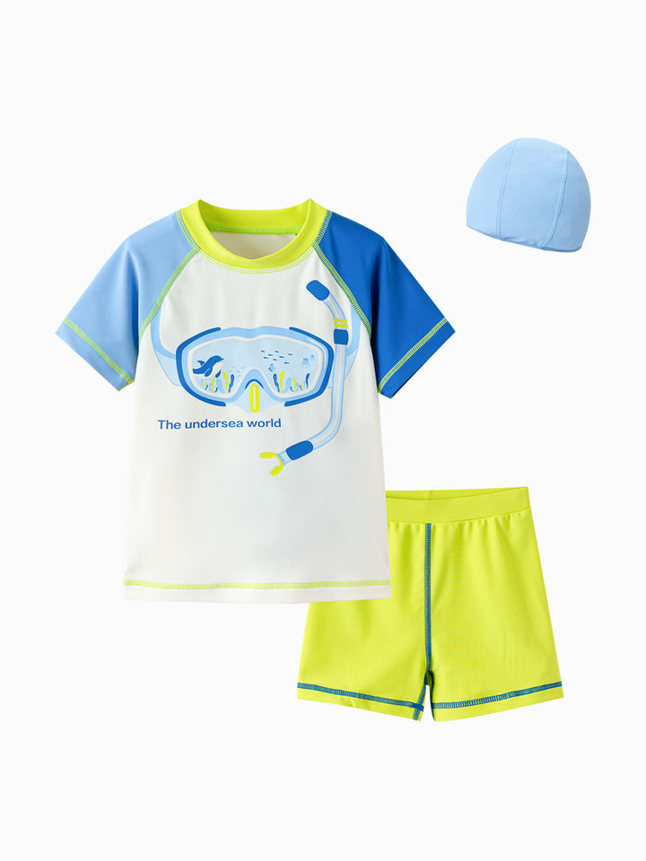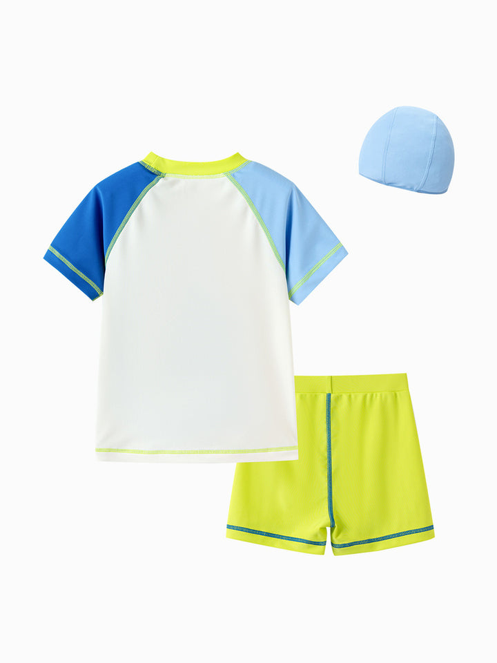 This adorable 3-piece swimwear set includes a short-sleeve top with a print and round neck, shorts with contrast trims and an elastic waist, and a matching swim cap.