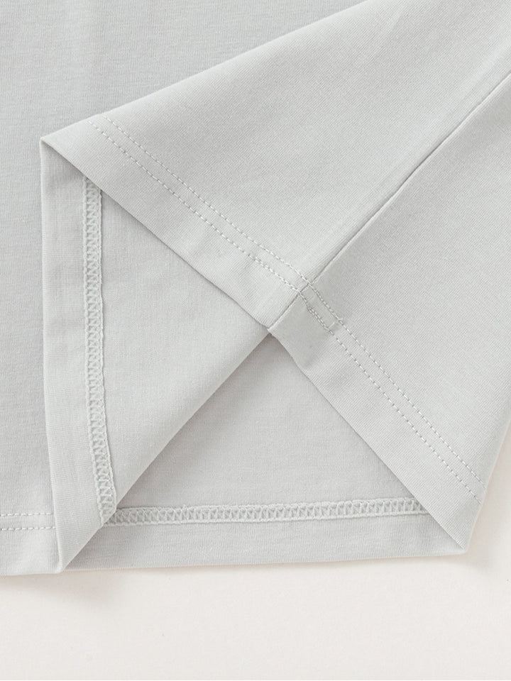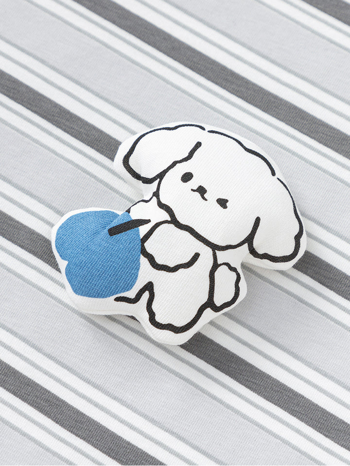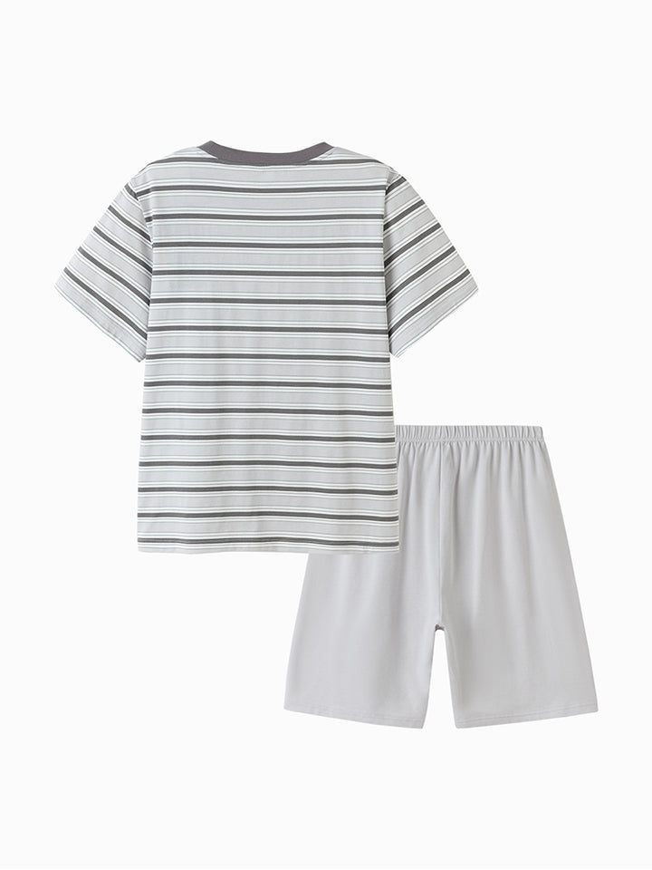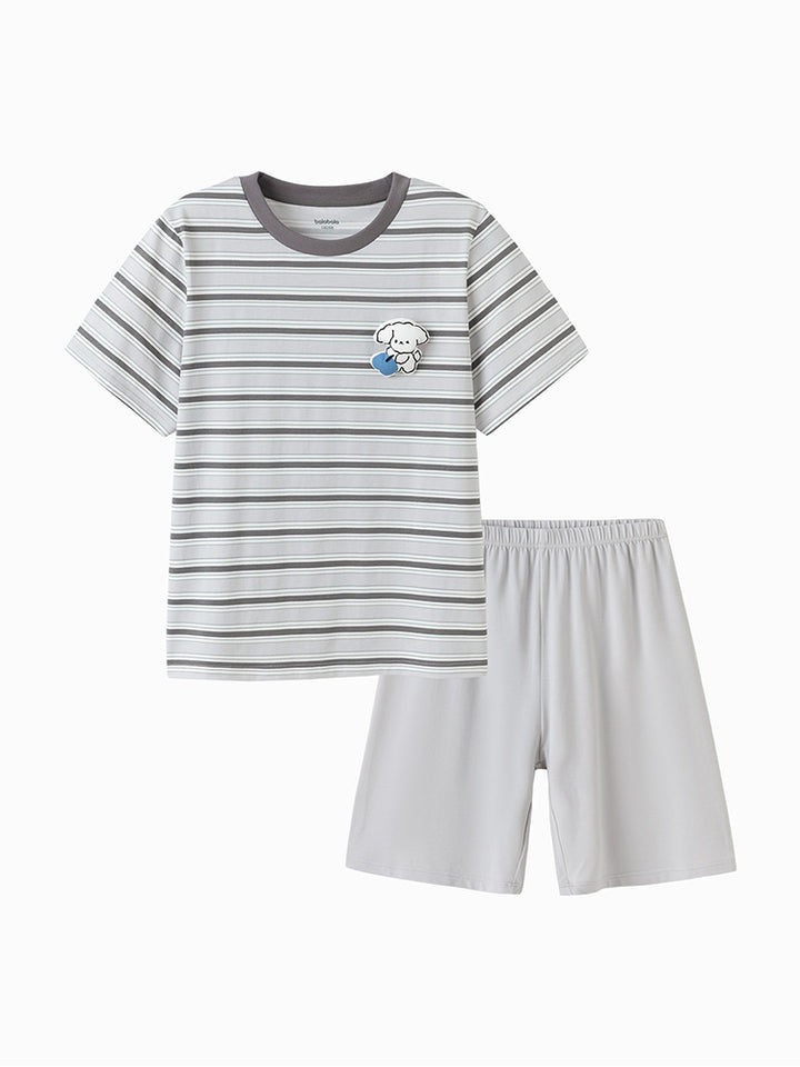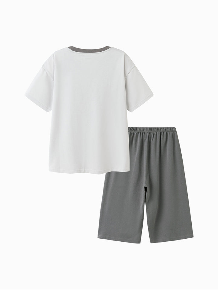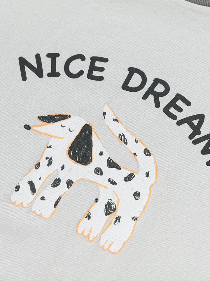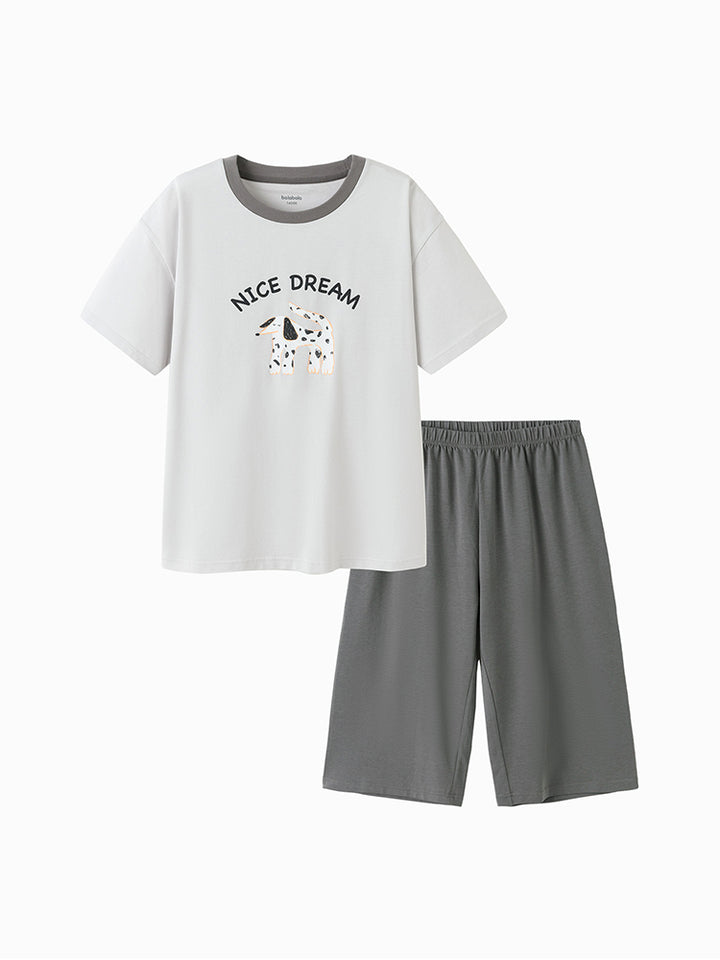 pyjama set of two pieces, a short sleeves t-shirt decorated with a print on the front side and comes with a rounded shape neckline, and a shorts in a solid mono colored pattern, comes with a comfy elasticated waistband