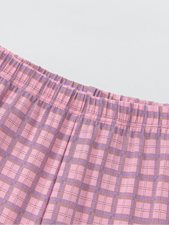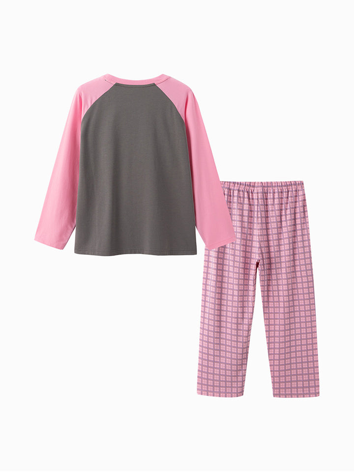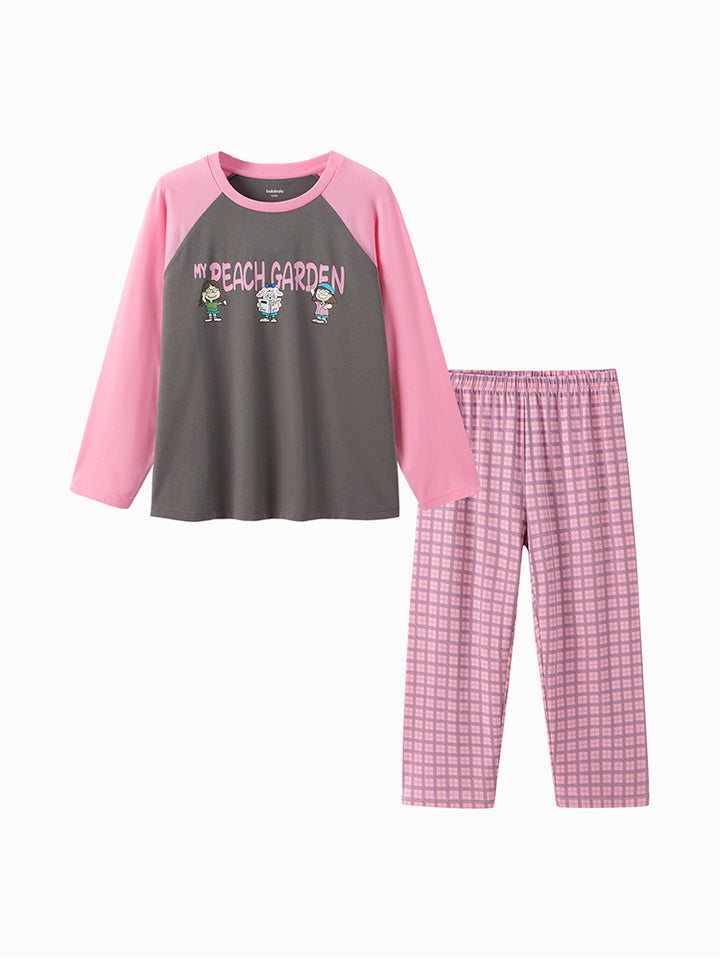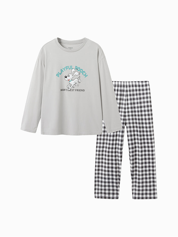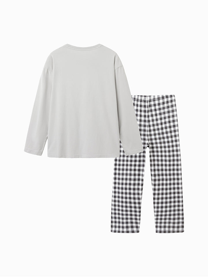 loungewear pyjama set of two pieces, a long sleeves top decorated with a print and comes with a rounded shape neckline and a pants decorated with a printed pattern and comes with an elasticated waistband