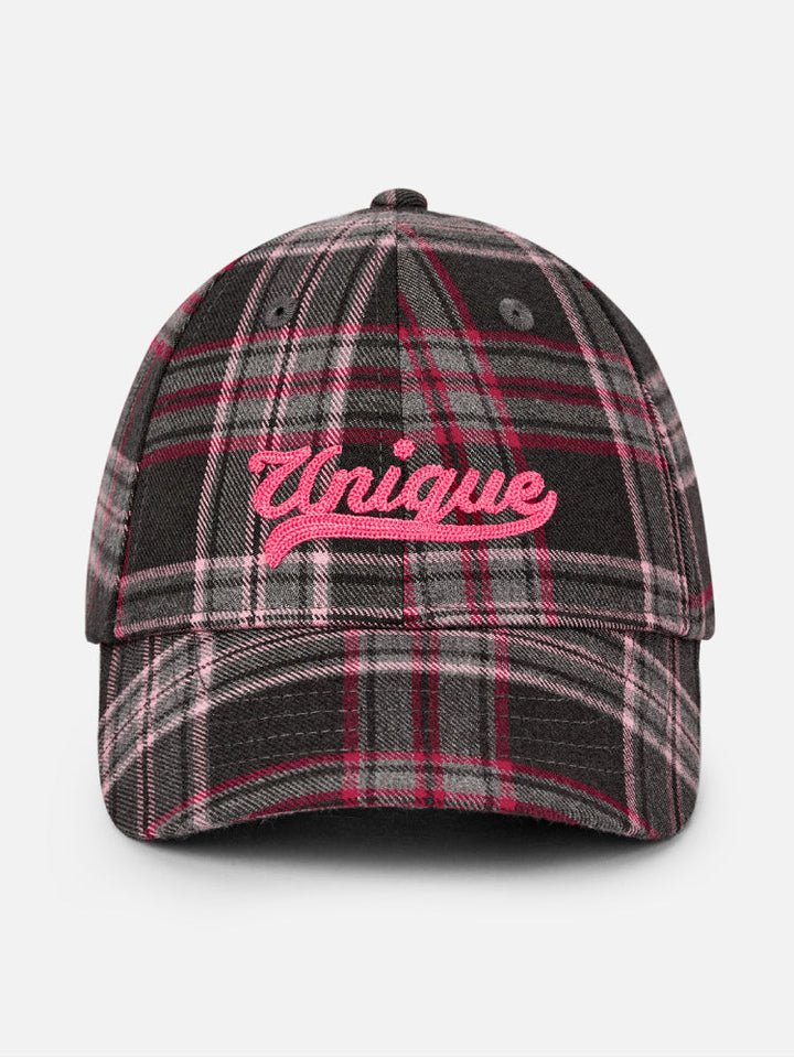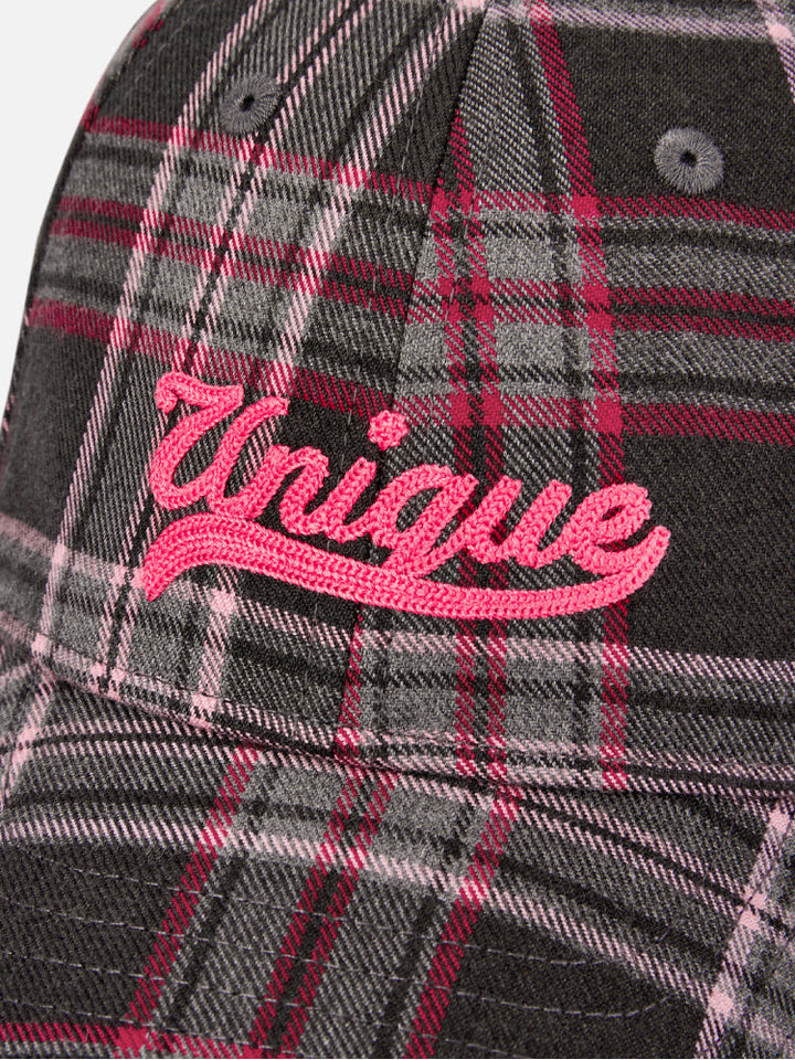 A stylish plaid baseball cap featuring a bold “Unique” embroidery in pink on the front. Designed with a curved brim and adjustable strap for a comfortable and secure fit. Perfect for casual outfits and everyday wear.