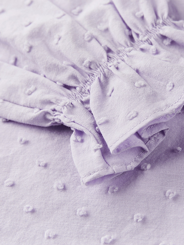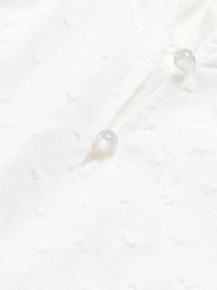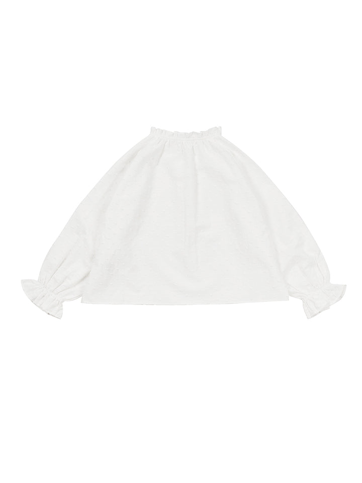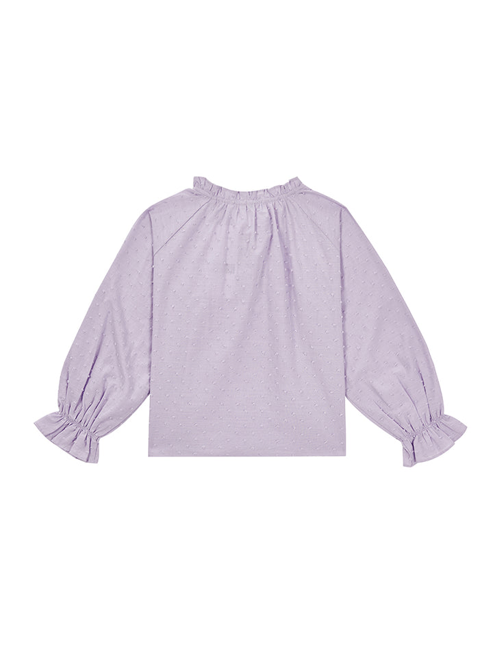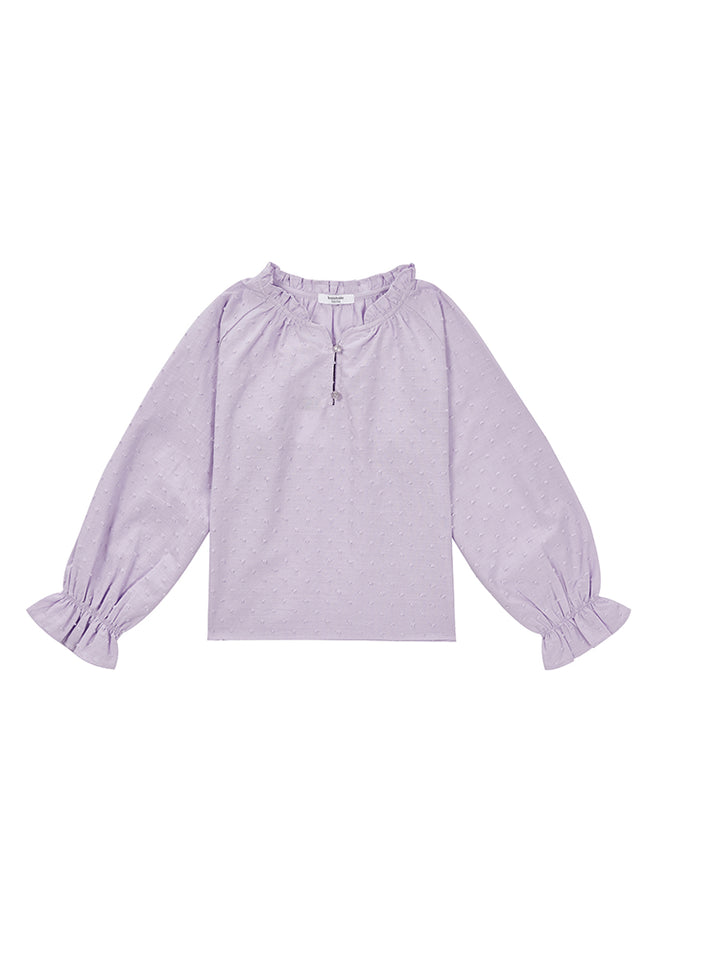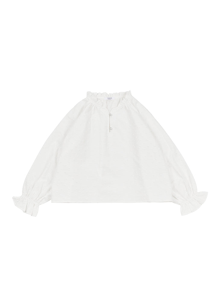 long sleeves blouse in a plain mono colored pattern, decorated with a textured pattern fabric and ruffled details on sleeves and collar hems, comes with buttons for closure on the front side and with a rounded collar