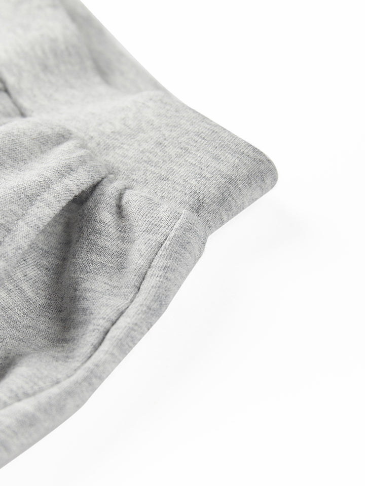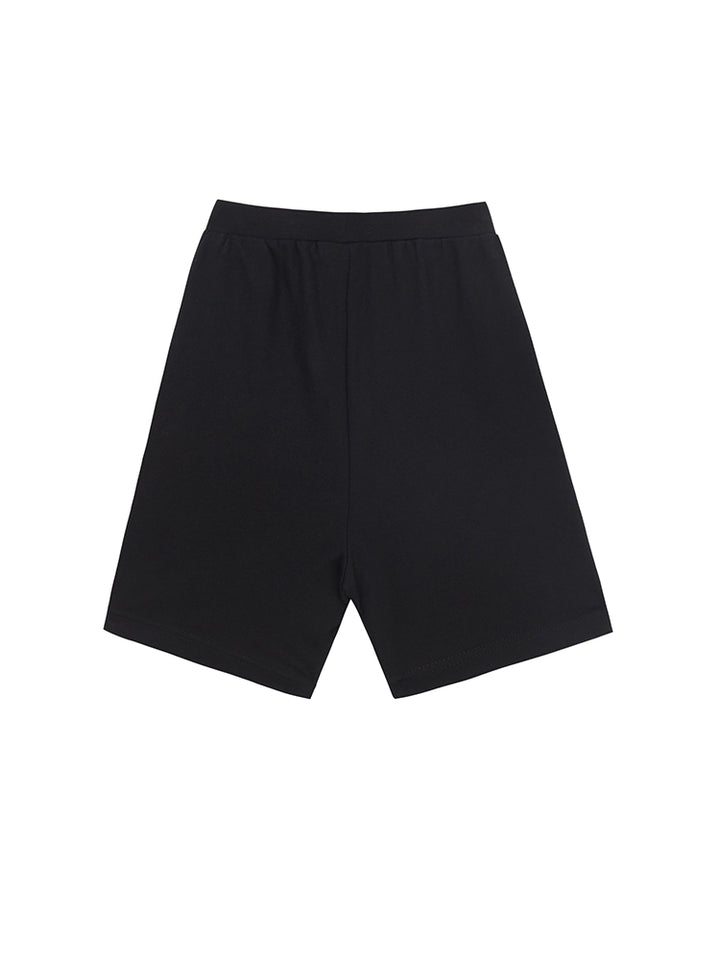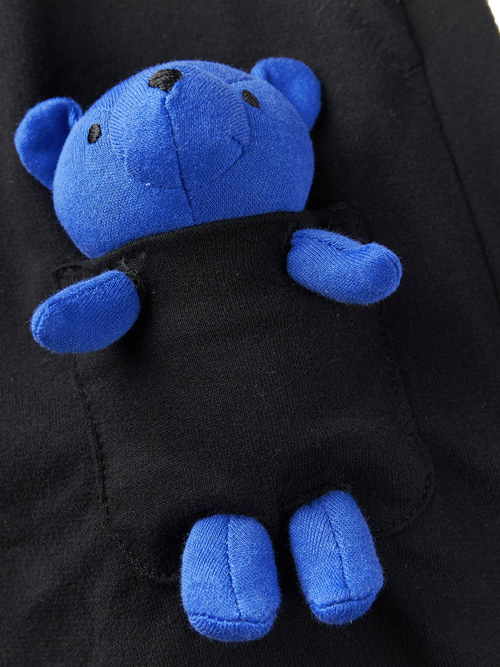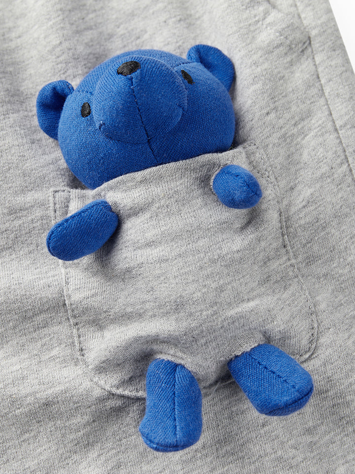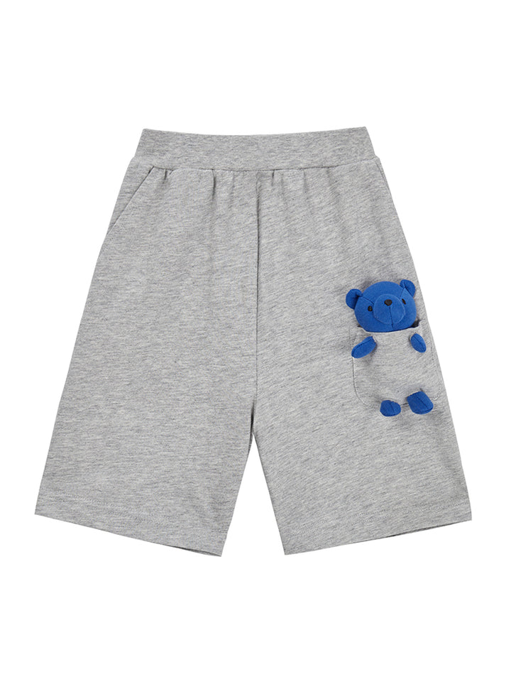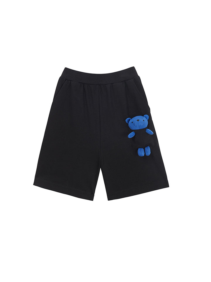 casual shorts in a plain mono colored pattern, decorated with a soft toy detail on the front side, comes with front pockets and with a comfy elasticated waistband