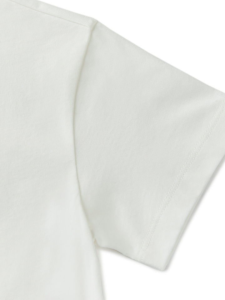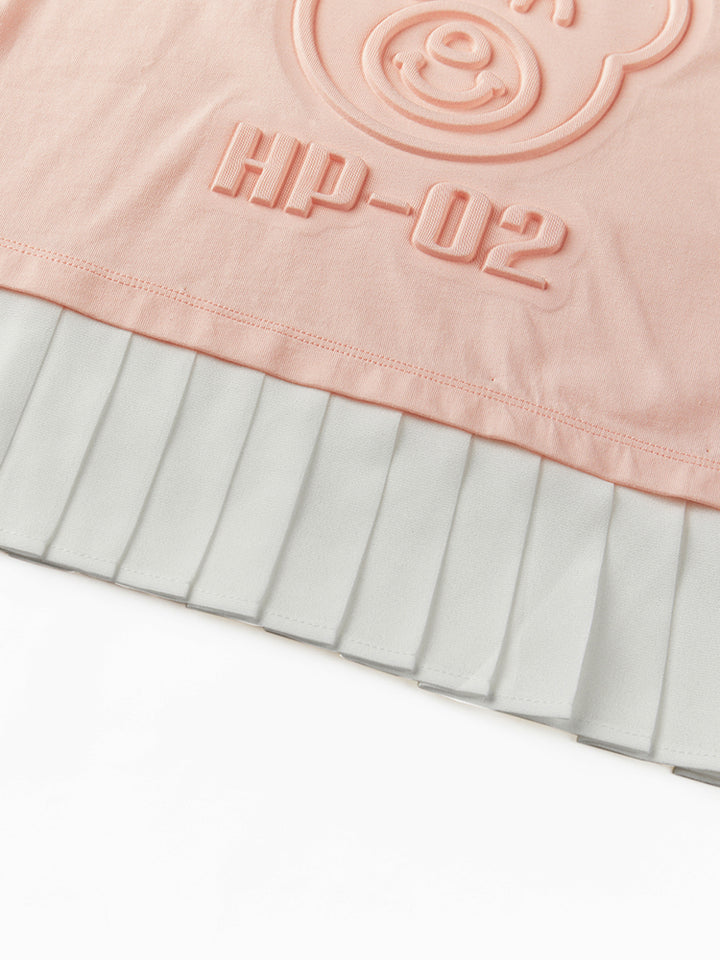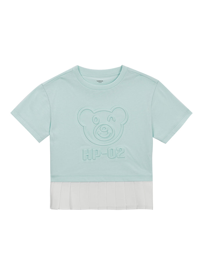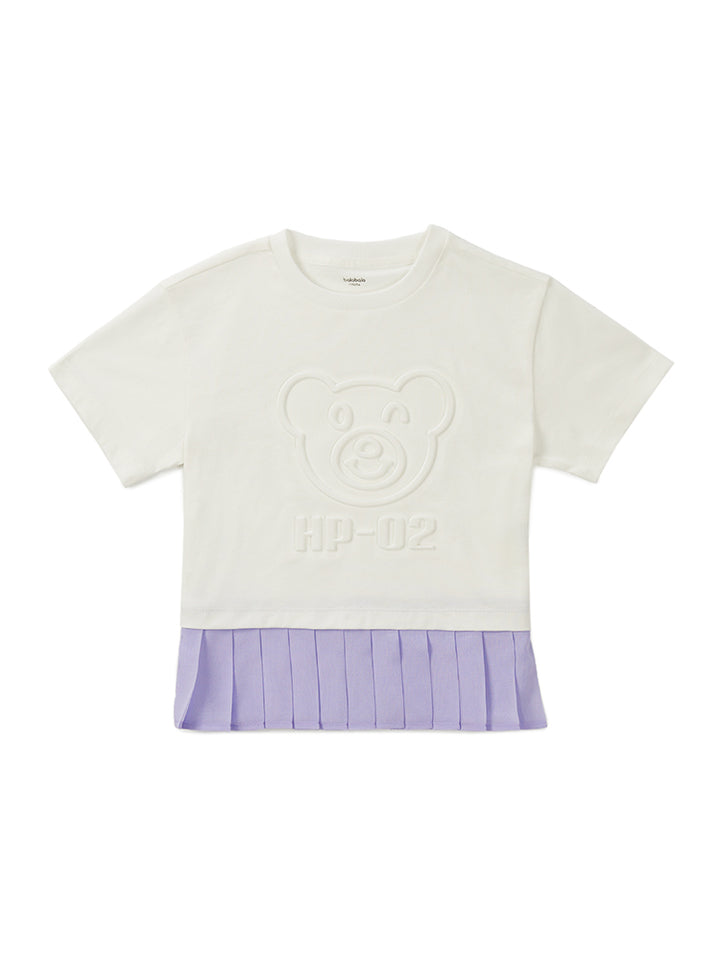 short sleeves t-shirt, decorated with prominent print on the front side and a contrast colored pleated details on bottom side, comes with a rounded shape neckline