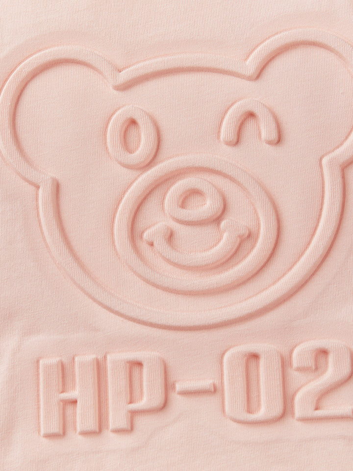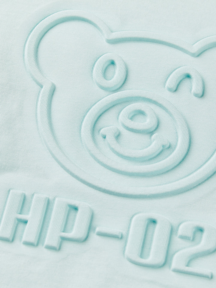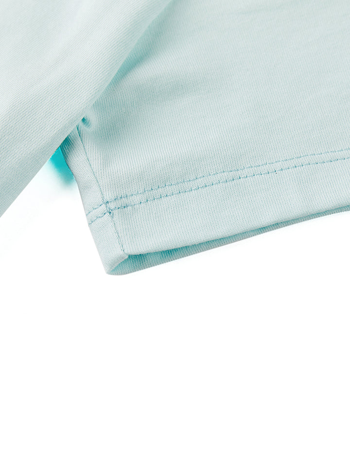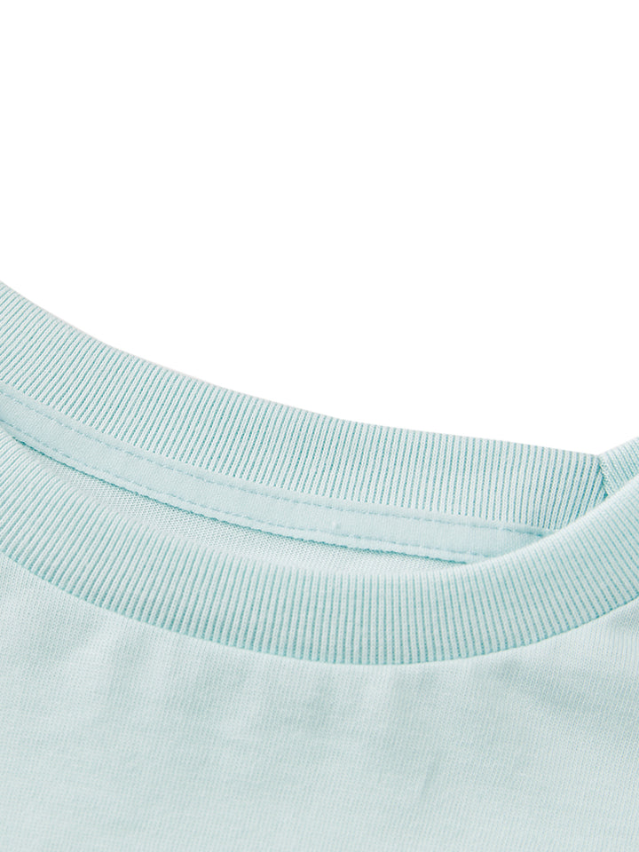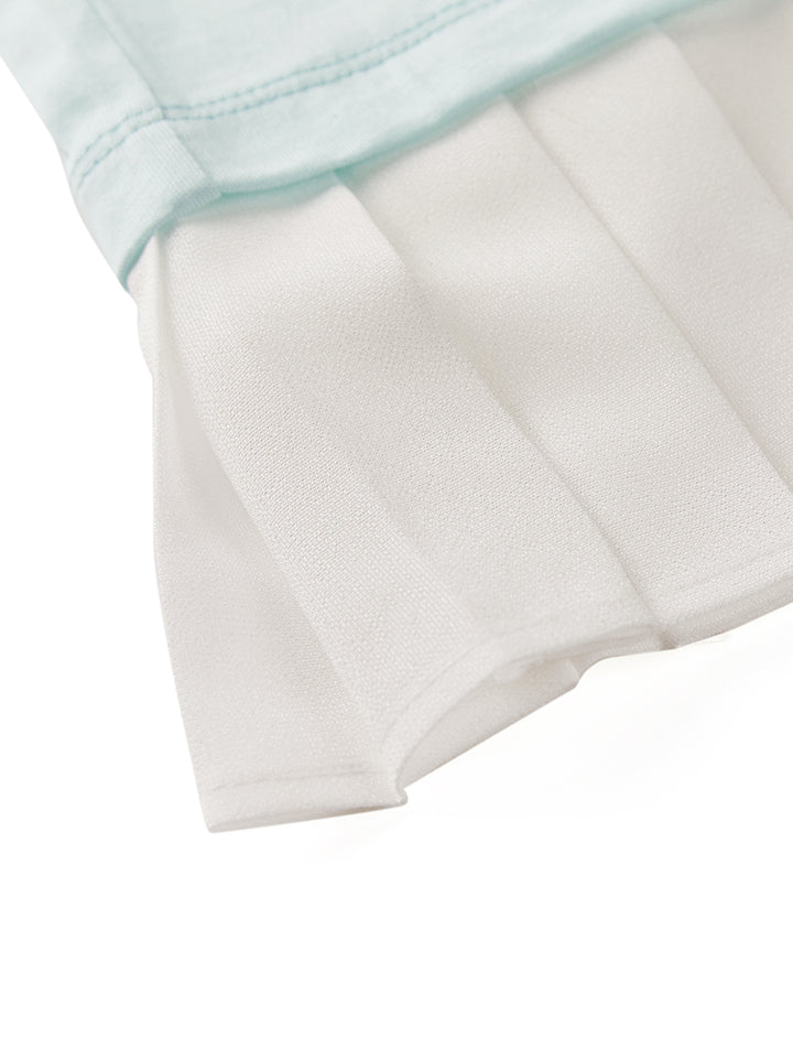 short sleeves t-shirt, decorated with prominent print on the front side and a contrast colored pleated details on bottom side, comes with a rounded shape neckline