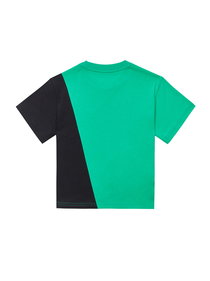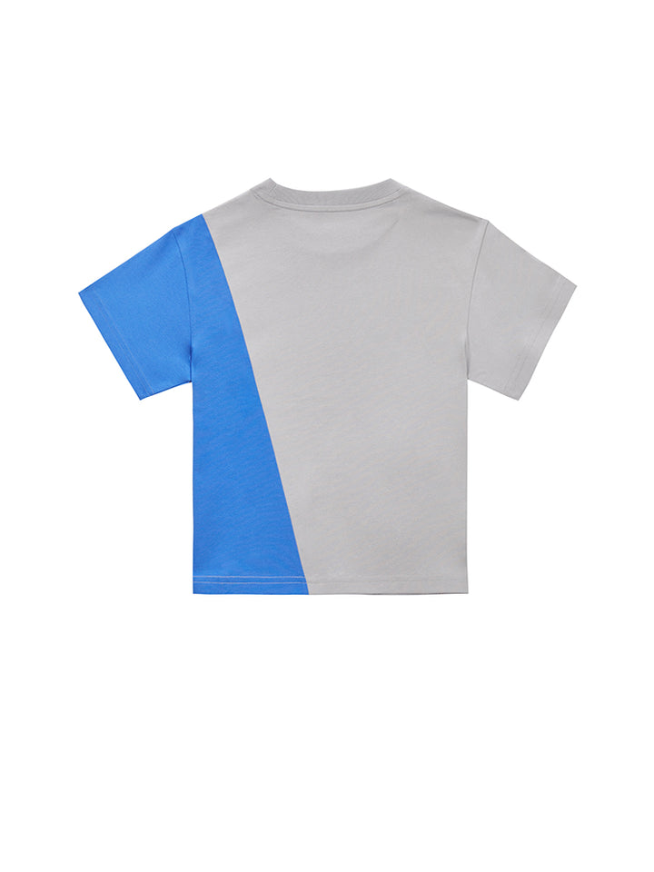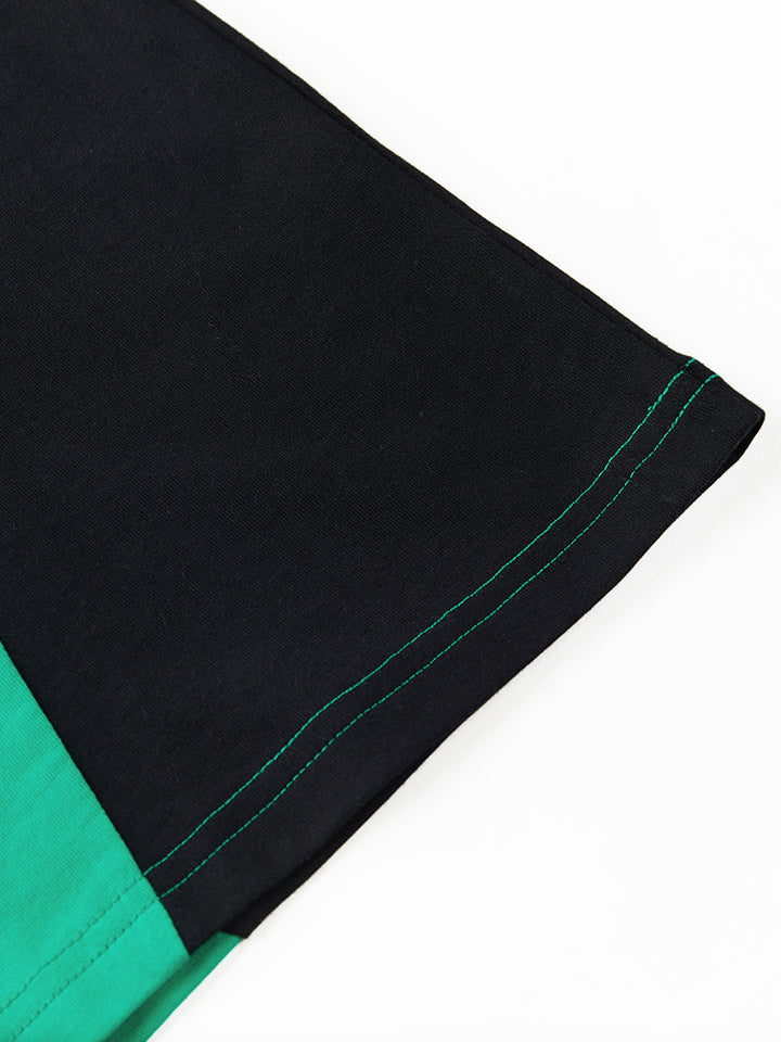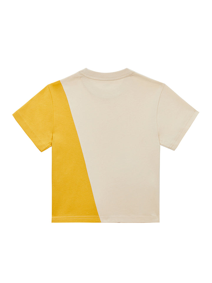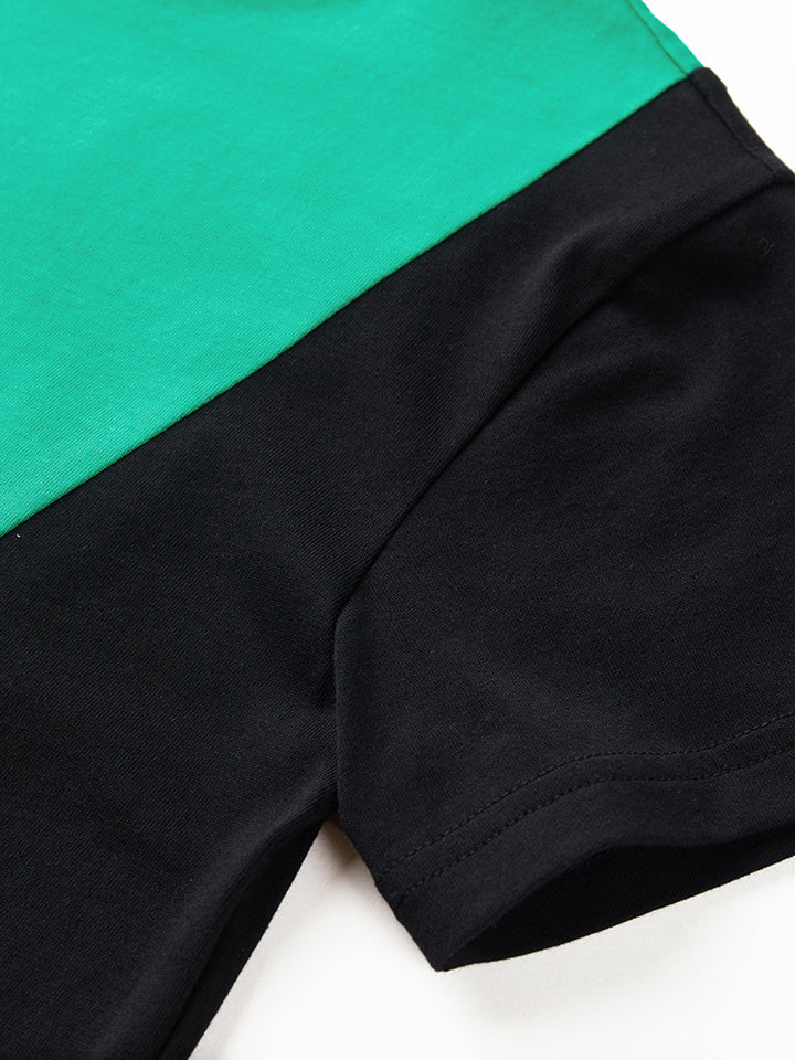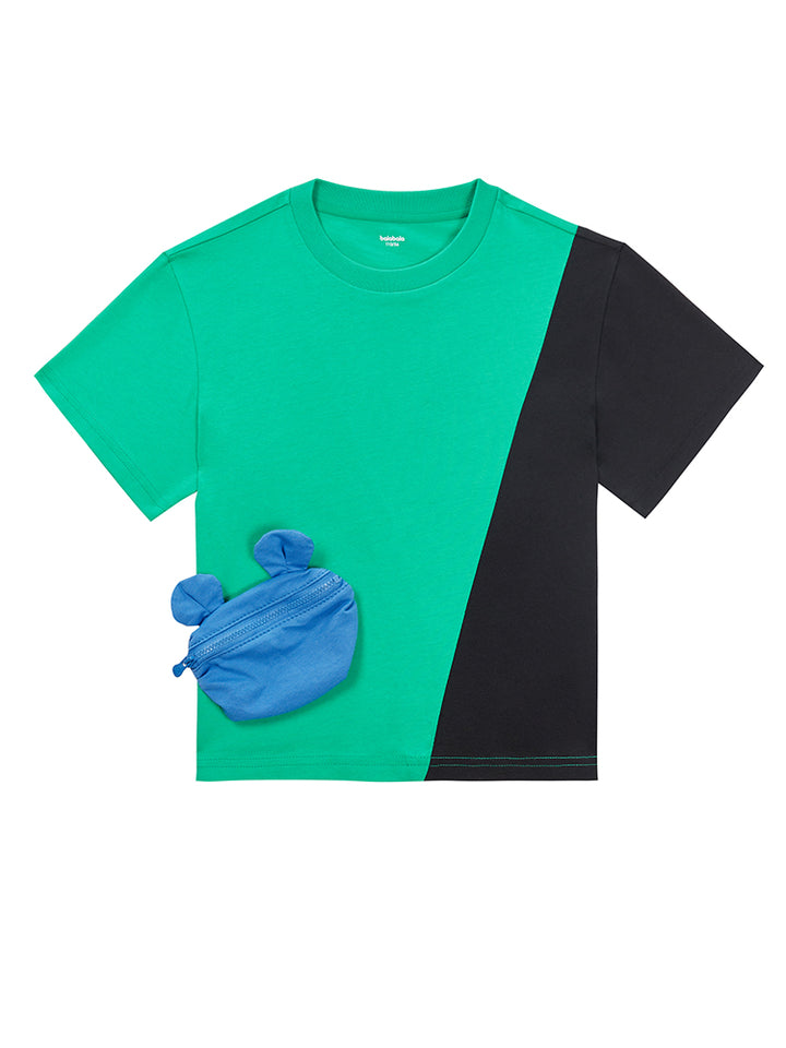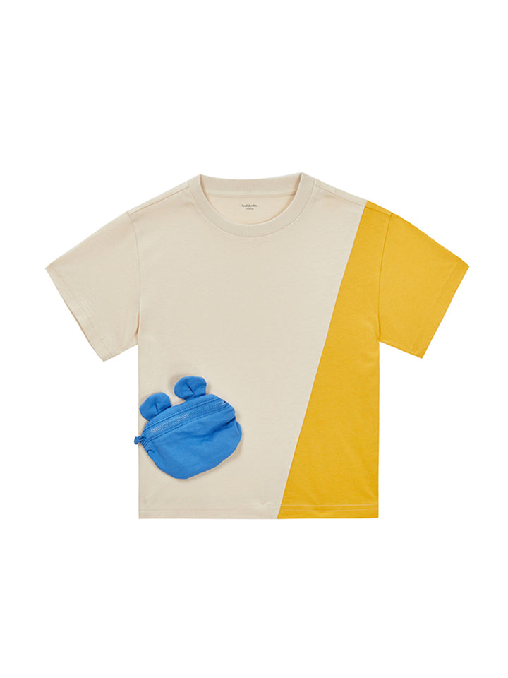 short sleeves casual t-shirt in a contrast colored pattern, decorated with a zipper pocket on the front side, comes with a rounded shape neckline
