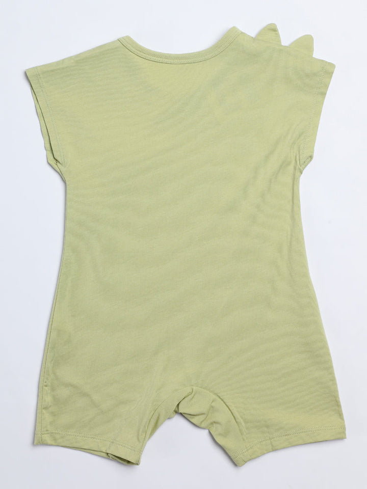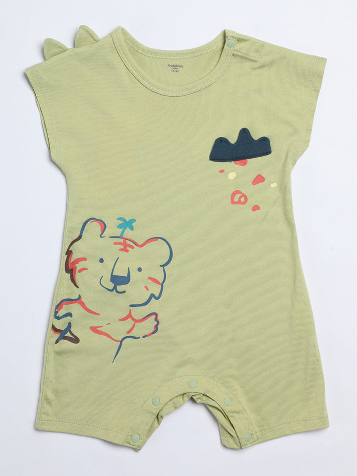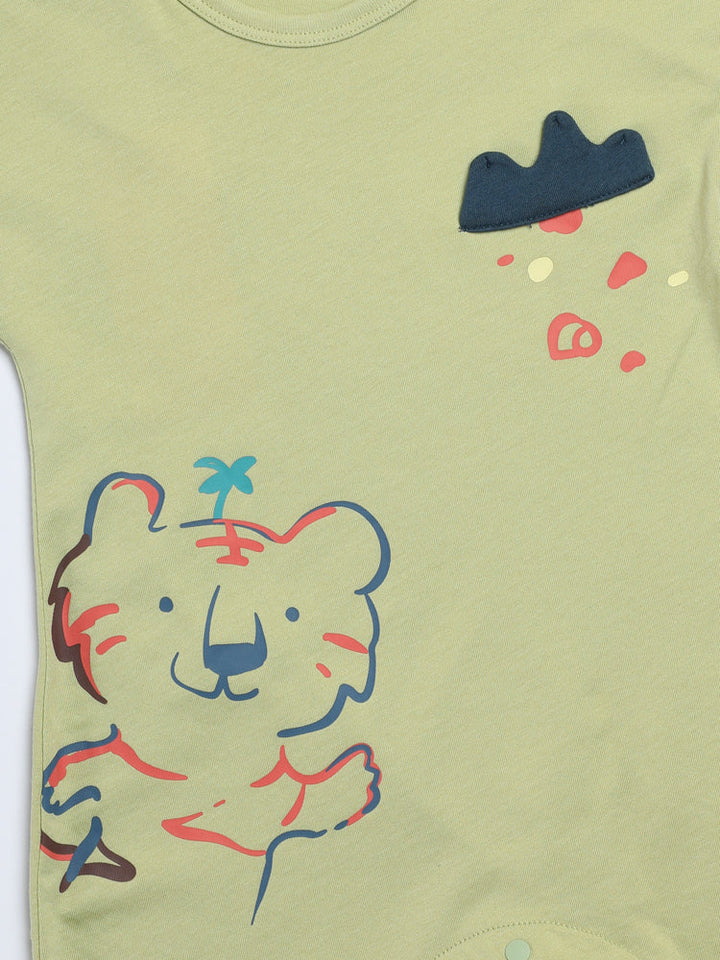 رومبر عملي للأطفال بأكمام قصيرة وياقة دائرية، مزين برسمة مرحة على الأمام. يتميز بأزرار كبس لسهولة الارتداء وتغيير الحفاض، ومصنوع من قماش خفيف ومتنفس يمنح الراحة اليومية.