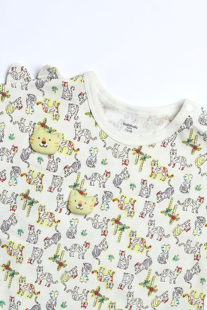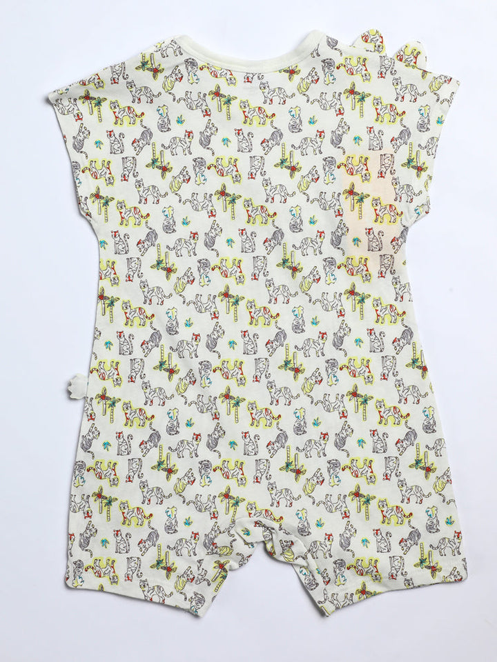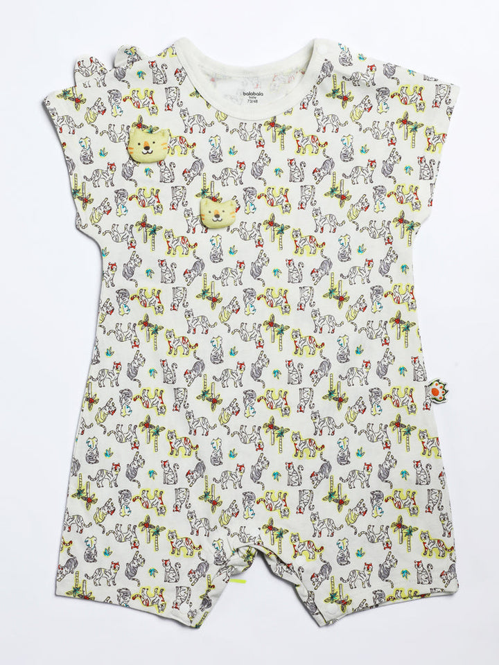 رومبر لطيف للأطفال بتصميم بأكمام قصيرة وياقة دائرية، مزين بطبعات حيوانات مرحة مع تفاصيل زخرفية بارزة. مزود بأزرار كبس لسهولة اللبس وتغيير الحفاض، مصنوع من قماش ناعم يوفر الراحة طوال اليوم.
