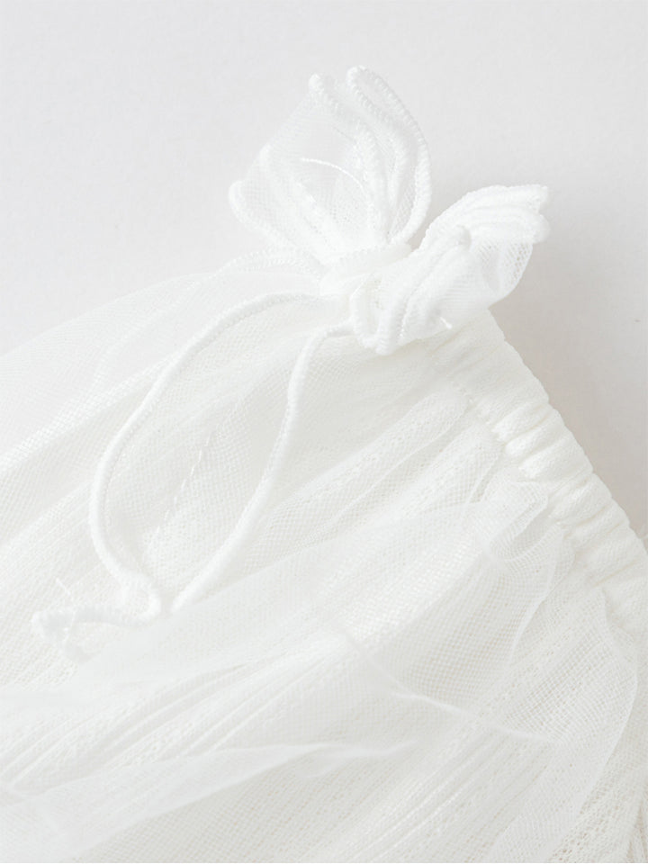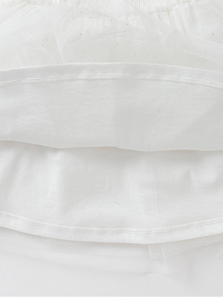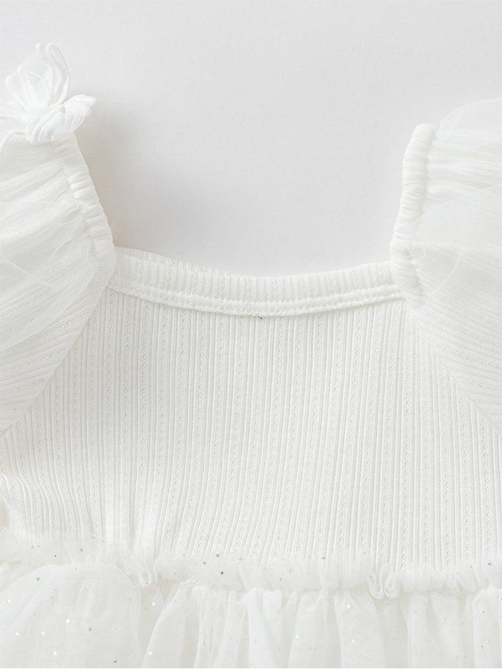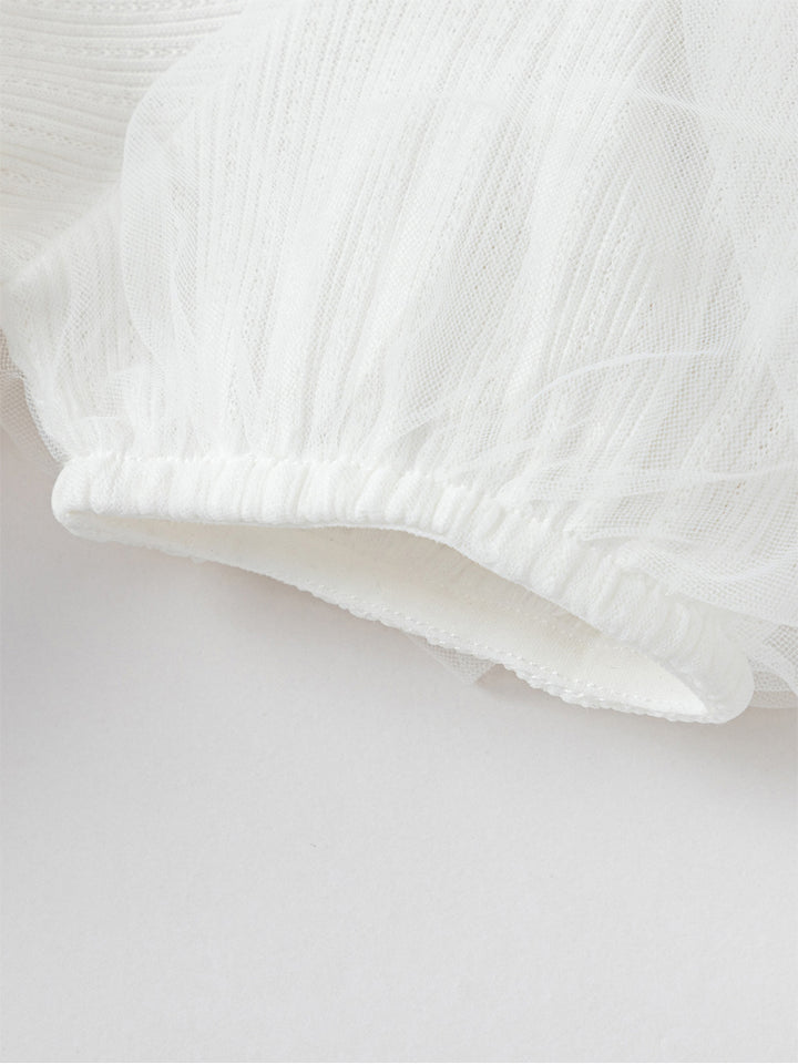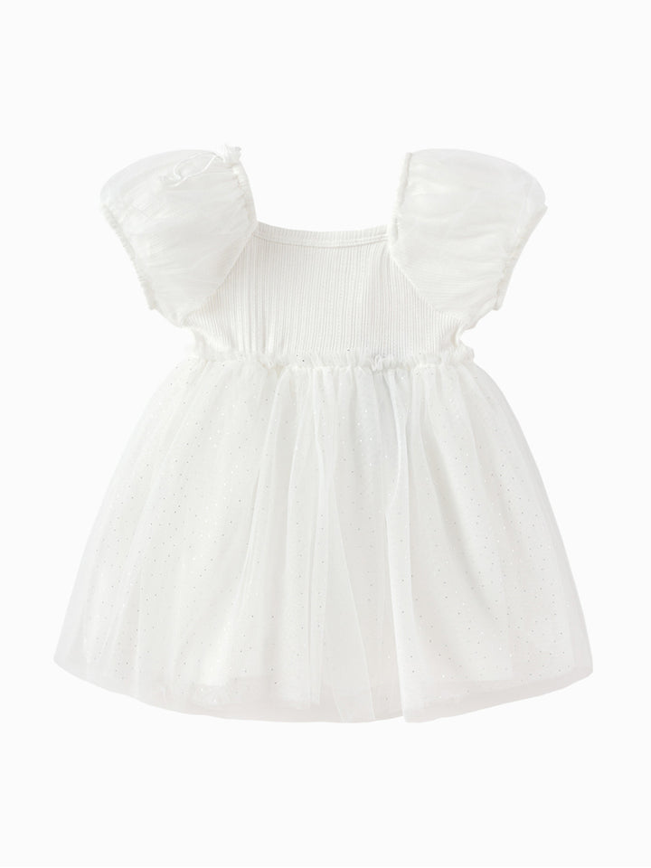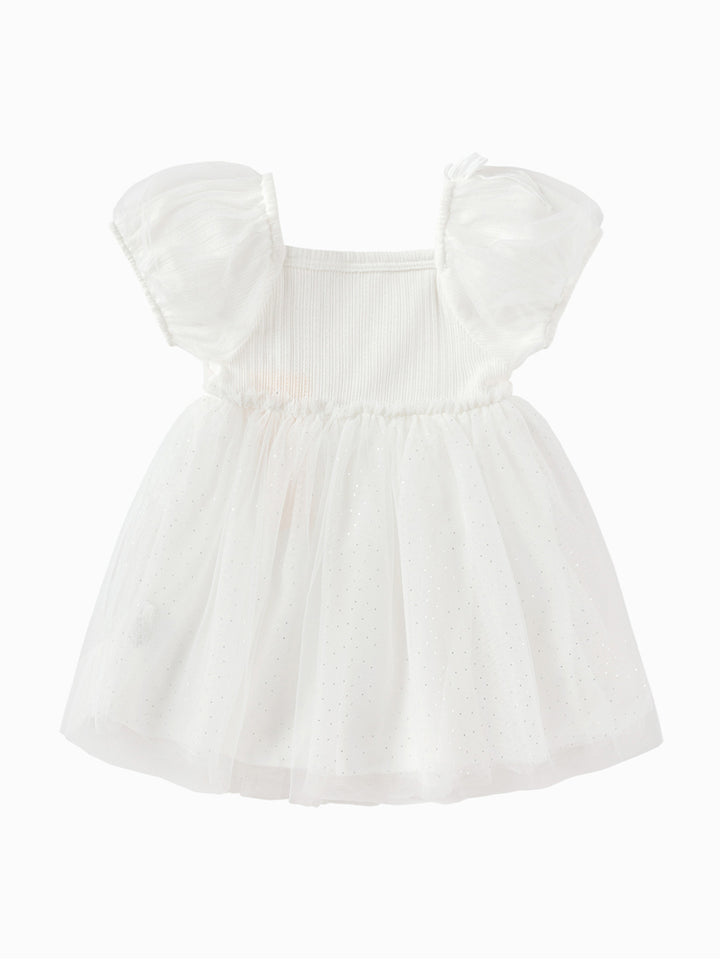 فستان بيبي بناتي بأكمام قصيرة بتمصيم ذو خامتين مختلفتين، مزين بستايل قماش أورغانزا على الجزء السفلي وبخامة نسيج منقوشة من الجزء العلوي، يأتي بأكمام منفوخة وبياقة مستقيمة الشكل