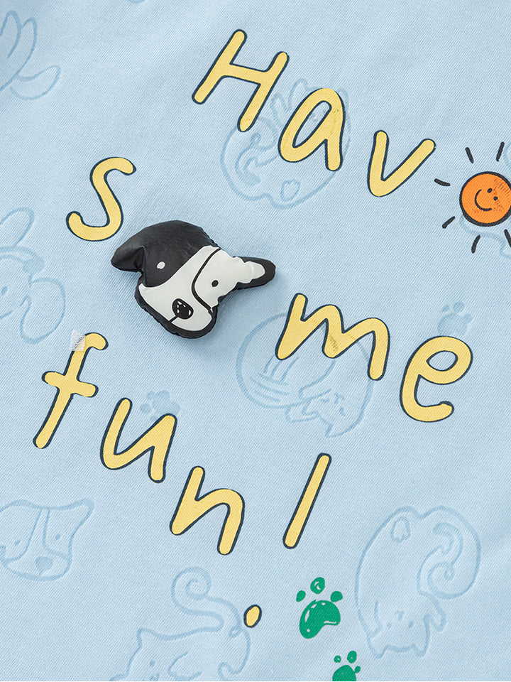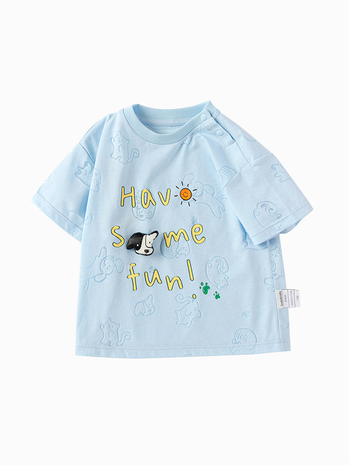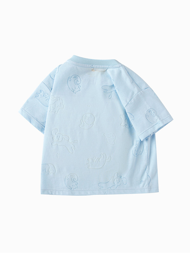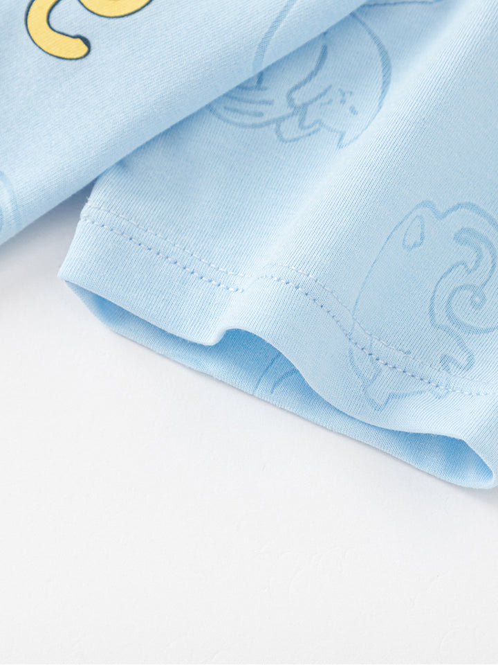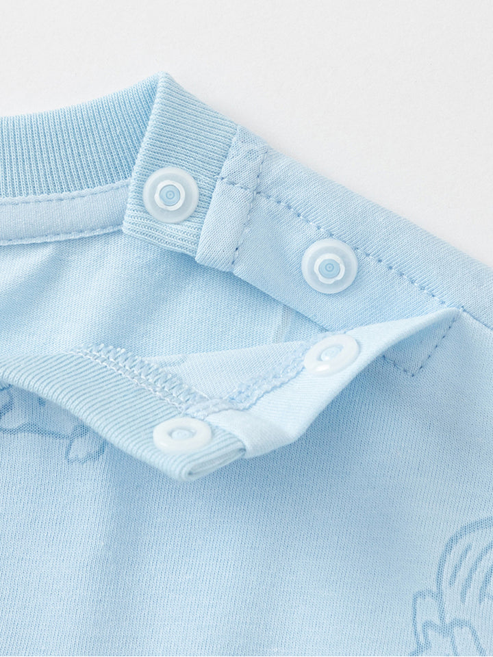 تيشيرت بيبي ولادي بأكمام قصيرة مزين بنمط طبعات على كامل التصميم وطبعة من الجهة الأمامية، يأتي بأزرار للإغلاق على أحد الأكتاف وبياقة مدورة الشكل