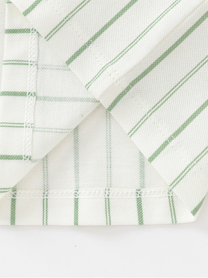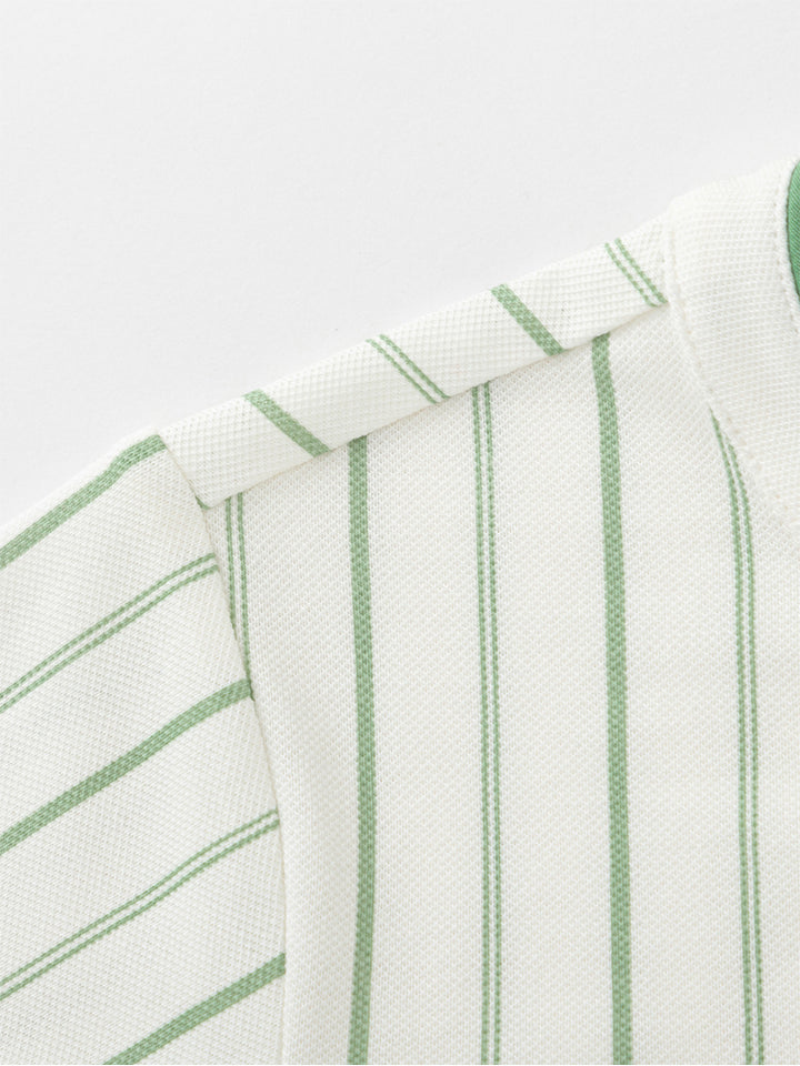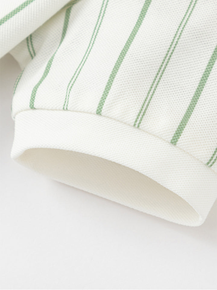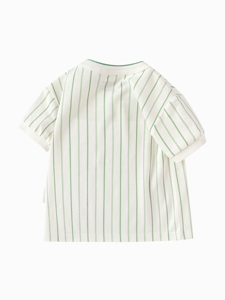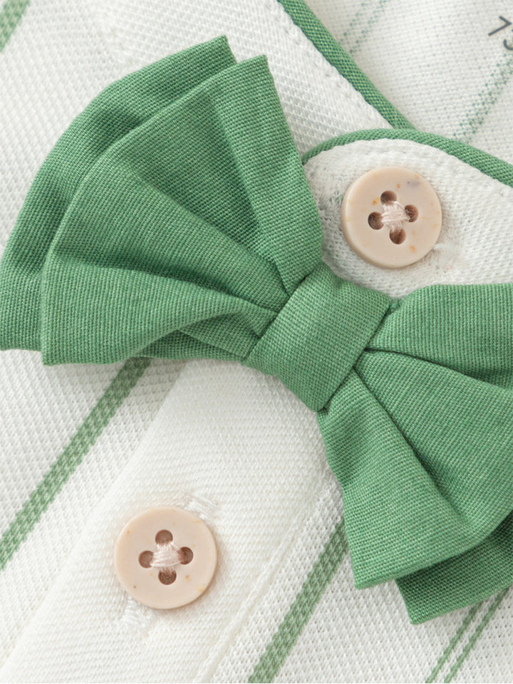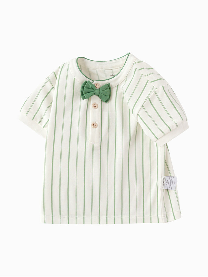 تيشيرت بيبي ولادي بأكمام قصيرة مزين بنمط مخطط على كامل التصميم وتفاصيل ببيونة من الجهة الأمامية، يأتي بأزرار للإغلاق من الجهة الأمامية وبياقة مدورة الشكل