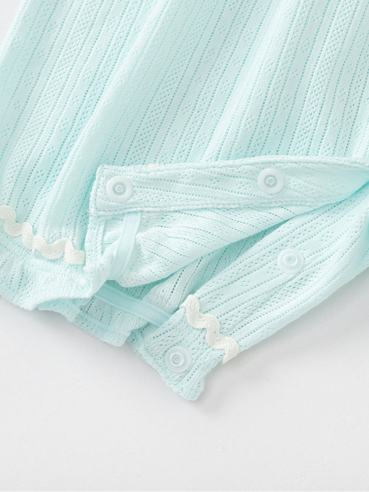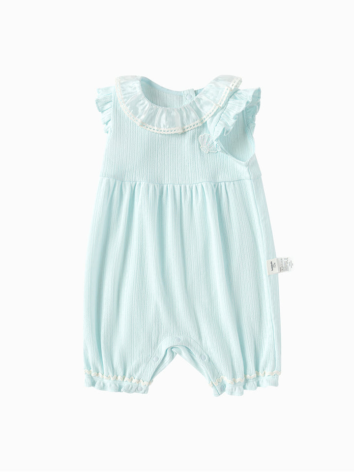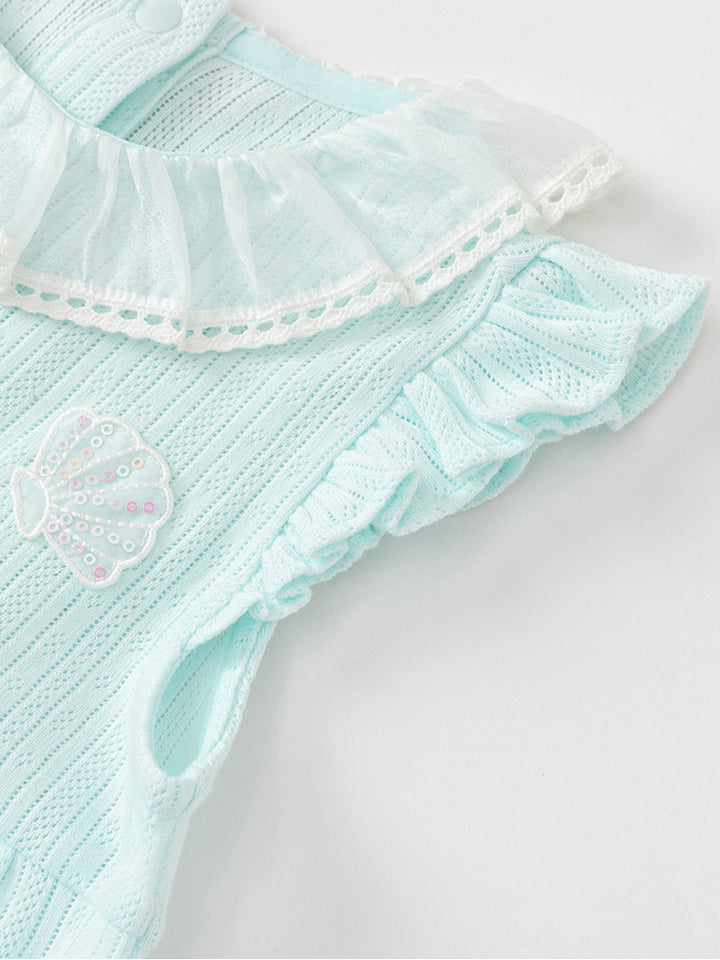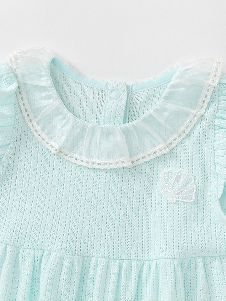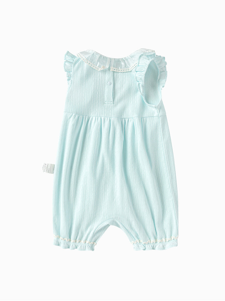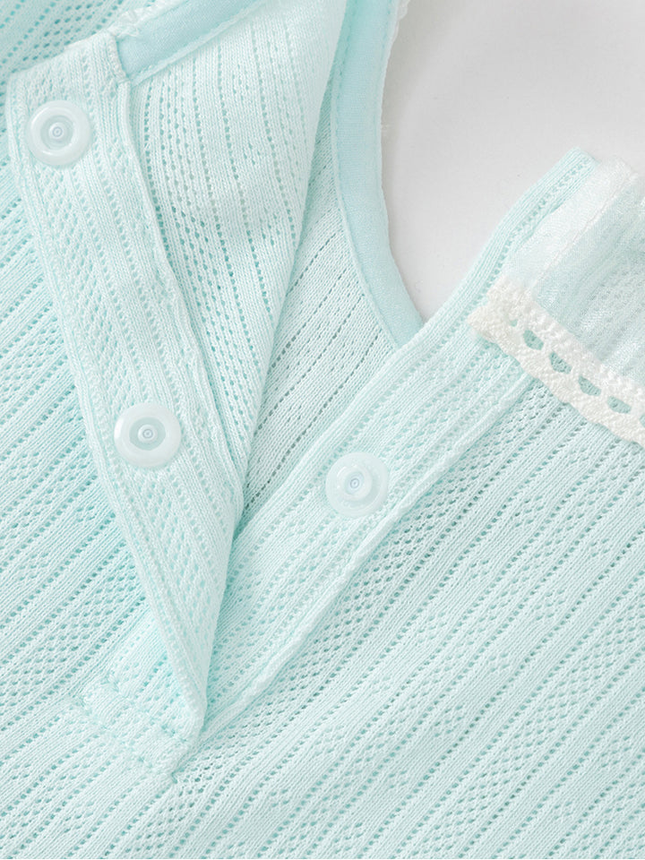 أفرهول بيبي بناتي بدون أكمام، مزين بخامة نسيج منقوشة وتفاصيل رقعة صغيرة على الصدر من الجهة الأمامية، يأتي بأزرار كبس للإغلاق من الجهة الخلفية وبياقة مدورة الشكل