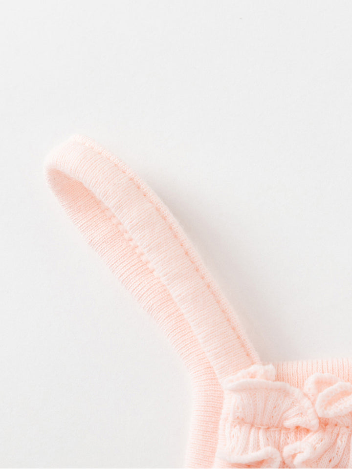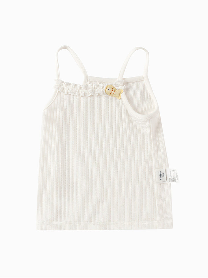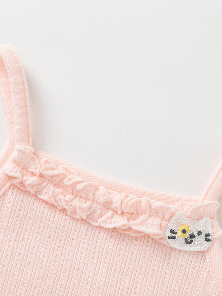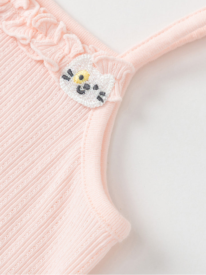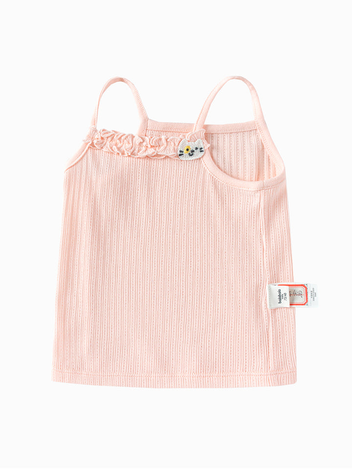 تيشيرت بيبي بناتي بدون أكمام وبحمالات كتف رفيعة، مزين بخامة نسيج منقوشة وتفاصيل رقعة صغيرة من الجهة الأمامية، يأتي بياقة مستقيمة الشكل