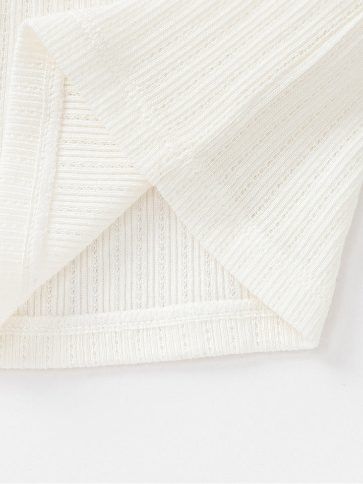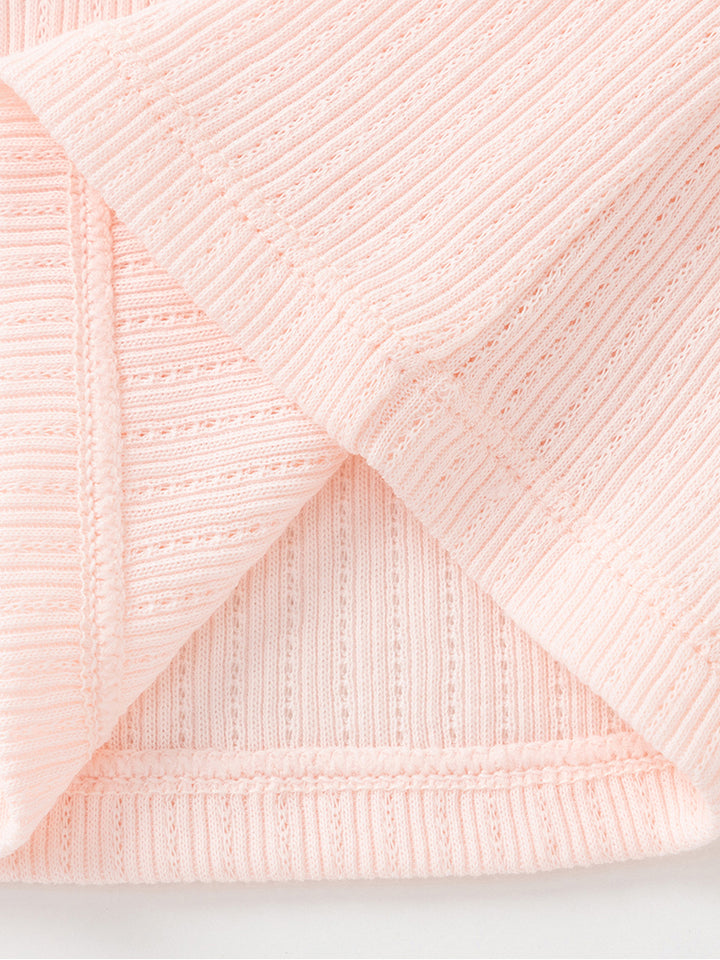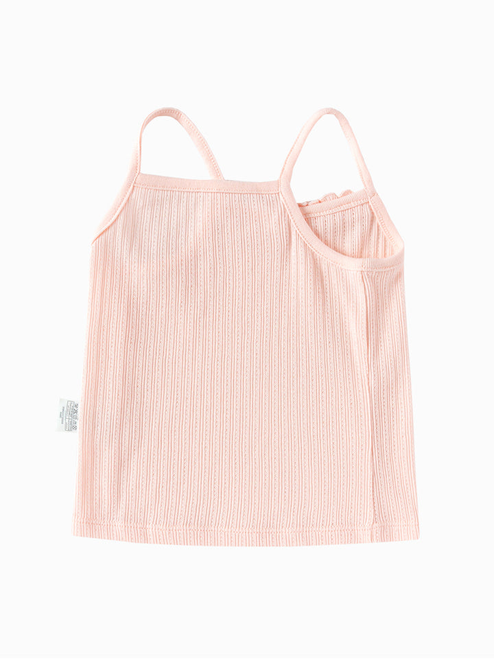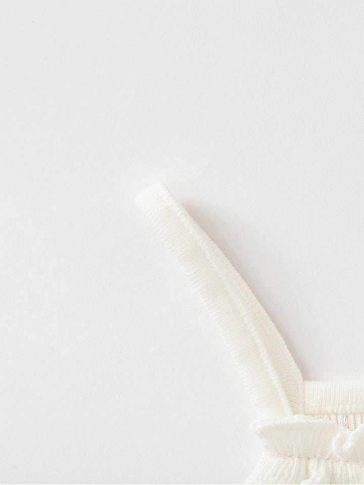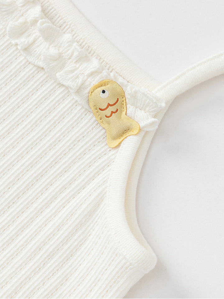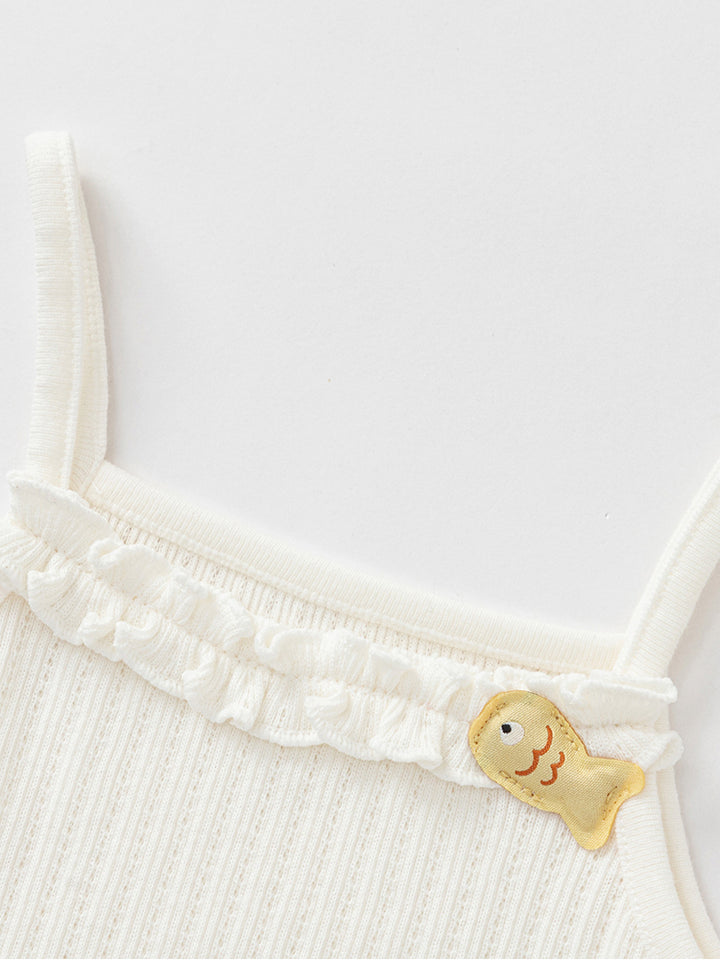 تيشيرت بيبي بناتي بدون أكمام وبحمالات كتف رفيعة، مزين بخامة نسيج منقوشة وتفاصيل رقعة صغيرة من الجهة الأمامية، يأتي بياقة مستقيمة الشكل