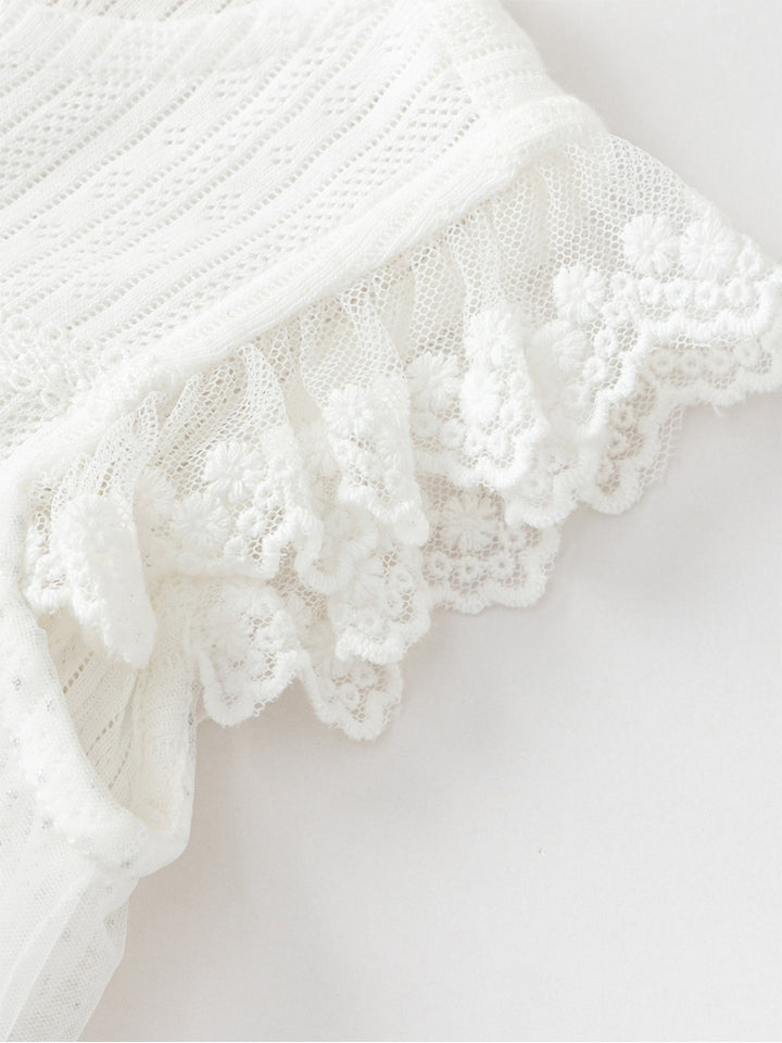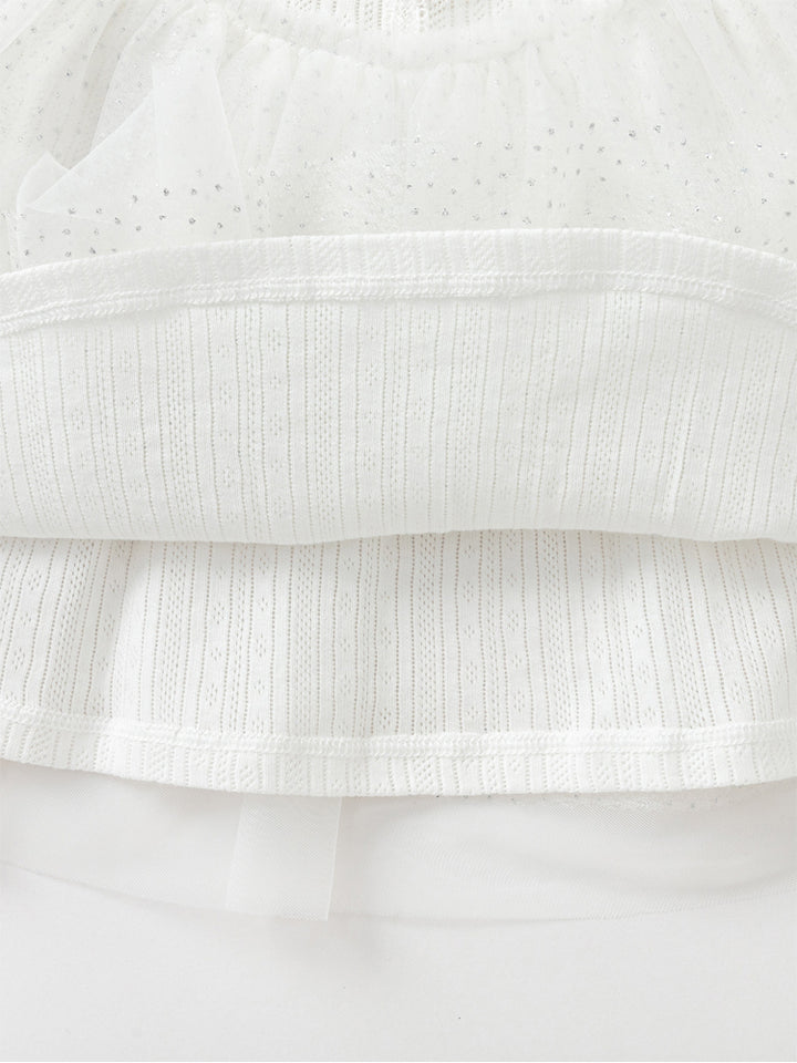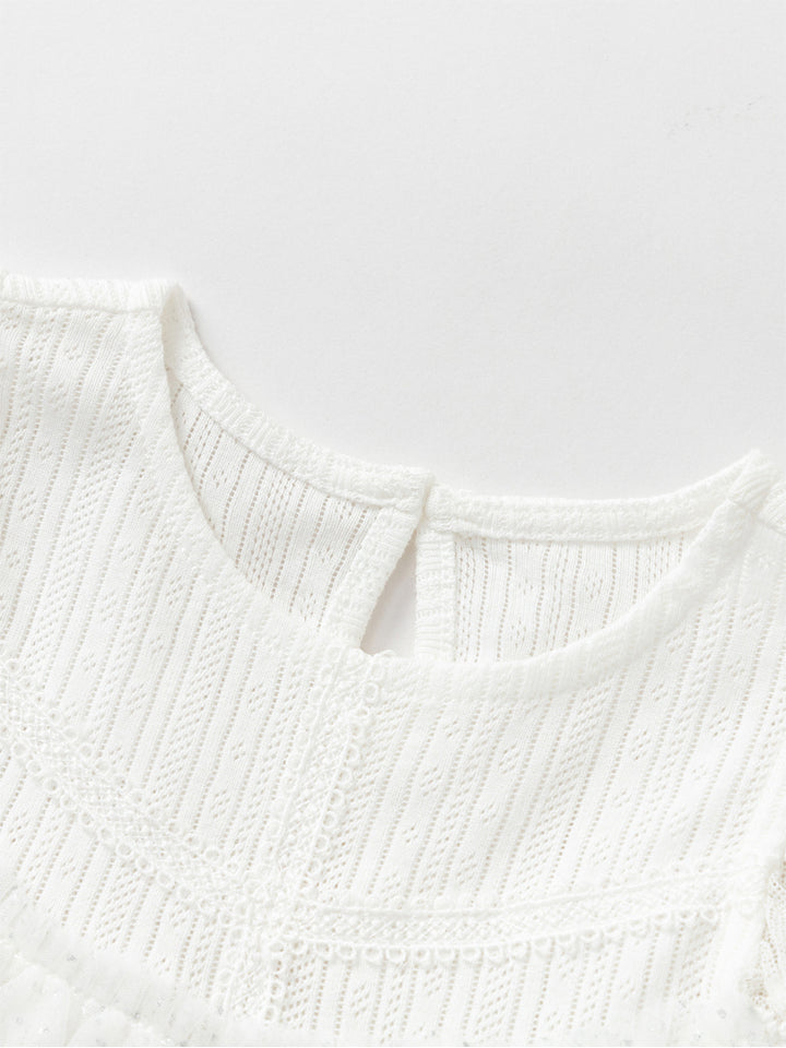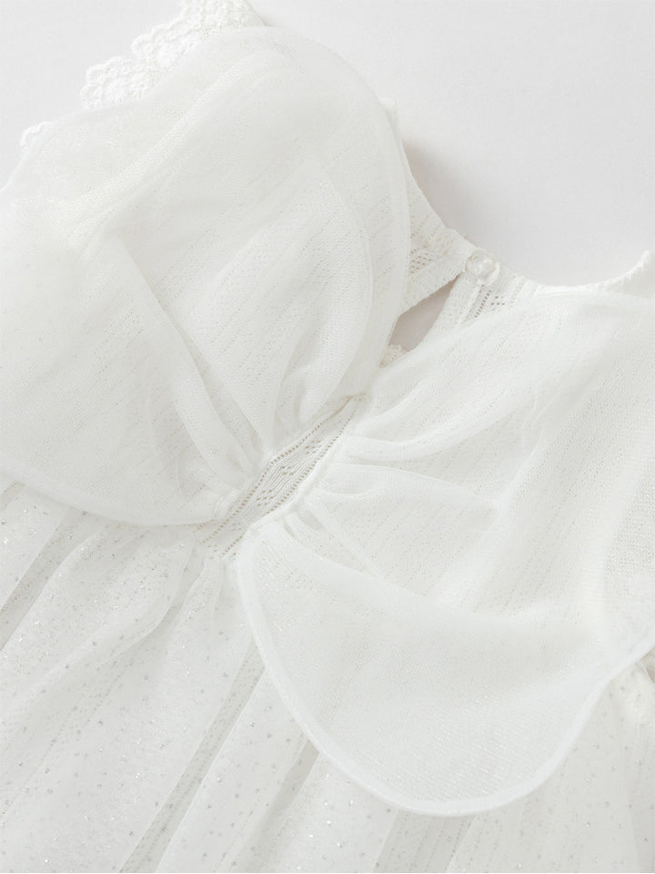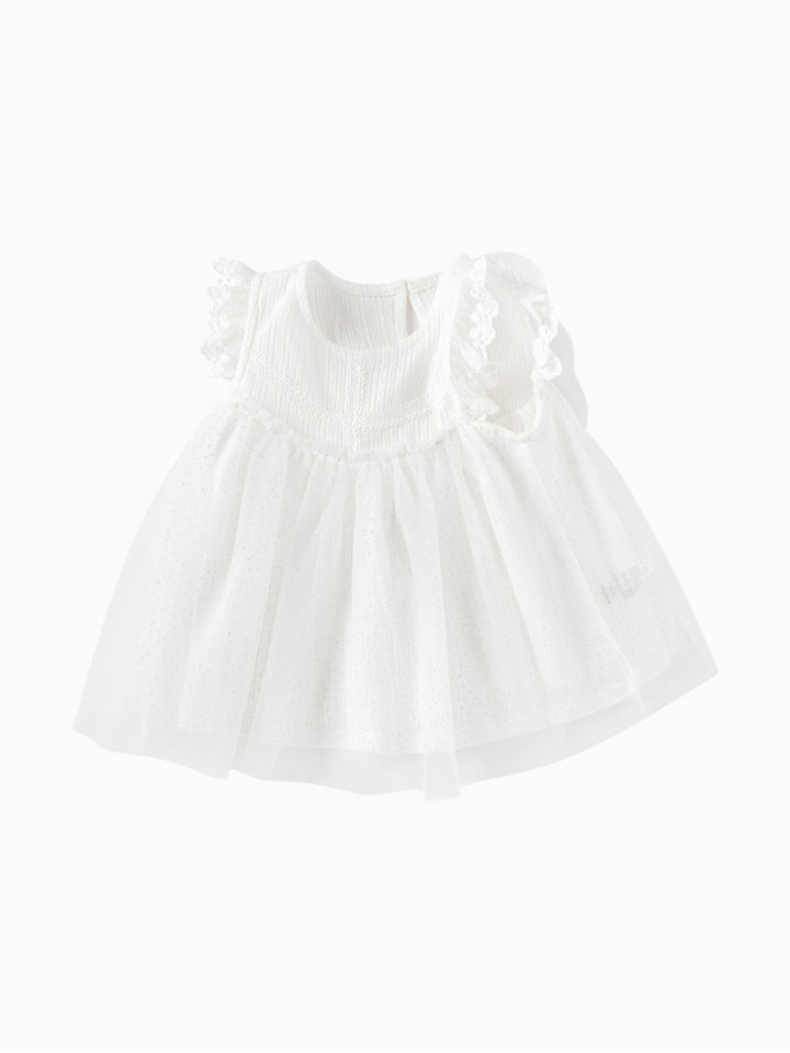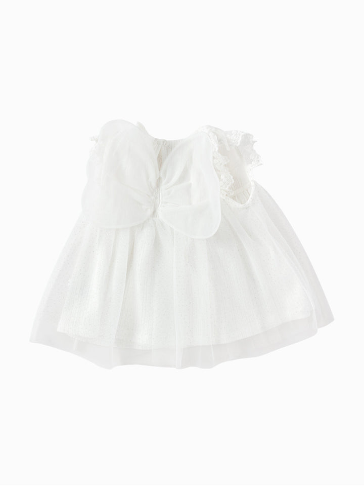 فستان بناتي بدون أكمام وتصميم فضفاض واسع، مزين بنمط خامة نسيج منقوشة وتفاصيل على شكل أجنحة فراشة من الجهة الخلفية، يأتي بزر للإغلاق من الجهة الخلفية وبياقة مدورة الشكل