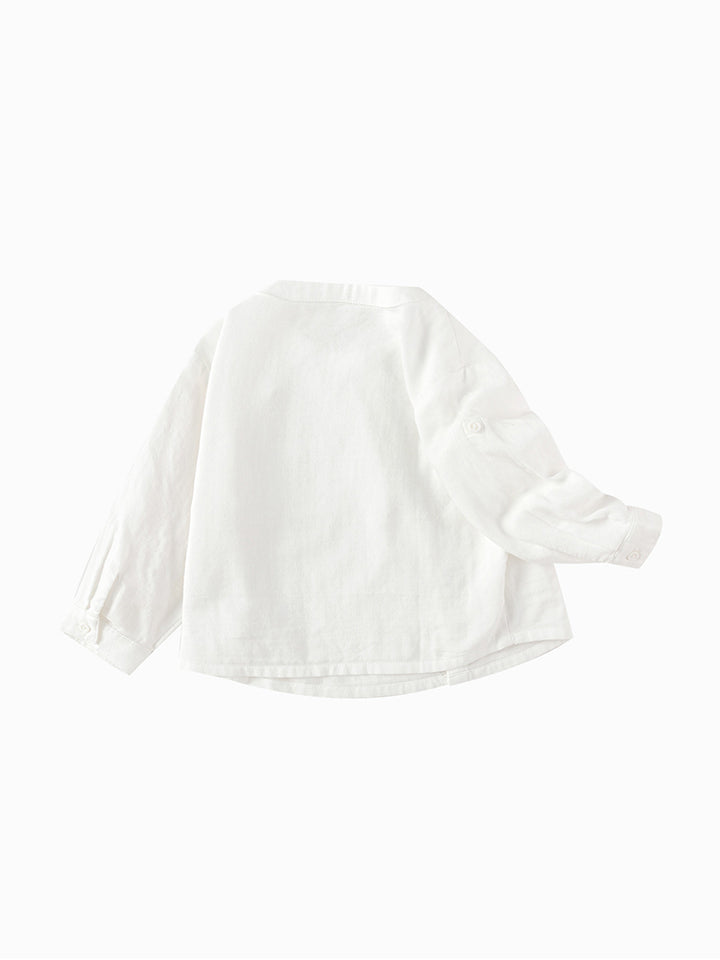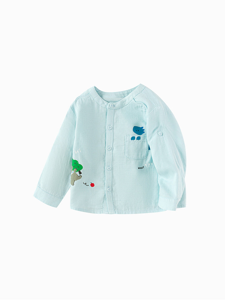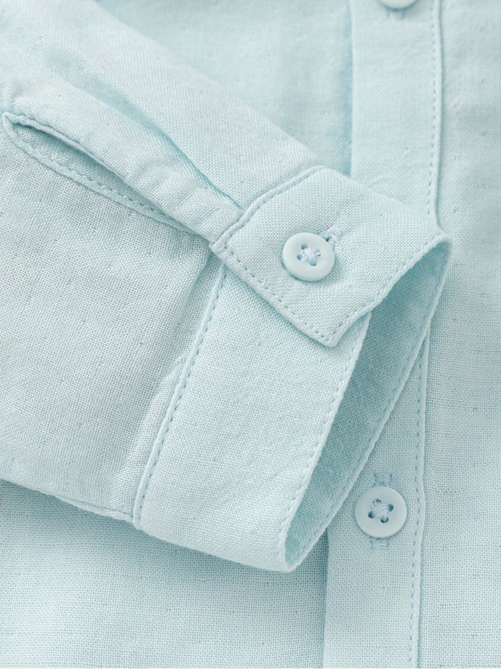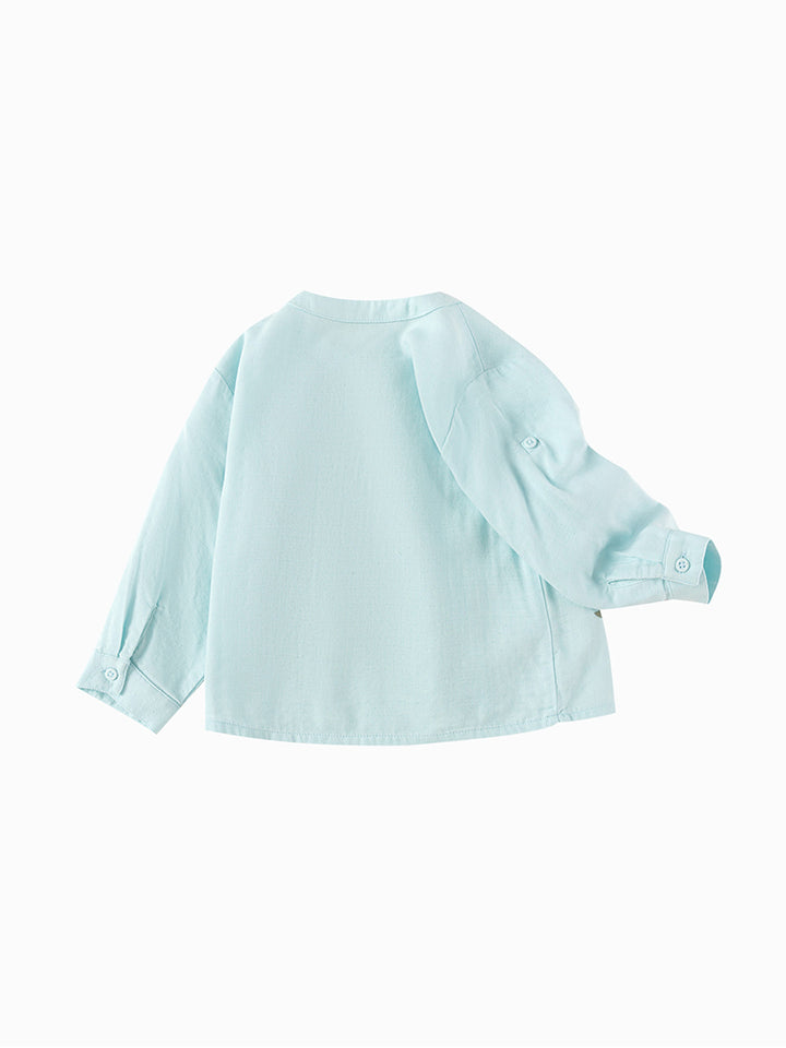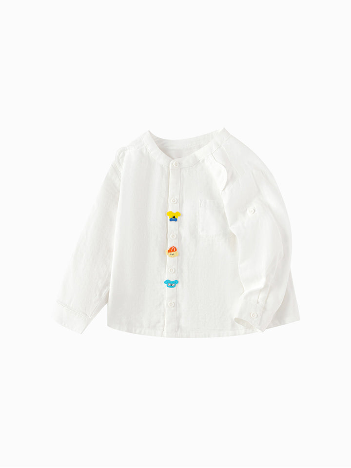 قميص بأكمام طويلة ونمط لون موحد، يأتي بأزرار ملونة للإغلاق من الجهة الأمامية وبياقة مدورة
