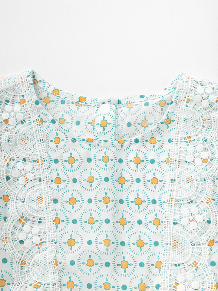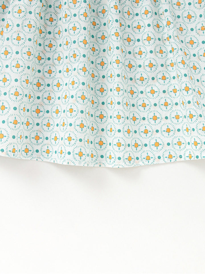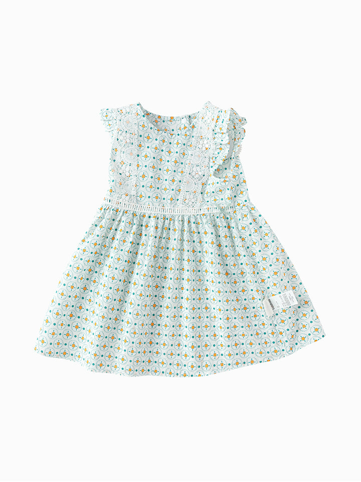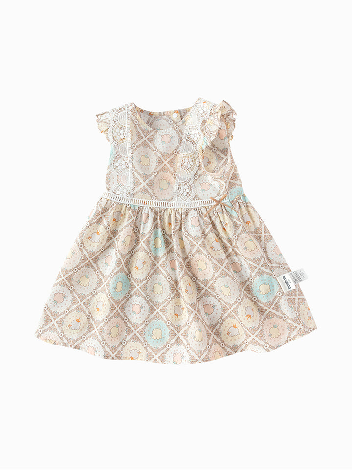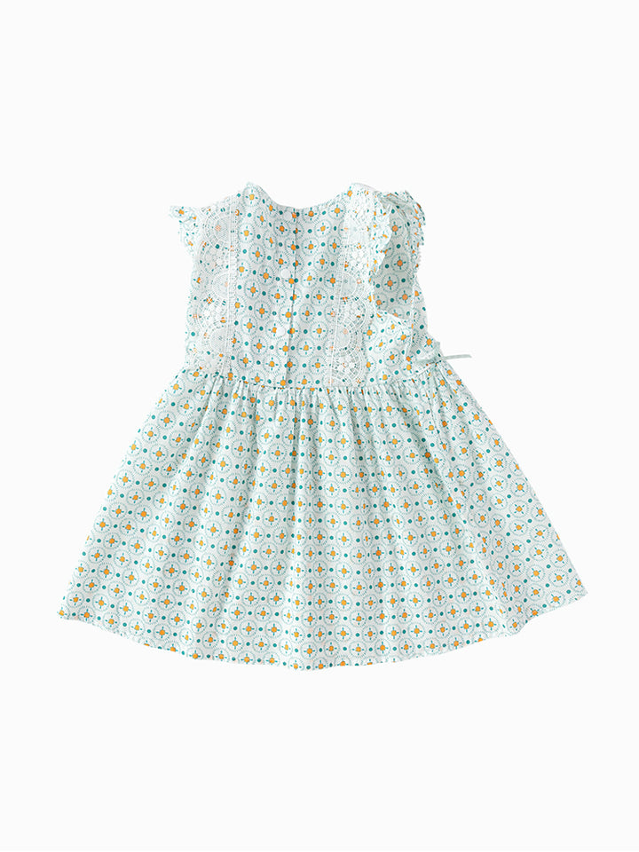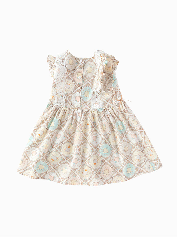 فستان فضفاض بدون أكمام ومزين بنمط طبعات، يأتي بأزرار للإغلاق من الجهة الخلفية وبياقة مدورة الشكل