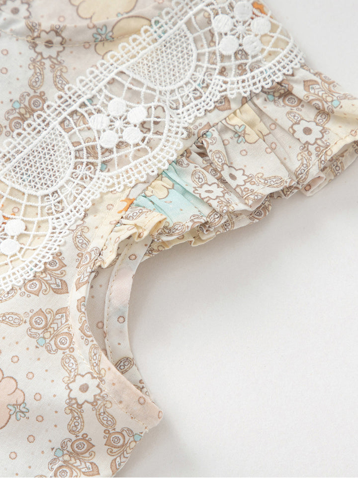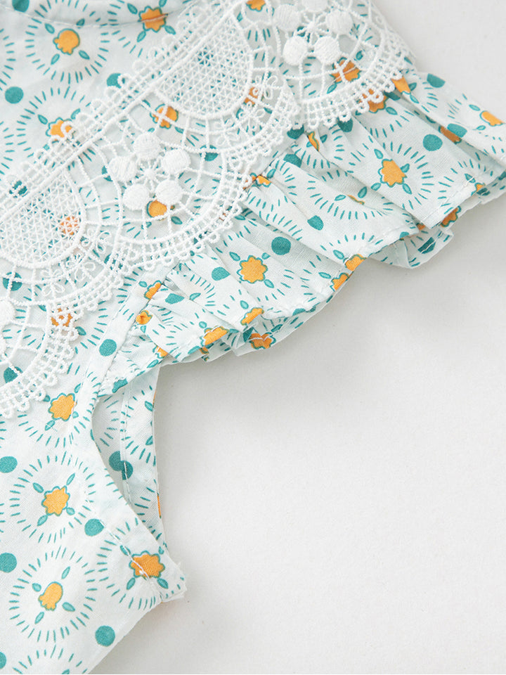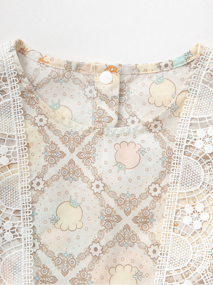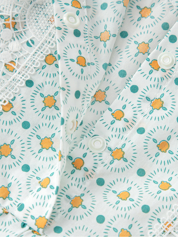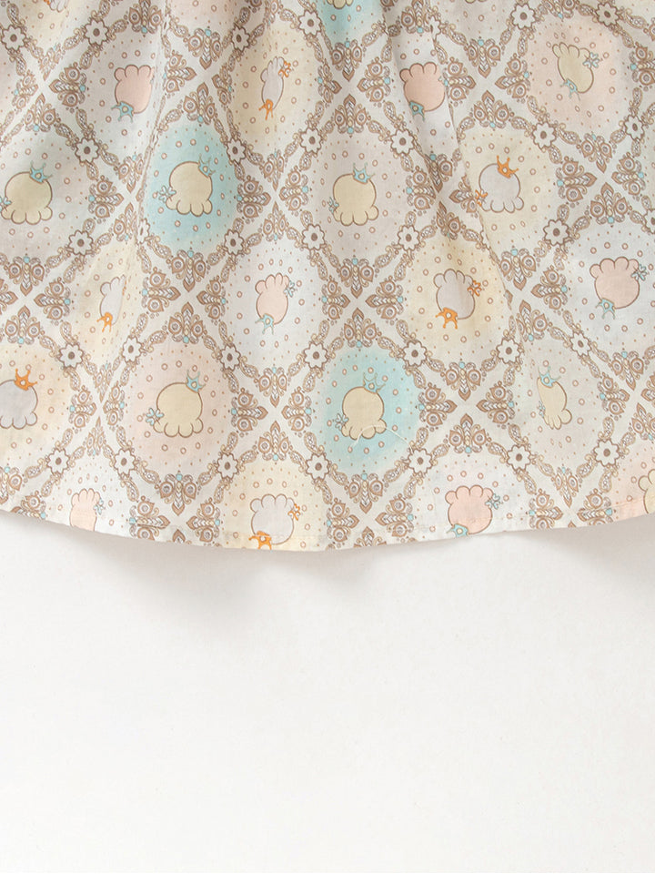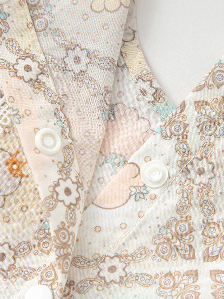 فستان فضفاض بدون أكمام ومزين بنمط طبعات، يأتي بأزرار للإغلاق من الجهة الخلفية وبياقة مدورة الشكل