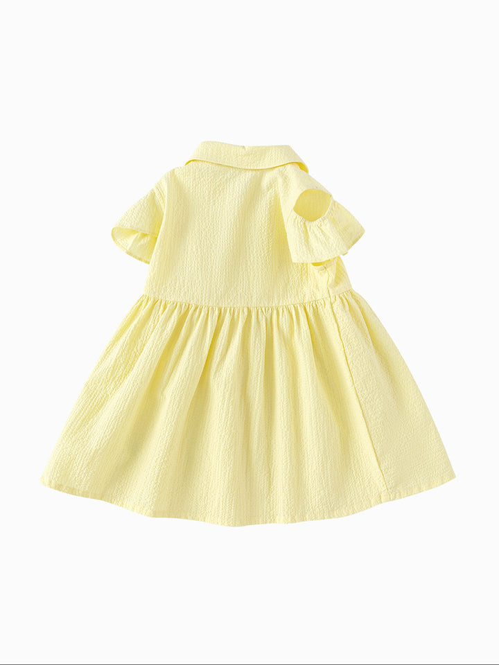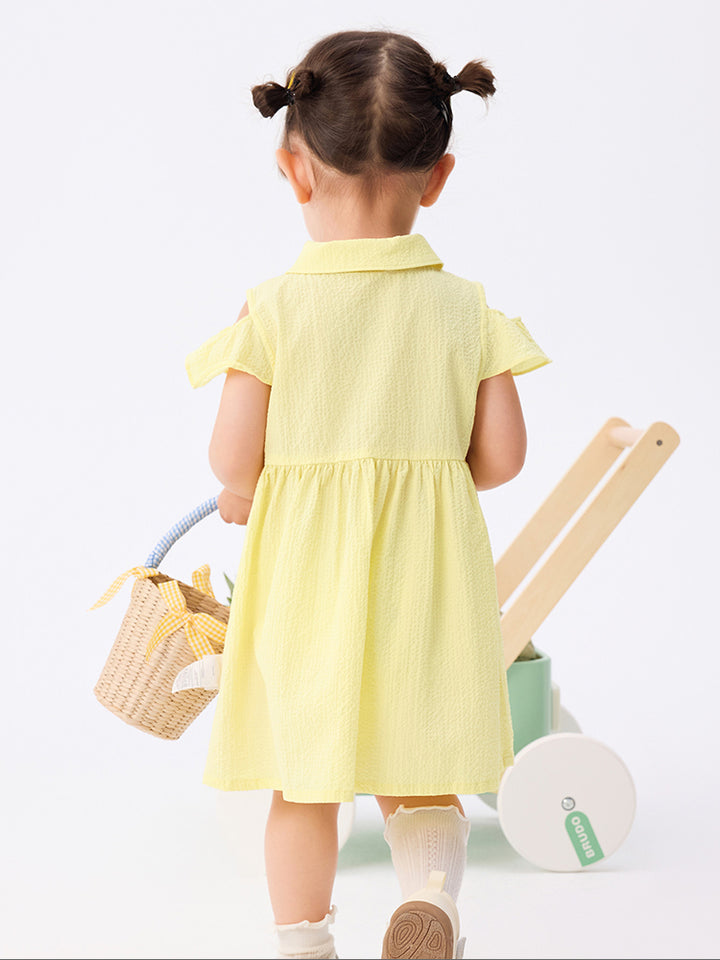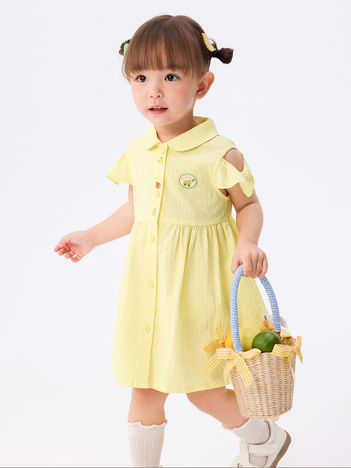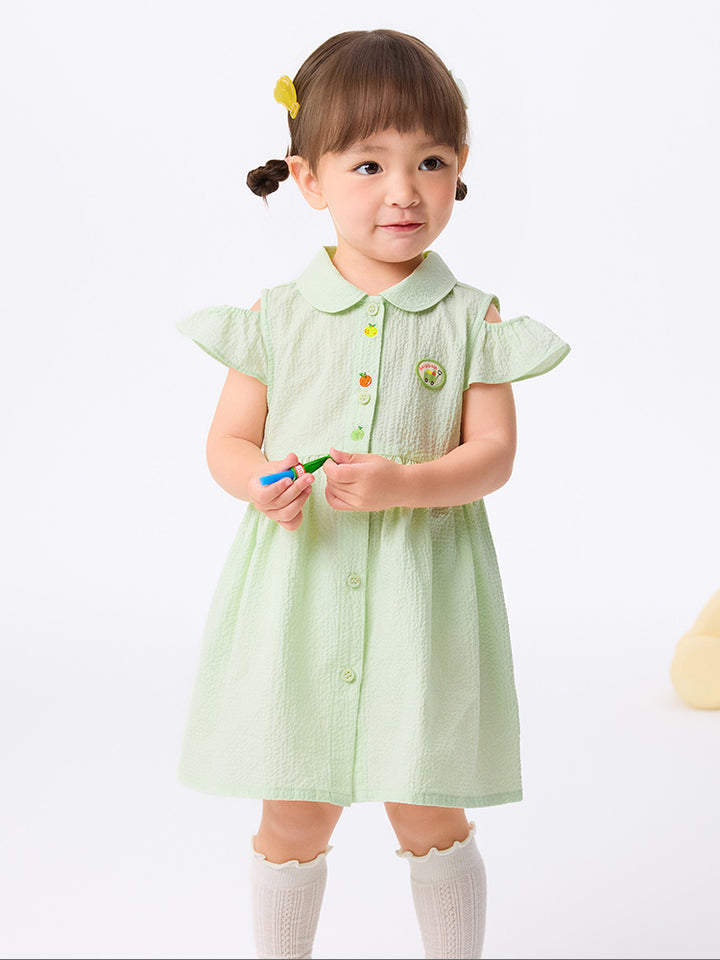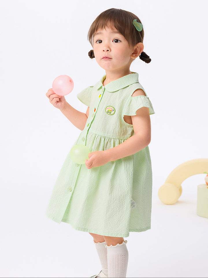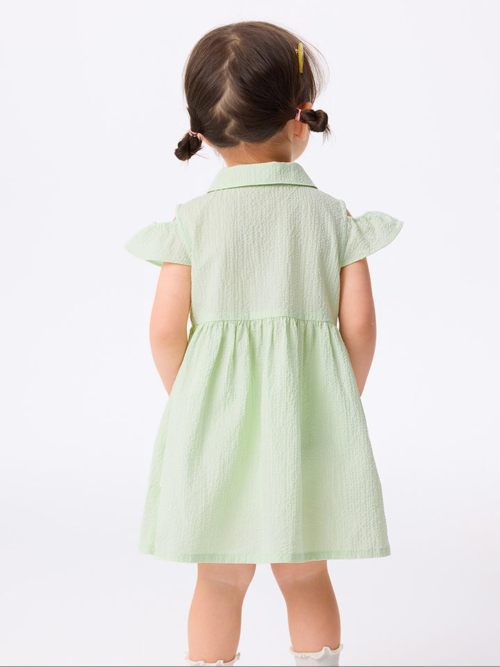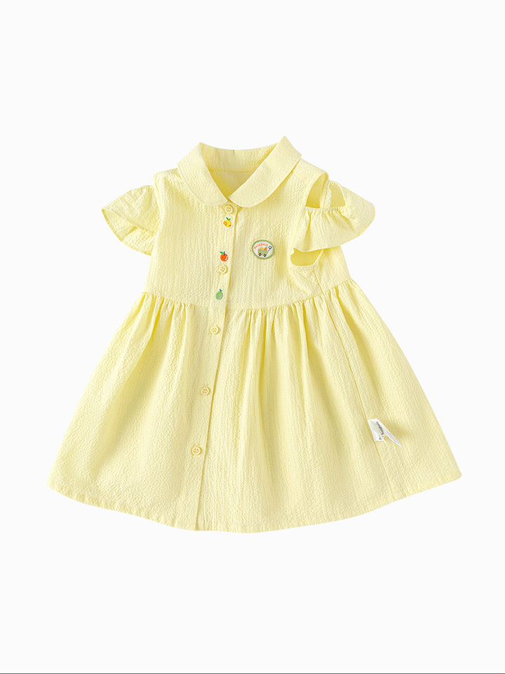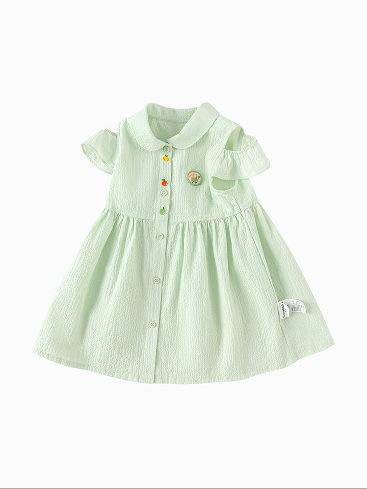 فستان أطفال أنيق يتميز بـ تطريز صغير، فتحة على الكتف عصرية، و أزرار أمامية لسهولة اللبس. تضيف الياقة الكلاسيكية لمسة من الأناقة، مما يجعله مثاليًا للخروجات العائلية والمناسبات.
