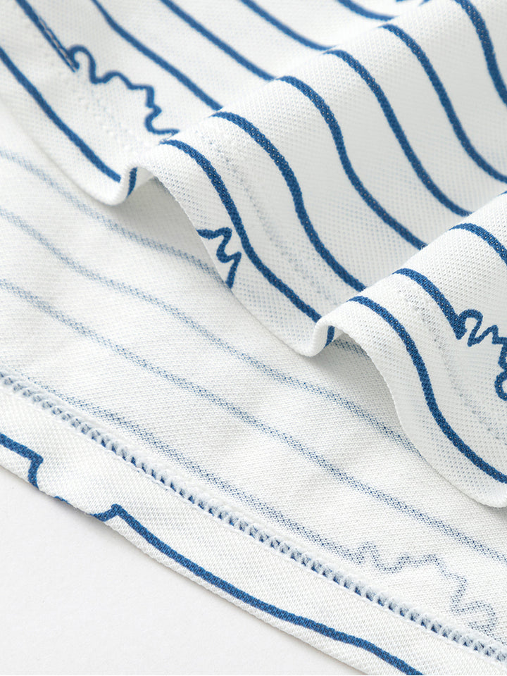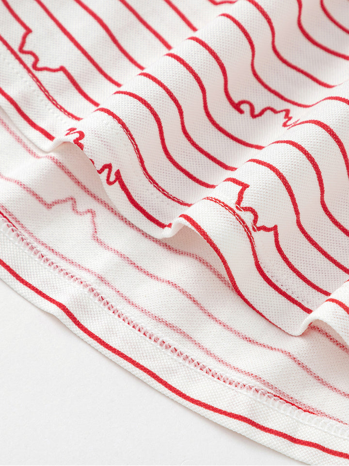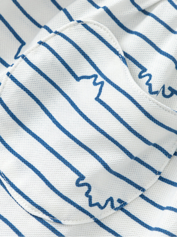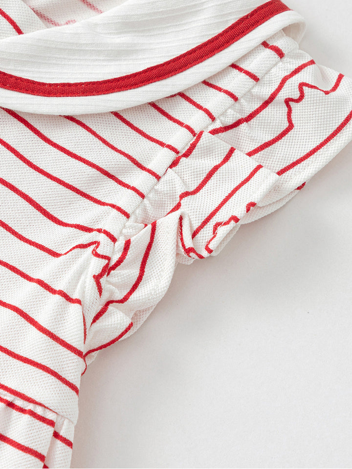 فستان فضفاض بأكمام قصيرة، مزين بنمط مخطط متباين اللون، يأتي بأزرار للإغلاق من الجهة الخلفية وبياقة كلاسيكية مطوية