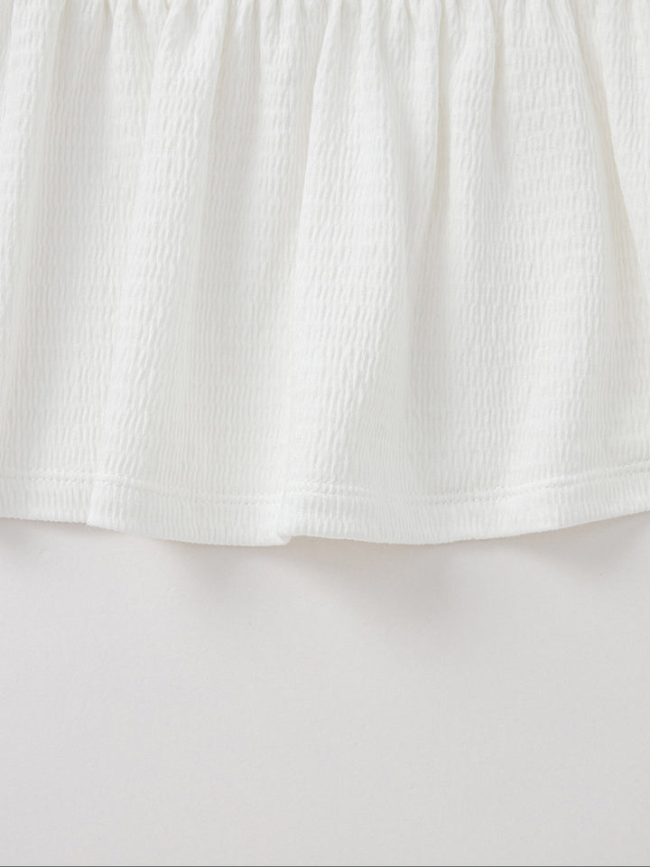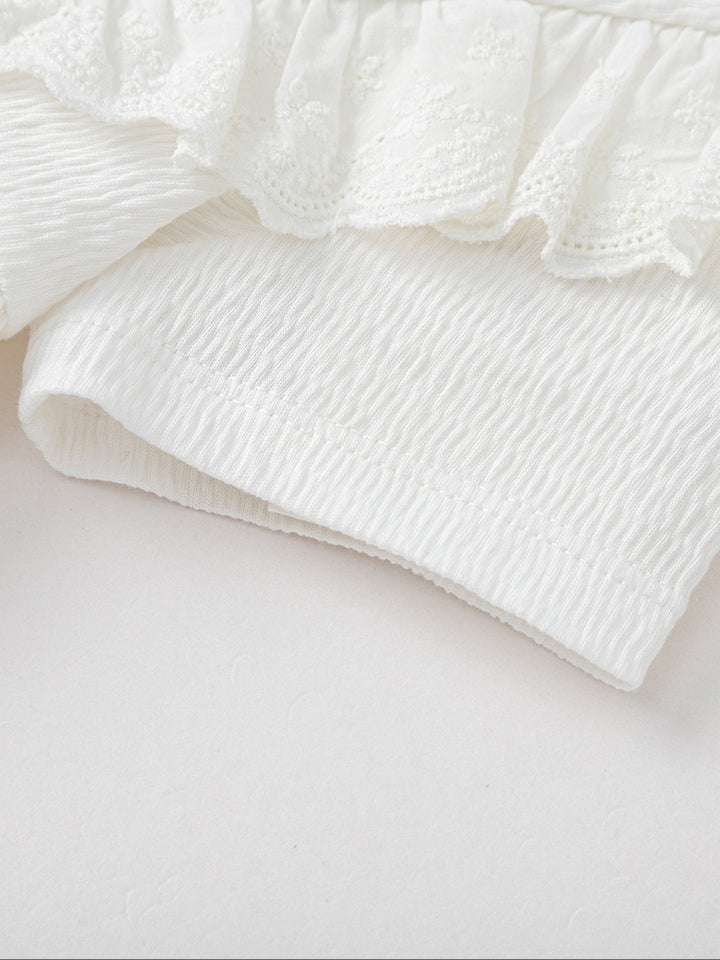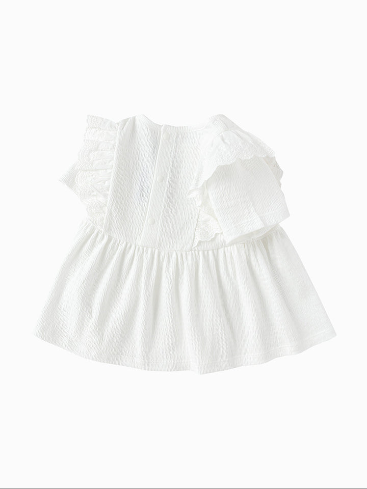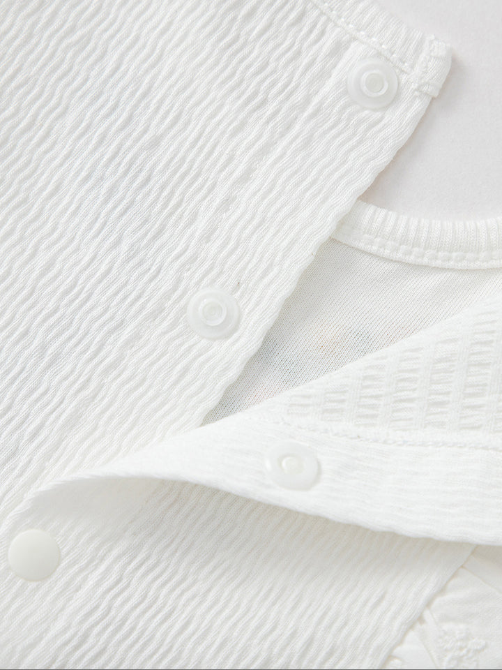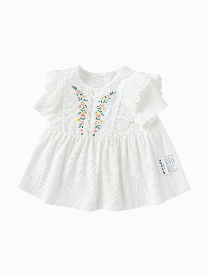 تيشيرت للرضع بأكمام قصيرة مزين بـ تطريز دقيق و كشكش على الأكمام لإضفاء لمسة أنثوية لطيفة. الياقة الدائرية توفر مظهرًا مريحًا وكلاسيكيًا، مما يجعله مثاليًا للاستخدام اليومي. سهل التنسيق مع شورتات أو سراويل مريحة، وهو مثالي للنزهات أو الأوقات المريحة في المنزل. القماش الناعم يضمن راحة طوال اليوم