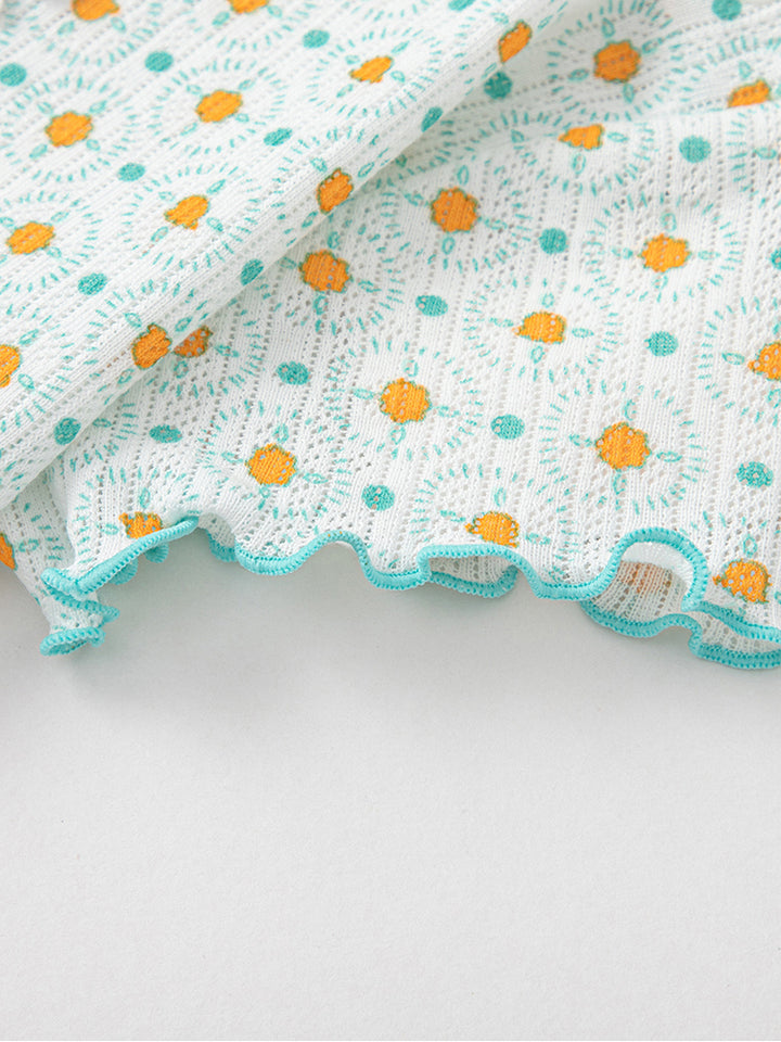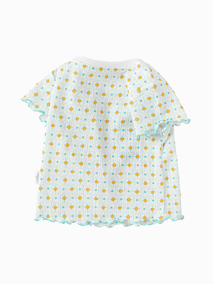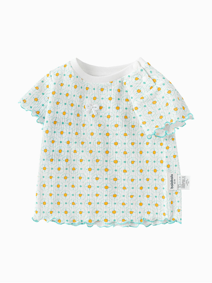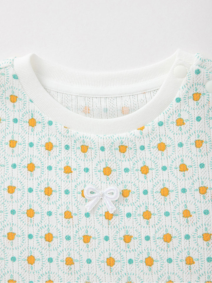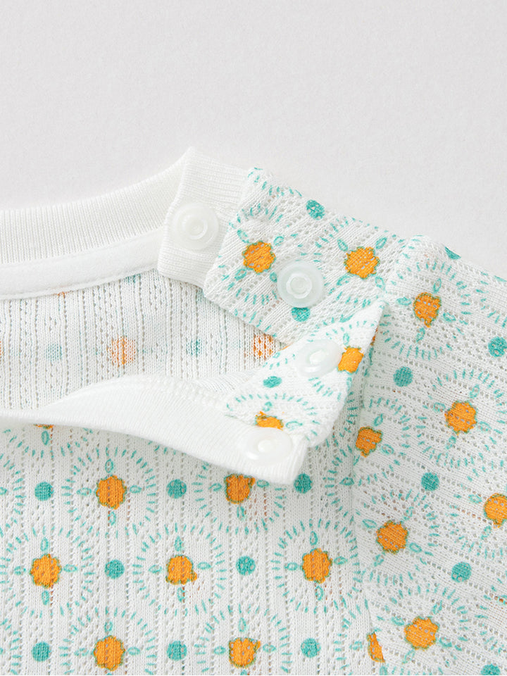 تيشيرت بأكمام قصيرة، مزين بنمط طبعات، يأتي بأزرار على أحد الأكتاف وبياقة مدورة الشكل