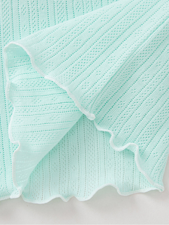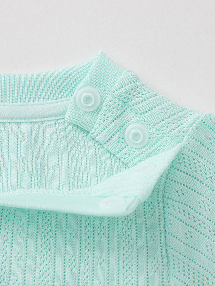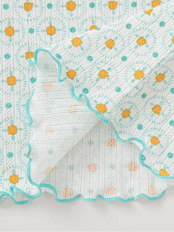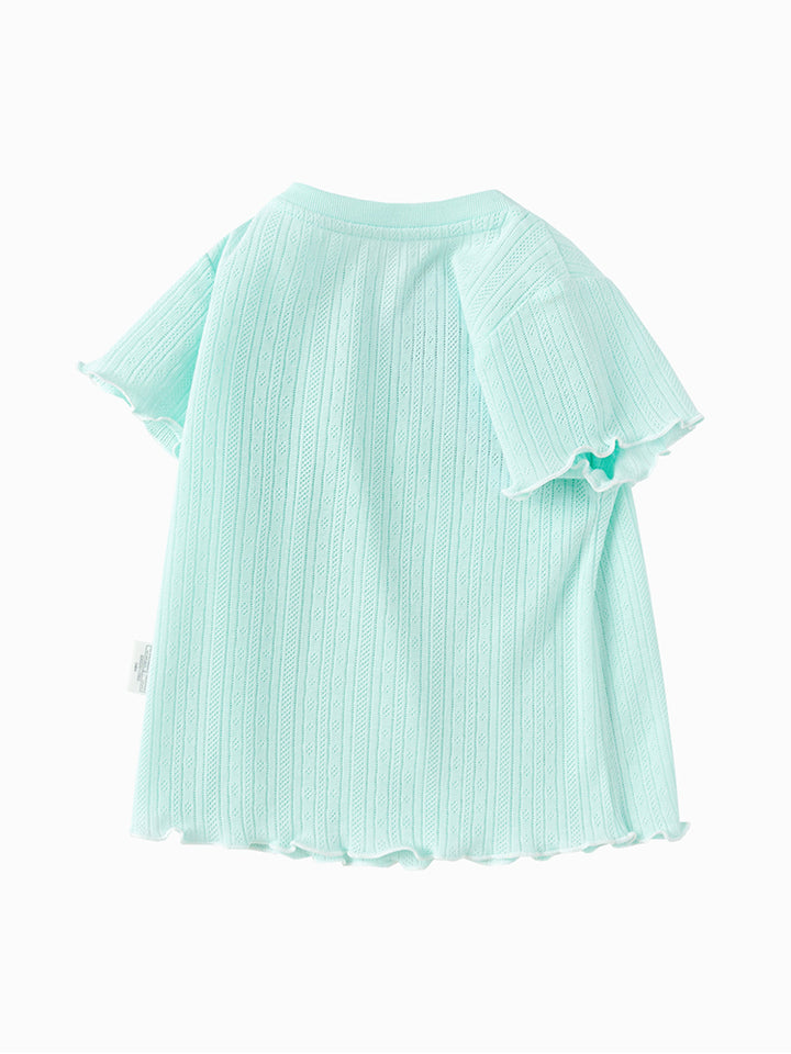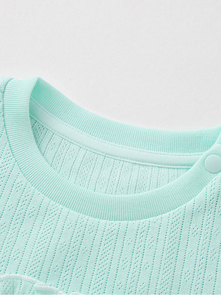 تيشيرت بأكمام قصيرة، مزين بنمط طبعات، يأتي بأزرار على أحد الأكتاف وبياقة مدورة الشكل
