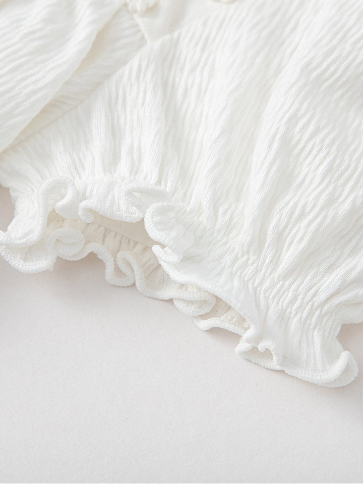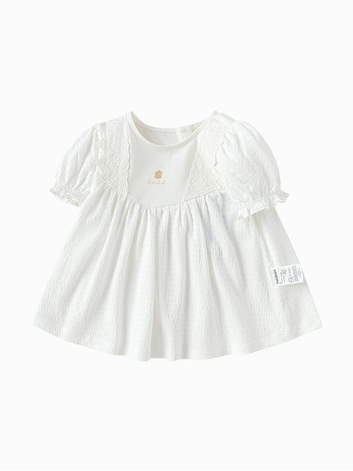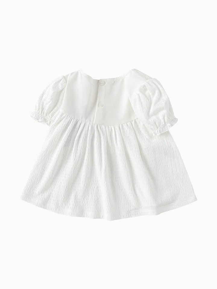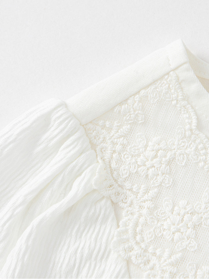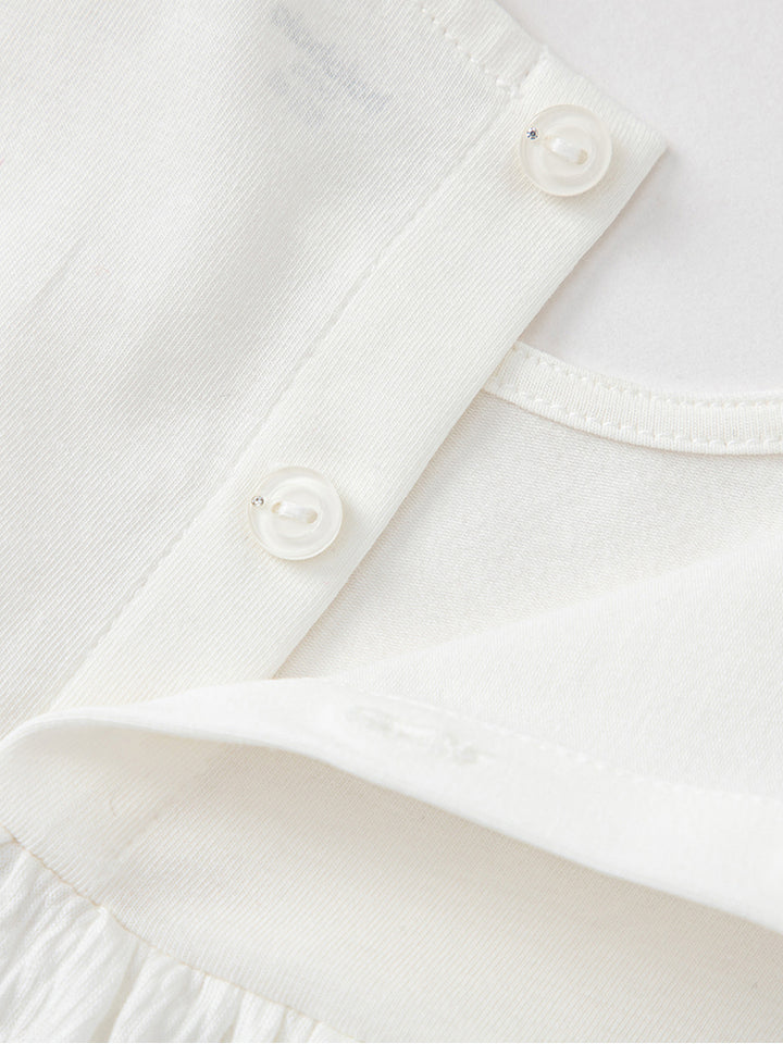 تيشيرت بأكمام قصيرة، مزين بتفاصيل مطرزة من الجهة الأمامية، يأتي بأزرار من الجهة الخلفية وبياقة مدورة الشكل