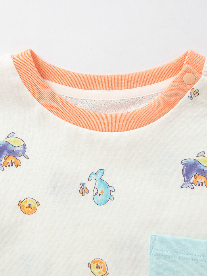تي شيرت طفل لطيف مع طباعة كاملة، جيب أمامي، وأزرار دفع على الكتف لسهولة الارتداء. الياقة الدائرية تضيف لمسة كلاسيكية.