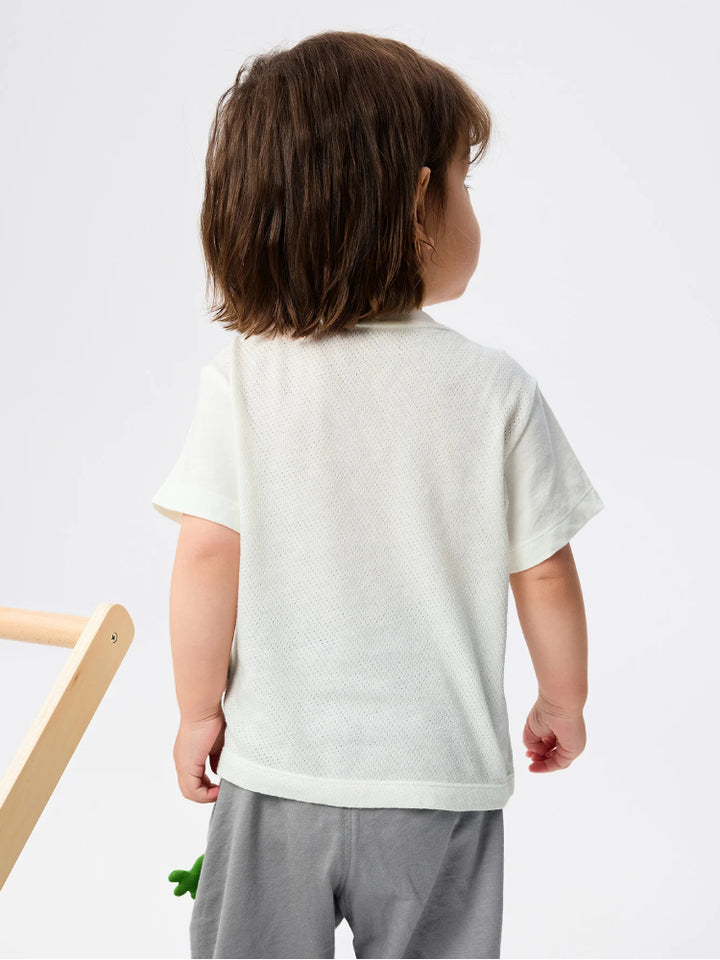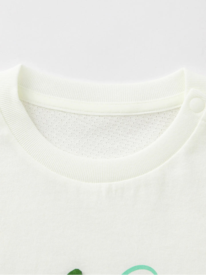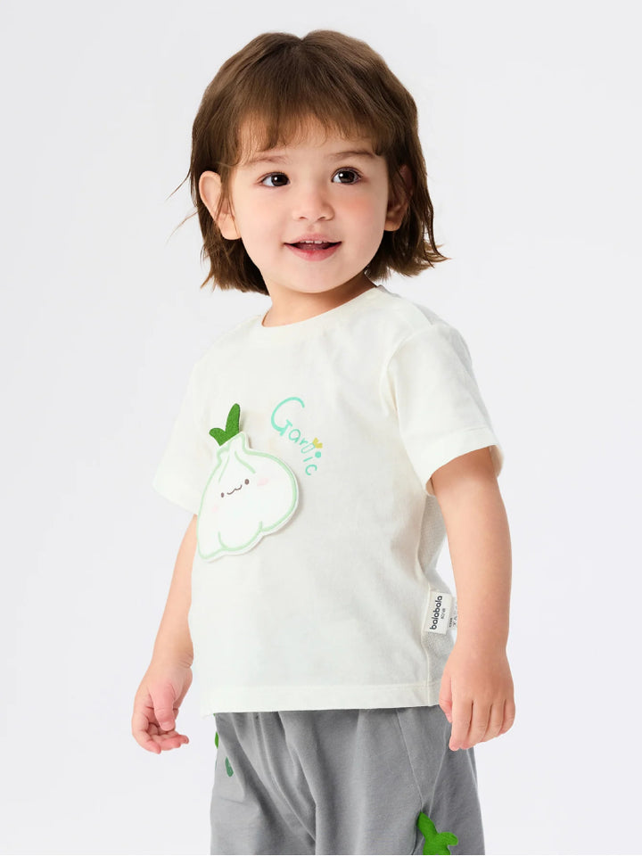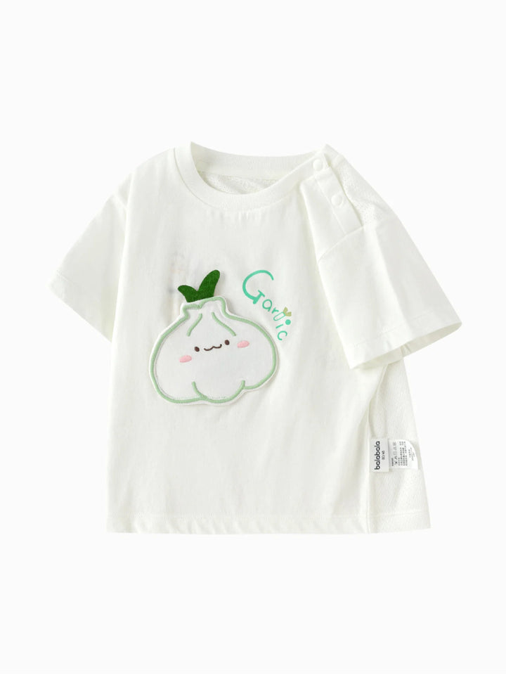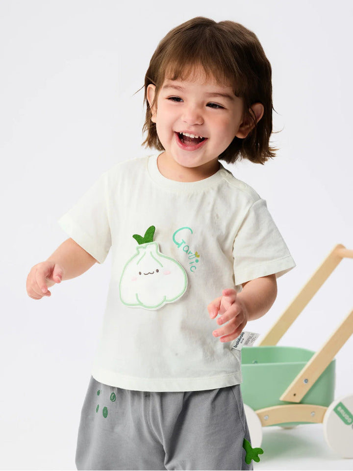 تيشيرت أطفال مصنوع من قطن ناعم مزين برسمة ثوم كرتونية مع تطريز أنيق. مزود بأزرار كبس على الكتف لسهولة اللبس وراحة طوال اليوم.