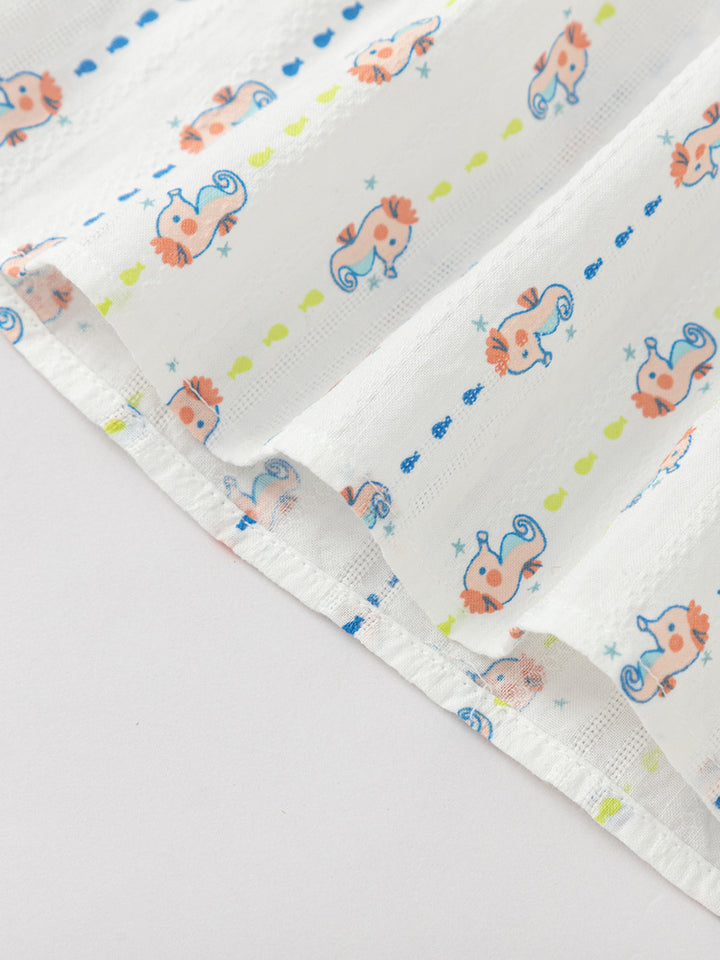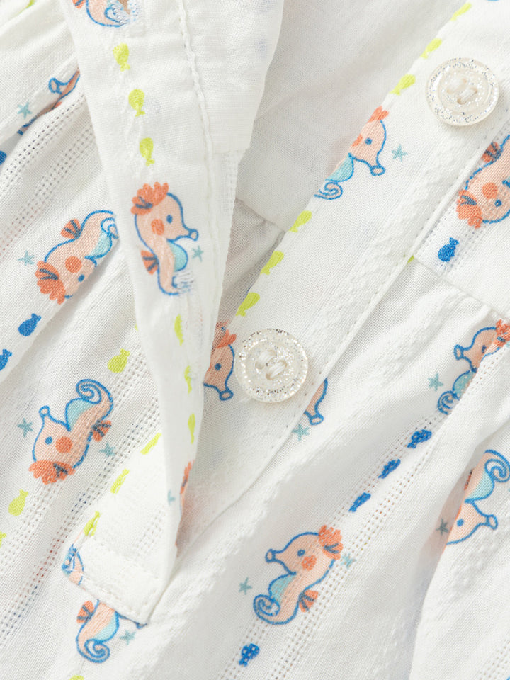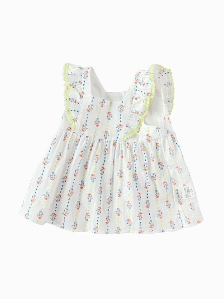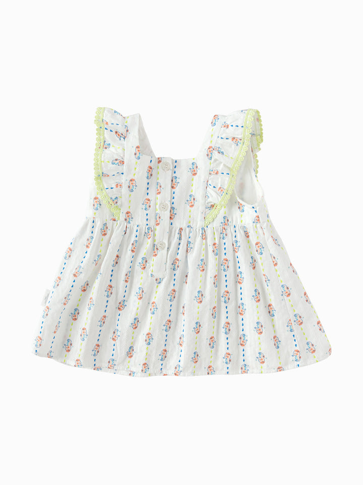 بلوزة طفل بدون أكمام مع طباعة كاملة وتفاصيل طيات. الإغلاق بأزرار خلفية والياقة المستقيمة تضيف لمسة مرتبة