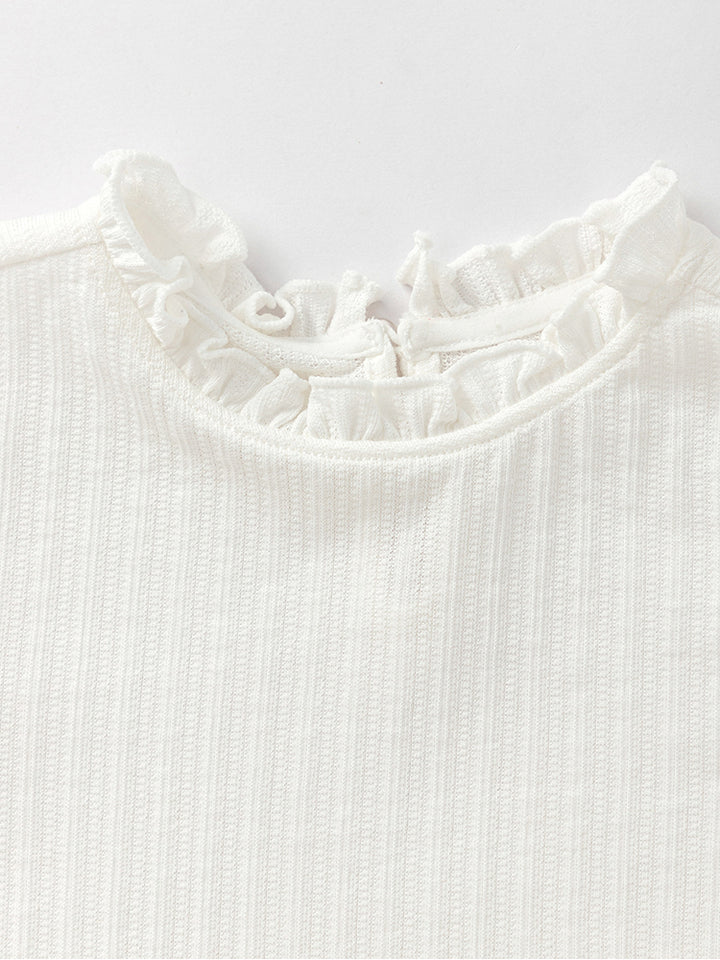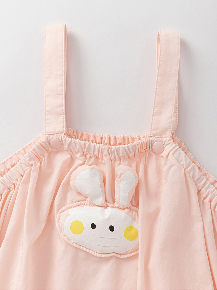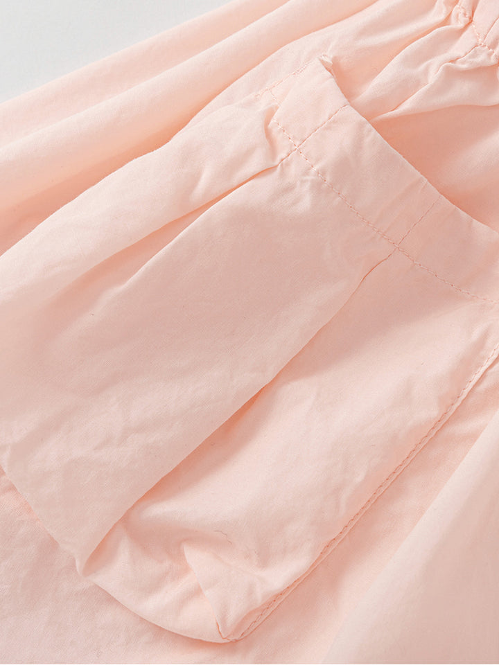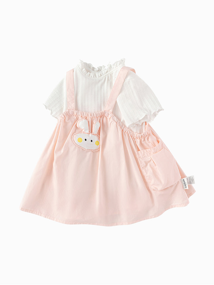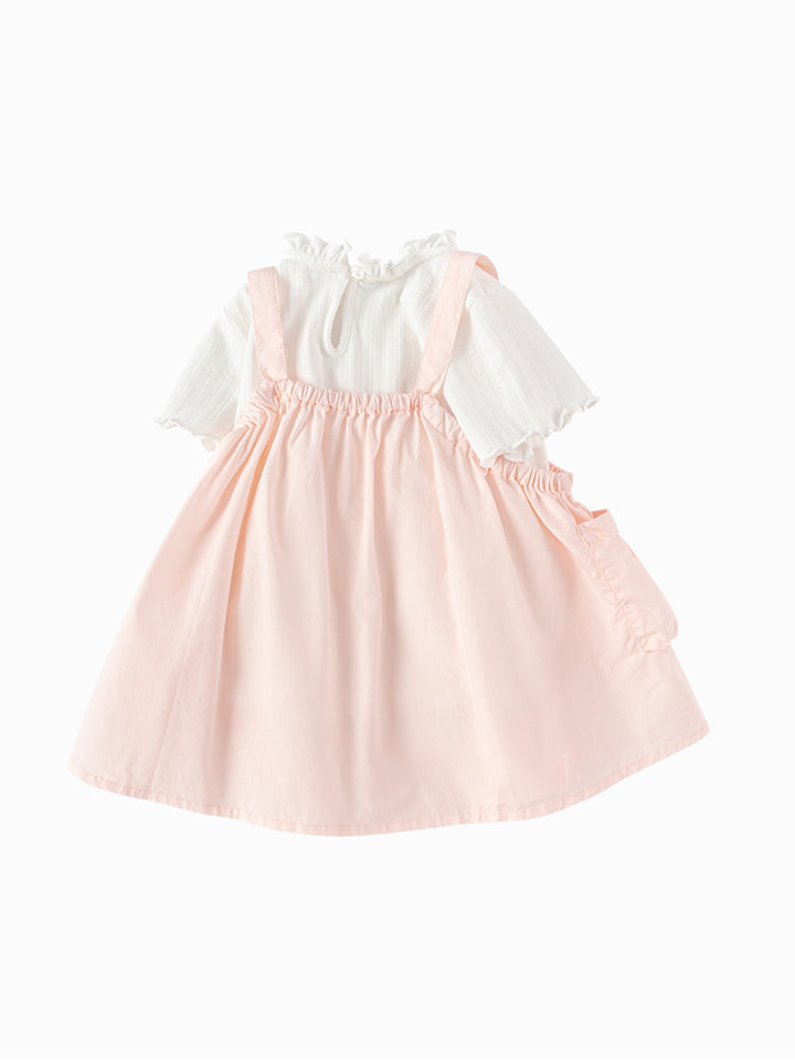 طقم فستان مكون من قطعتين، بلوزة بأكمام قصيرة ونمط لون موحد سادة، تأتي بزر خلفي وبياقة مدورة الشكل، وفستان فضفاض بدون أكمام وبحمالات كتف، مزين بتفاصيل رقعة من الجهة الأمامية ويأتي بجيوب جانبية
