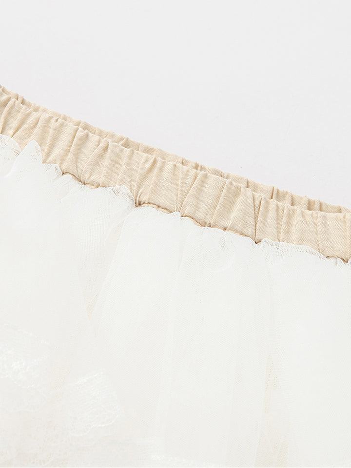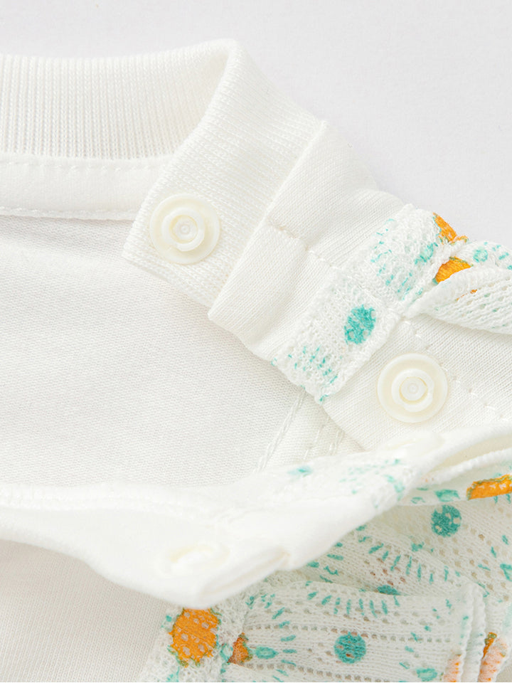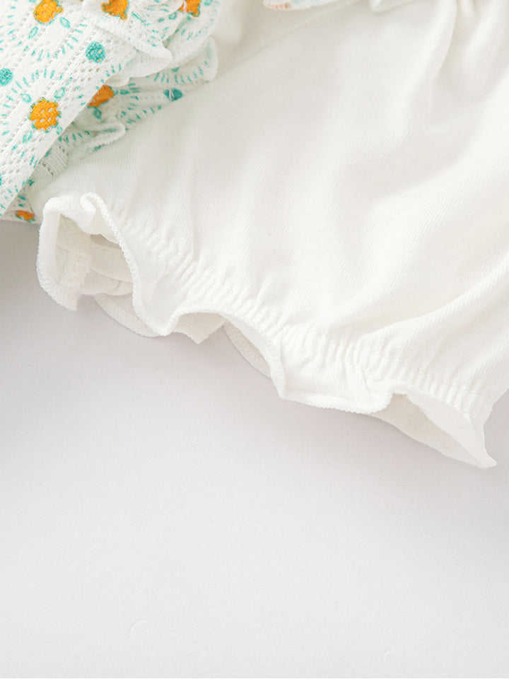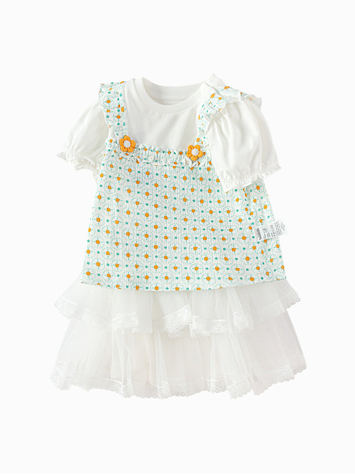 طقم بناتي مكون من قطعتين، بلوزة بأكمام قصيرة وبنمط طبعات، تأتي بأرار على أحد الأكتاف وبياقة مدورة الشكل، وتنورة بخامة تل ونمط لون موحد سادة، وتأتي بخصر مطاطي مريح
