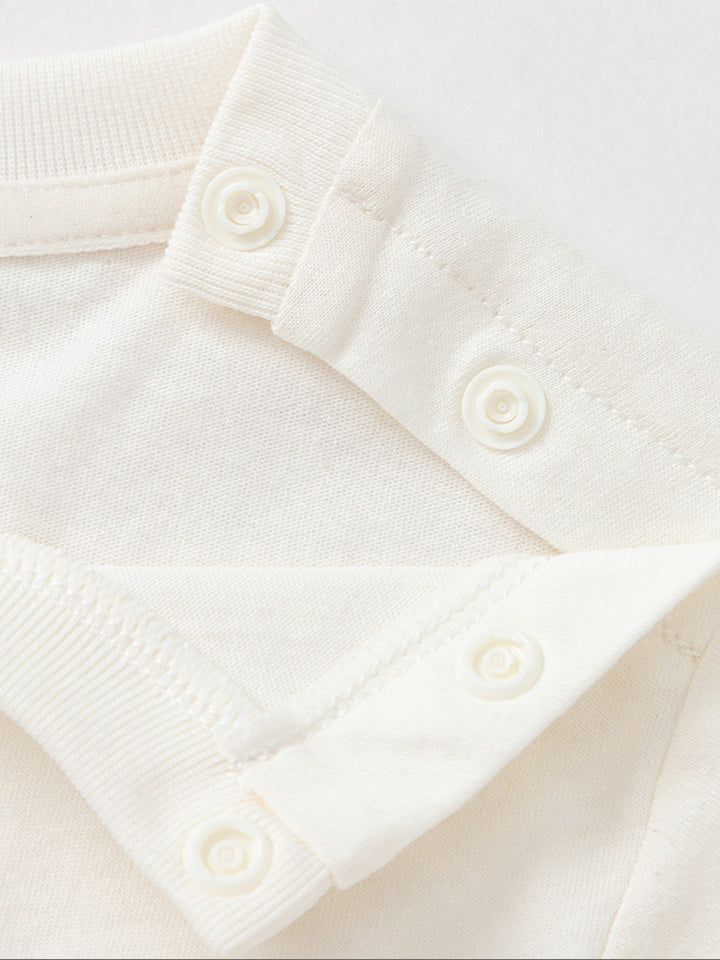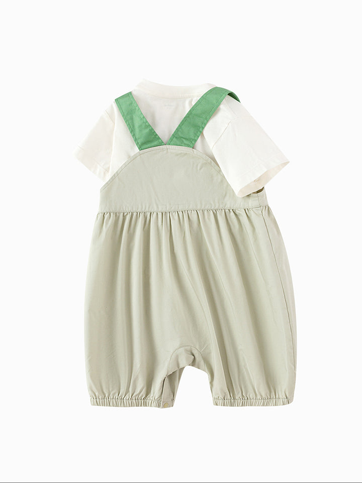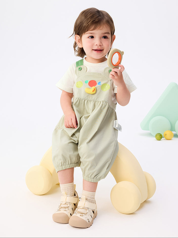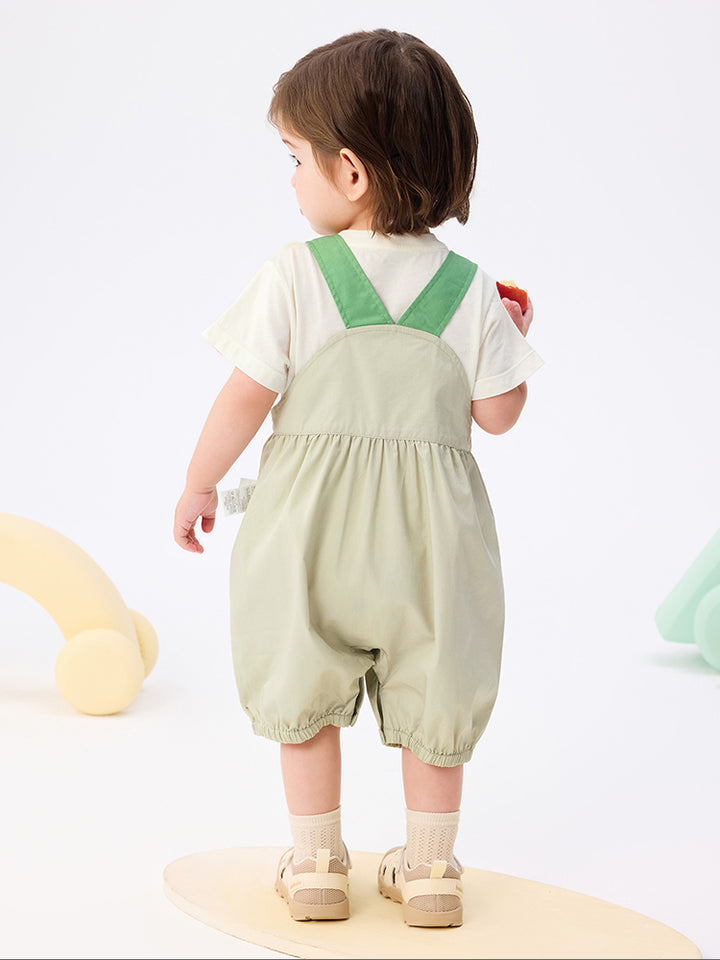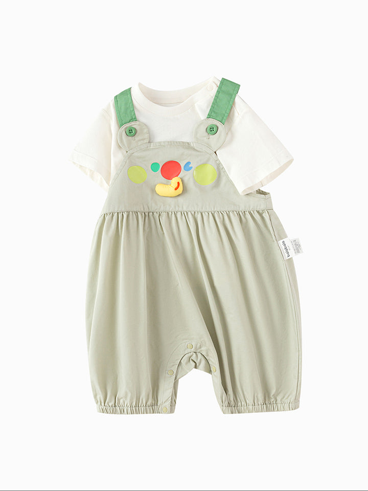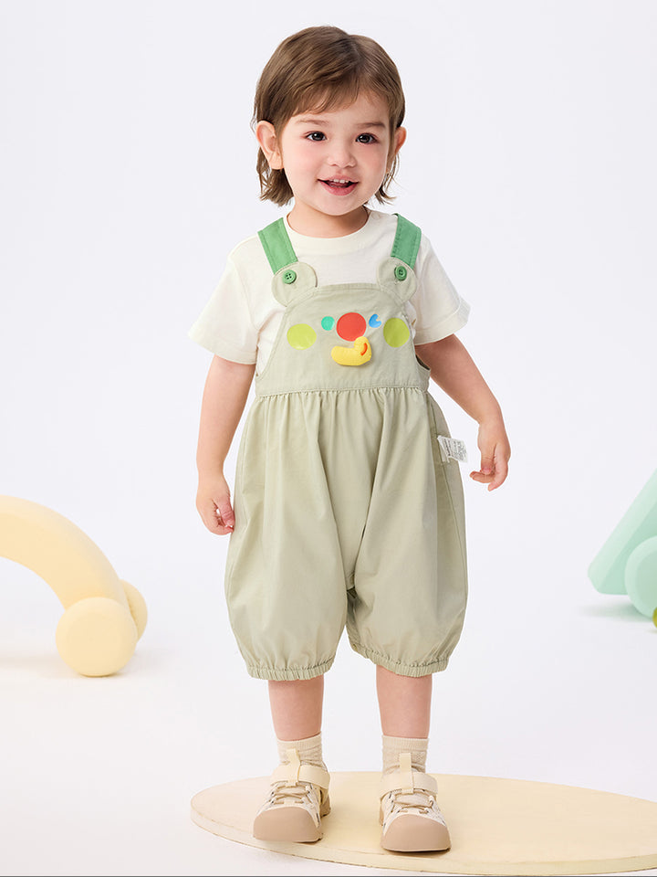 طقم أطفال مكون من قطعتين يتضمن توب بكم قصير بلون ثابت وياقة مدورة مع أزرار إغلاق على أحد الأكتاف. أما الدُنجري فيتميز بأربطة على الأكتاف، طباعة أمامية، تفاصيل مبطنة صغيرة، وأزرار إغلاق على الجانب السفلي، مما يجمع بين الراحة والأناقة لطفلك