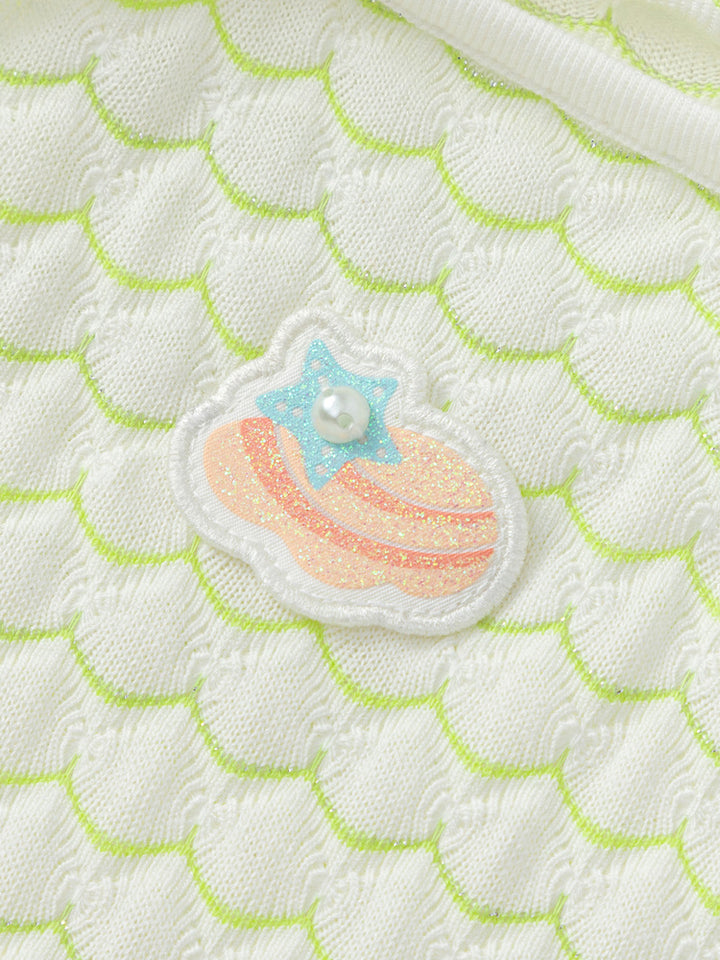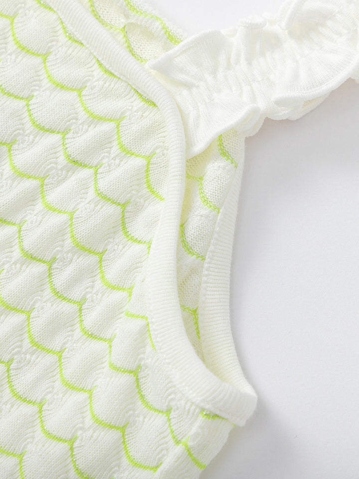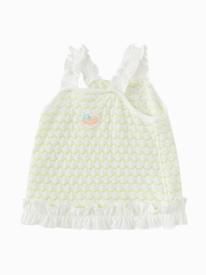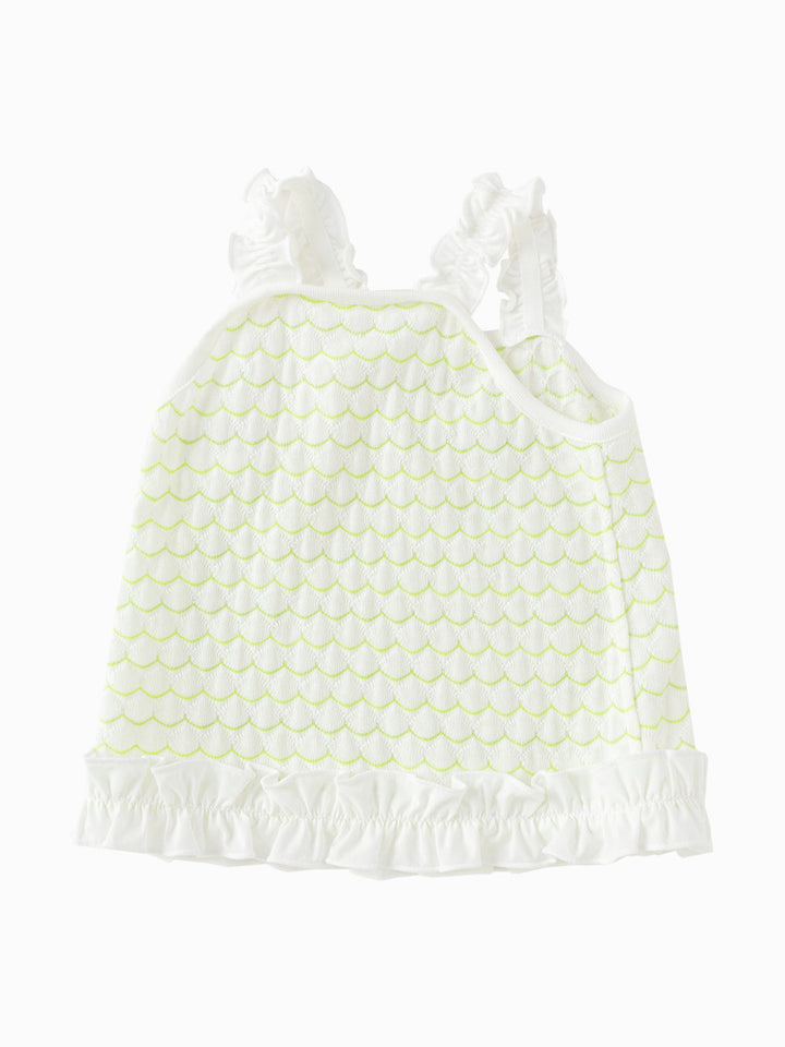 بلوزة طفل بدون أكمام مصنوعة من قماش محبوك مطبوع، مع طيات على الأكتاف وحواف طيات عريضة على الأسفل تضيف لمسة من الحلاوة. الياقة المستقيمة تكمل المظهر.