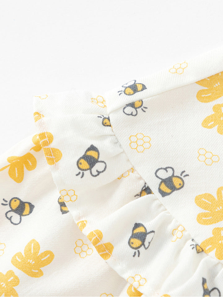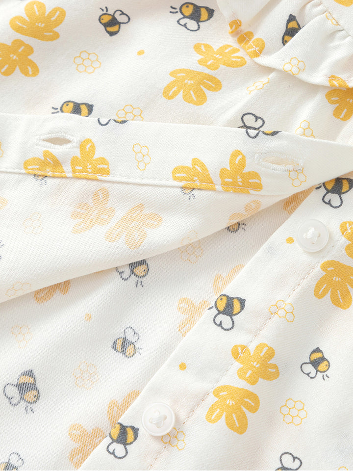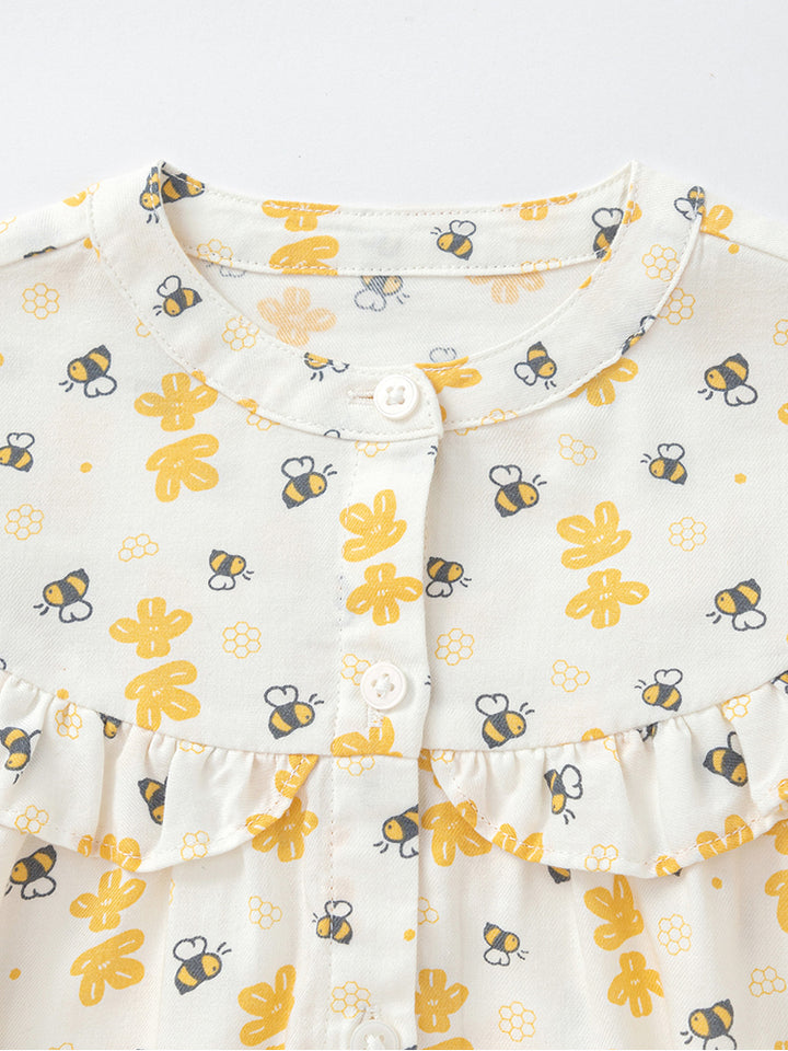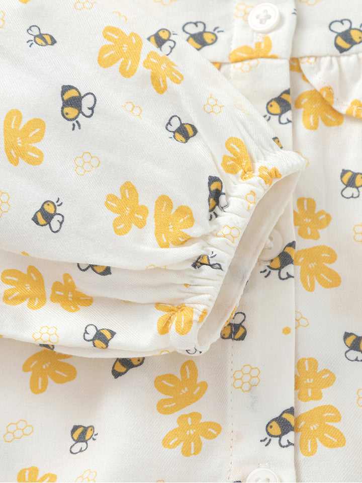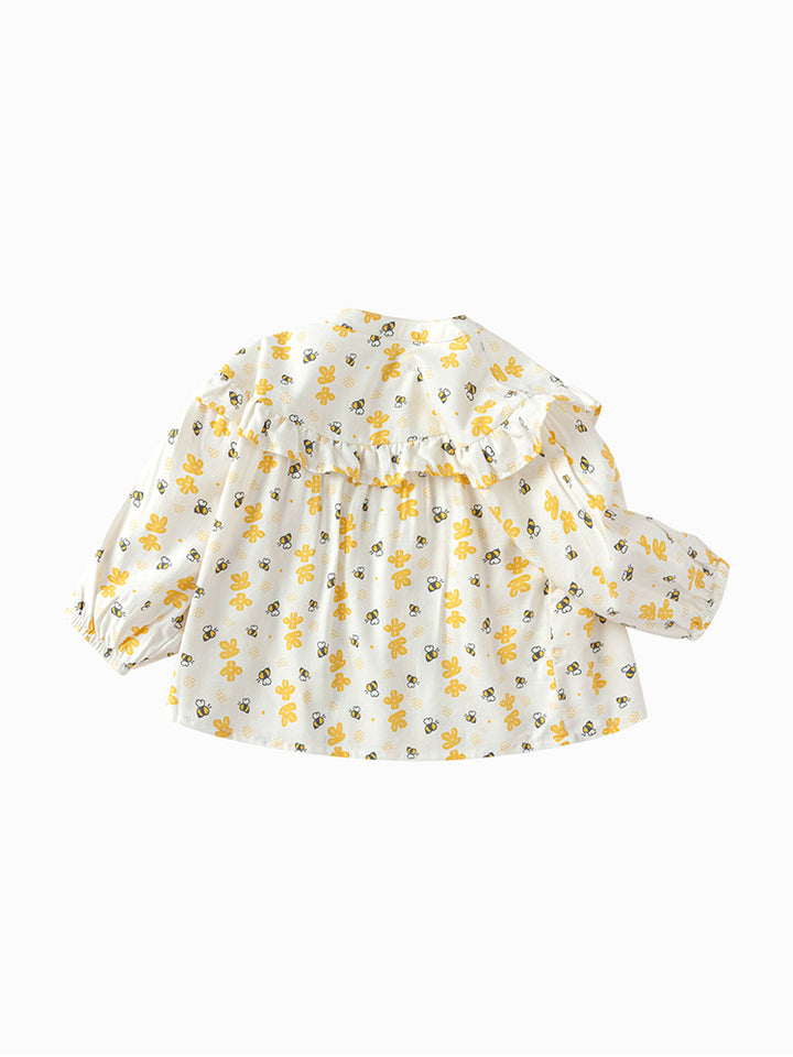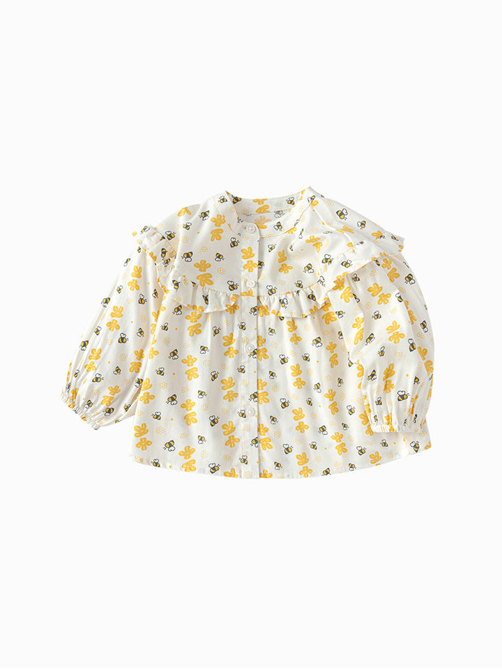 قميص بناتي بأكمام طويلة، مزين بنمط طبعات على كامل التصميم، يأتي بأزرار للإغلاق وبياقة مدورة